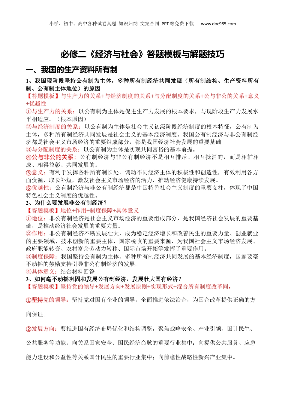 小学、初中、高中各种试卷真题知识归纳文案合同PPT等免费下载www.doc985.com必修二《经济与社会》答题模板与解题技巧一、我国的生产资料所有制1、我国现阶段坚持公有制为主体,多种所有制经济共同发展(所有制结构、生产资料所有制、公有制主体地位)的原因【答题模板】与生产力的关系+与经济制度的关系+与分配制度的关系+公与非公的关系+意义+优越性①与生产力的关系:以公有制为主体是促进生产力发展的根本要求,与现阶段生产力发展水平相适应。(根本原因)②与经济制度的关系:以公有制为主体是社会主义初级阶段经济制度的根本特征,公有制为主体,多种所有制经济共同发展是社会主义的基本经济制度。我国公有制经济与非公有制经济都是社会主义市场经济的重要组成部分,都是我国经济社会发展的重要基础。③与分配制度的关系:以公有制为主体是实现共同富裕的基本前提。④公与非公的关系:公有制经济与非公有制经济不是相互排斥、相互抵消的,而是相辅相成、相得益彰、共同发展的。⑤意义:有利于发挥各种所有制长处。调动不同经济主体的积极性和创造性,有效利用各方面资源,取长补短,激发社会主义市场经济的活力,推动经济健康持续发展。⑥优越性:公有制经济与非公有制经济都是中国特色社会主义制度的重要支柱,体现了中国特色社会主义制度的优越性。2、为什么要发展非公有制经济?【答题模板】地位+作用+制度保障+具体意义①地位:非公有制经济是社会主义市场经济的重要组成部分,是我国经济社会发展的重要基础,是推动经济社会发展的重要力量。②作用:非公有制经济不断发展壮大,成为稳定经济增长和改善民生的重要力量、创业就业的主要领域、技术创新的重要主体、国家税收的重要来源,为我国社会主义市场经济发展、政府职能转变、农村富余劳动力转移、国际市场开拓等发挥了重要作用。③制度保障:我国坚持公有制为主体、多种所有制经济共同发展的基本经济制度,国家要毫不动摇的鼓励支持引导非公有制经济的发展。④具体意义:结合材料回答3、如何毫不动摇巩固和发展公有制经济,发展壮大国有经济?【答题模板】坚持党的领导+发展方向+发展原则+实现形式+混合所有制度改革同,①坚持党的领导:坚持党对国有企业的领导,全面推进依法治企,为国企改革提供正确的方向保证。②发展方向:要推进国有经济布局优化和结构调整,聚焦战略安全、产业引领、国计民生、公共服务等功能。向关系国家安全、国民经济命脉的重要行业集中;向提供公共服务、应急能力建设和公益性等关系国计民生的重要行业集中;向前瞻性战略性新兴产业集中。小学、初中、高中各种试卷真题知识归纳文案合同PPT等免费下载www.doc985.com③发展原则:要深化国资国企改革。要以解放和发展社会生产力为标准。以提高国有资本效率、增强国有企业活力为中心。推动国有资本和国有企业做强做优做大,不断增强国有经济竞争力、创新力、控制力、影响力、抗风险能力。④实现形式:发展壮大国有经济,要探索公有制多种实现形式,完善中国特色现代企业制度。⑤混合所有制度改革:推进国有企业混合所有制改革,扩大国有资本支配范围,放大国有资本功能,提高国有资本的竞争力,有利于各种所有制资本取长补短、相互促进共同发展。4、如何毫不动摇巩固和发展公有制经济,发展壮大农村集体经济(乡村振兴)?【答题模板】改革经营制度+转变经营方式①改革经营制度:要深化农村土地制度改革,保障农民财产权益。②转变经营方式:要巩固和完善以家庭联产承包经营为基础、统分结合的双层经营体制的农村基本经营制度;发展新型农村集体经济;发展新型农业经营主体和农业社会化服务;发展农业适度规模经营。5、如何毫不动摇鼓励、支持、引导非公有制经济发展?【答题模板】社会环境+能力提升+人才培养(1)政策政府角度:(社会环境)①要培育更多充满活力的市场主体,营造支持非公有制经济高质量发展的制度环境;②营造各种所有制主体依法平等使用资源要素、公开公平公正参与竞争、同等受到法律保护市场环境;③要健全支持非公有制经济发展的法治环境,依法保护民营企业产权和企业家权益,贯彻落实包括市场准入、企业融资等在内的促...
