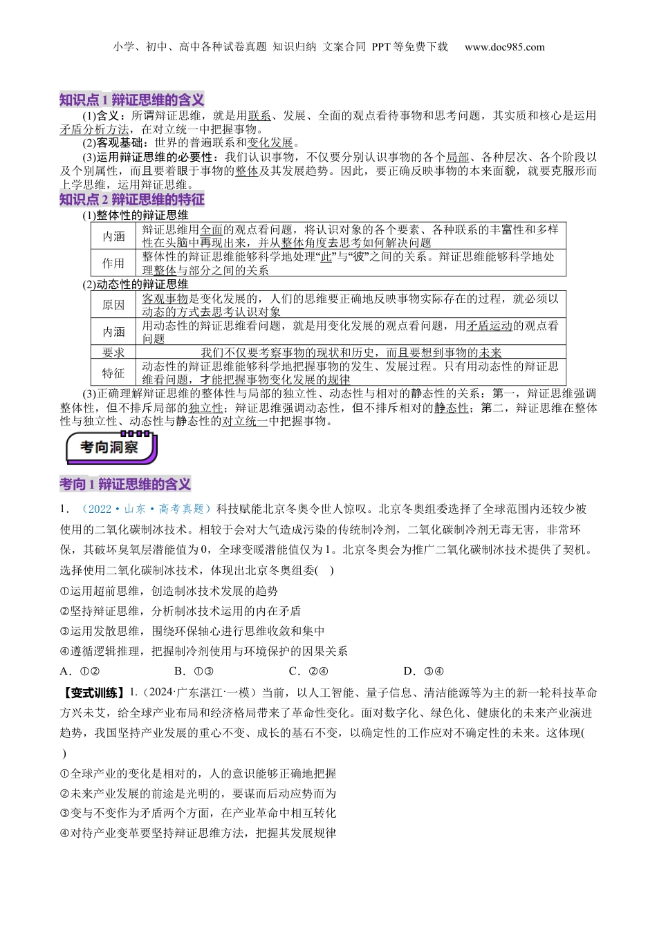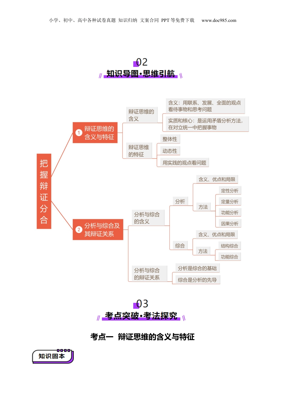 小学、初中、高中各种试卷真题知识归纳文案合同PPT等免费下载www.doc985.com第08课把握辩证分合目录01考情透视·目标导航...................................................................................................102知识导图·思维领航...................................................................................................203考点突破·考法探究...................................................................................................2考点一辩证思维的含义与特征.................................................................................................2知识点1辩证思维的含义.....................................................................................................3知识点2辩证思维的特征.....................................................................................................3考向1辩证思维的含义.........................................................................................................3考向2辩证思维的特征.........................................................................................................5考点二分析与综合及其辩证关系.............................................................................................6知识点1分析与综合的含义.................................................................................................6知识点2分析与综合的辩证关系.........................................................................................7考向1分析与综合的含义.....................................................................................................7考向2分析与综合的辩证关系.............................................................................................904真题练习·命题洞见.................................................................................................10考点要求考题统计备考建议辩证思维的含义与特征2024主观题:全国卷、新课标Ⅱ卷本讲选择题和主观题都有考查,复习时关注一些命题:理解辩证思维的含义与特征,能结合实际事例区分辩证思维的整体性与动态性特征;把握辩证思维与形而上学思维的本质区别;理解分析与综合的含义,能结合实际事例把握分析与综合的辩证统一关系,能够在实际生活中灵活运用分析与综合的方法,能够在解决实际问题中培养辩证思维能力。2023无2022选择题:山东卷、天津卷分析与综合及其辩证关系2024主观题:浙江卷2023主观题:辽宁卷2022无复习目标:1.结合对复杂事物的把握,体会辩证思维的特征2.理解分析与综合的辩证关系小学、初中、高中各种试卷真题知识归纳文案合同PPT等免费下载www.doc985.com考点一辩证思维的含义与特征小学、初中、高中各种试卷真题知识归纳文案合同PPT等免费下载www.doc985.com知识点1辩证思维的含义(1)含义:所辩证思维,就是用谓联系、发展、全面的观点看待事物和思考问题,其实质和核心是运用矛盾分析方法,在对立统一中把握事物。(2)客观基础:世界的普遍联系和变化发展。(3)运用辩证思维的必要性:我们认识事物,不仅要分别认识事物的各个局部、各种层次、各个阶段以及个别属性,而要着于事物的且眼整体及其发展趋势。因此,要正确反映事物的本来面,就要形而貌克服上学思维,运用辩证思维。知识点2辩证思维的特征(1)整体性的辩证思维内涵辩证思维用全面的观点看问题,将认识对象的各个要素、各种联系的丰性和多富样性在头中现出来,并从脑再整体角度思考如何解决问题去作用整体性的辩证思维能够科学地处理“此与之间的关系。辩证思维能够科学地处”“”彼理整体与部分之间的关系(2)动态性的辩证思维原因客观事物是变化发展的,人们的思维要正确地反映事物实际存在的过程,就必须以动态的方式思考认识对象去内涵用动态性的辩证思维看问题,就是用...