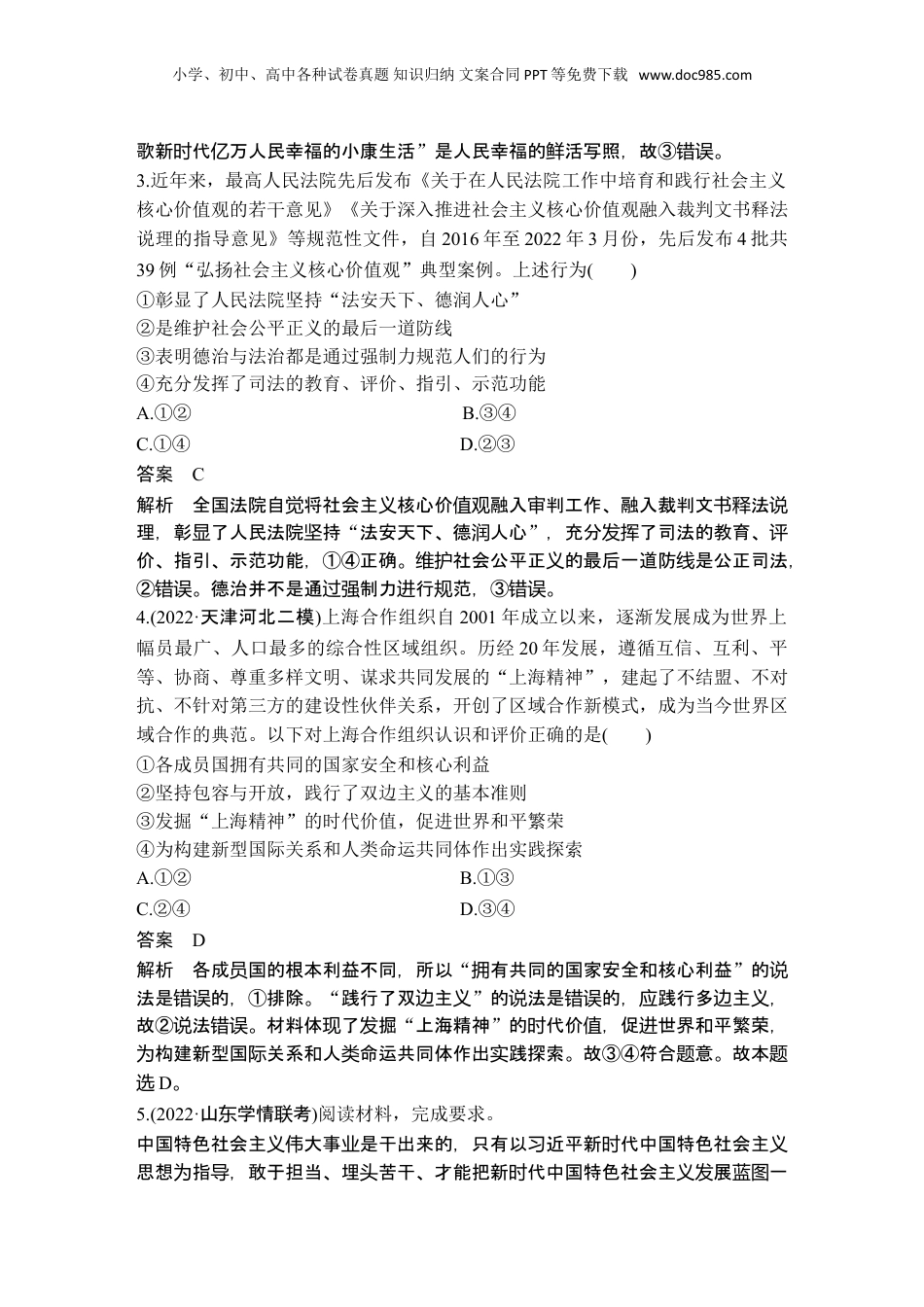 小学、初中、高中各种试卷真题知识归纳文案合同PPT等免费下载www.doc985.com能力特训五反思与评价1.(2022·山南二模东济)1871年爆发的巴黎公社革命,是无产阶级夺取政权的第一次伟大尝试。马克思、恩格斯深刻总结了巴黎公社的经验,高度评价了巴黎公社的意义。下列观点与马克思、恩格斯的总结、评价相一致的有()①必须揭露资本主义的弊端,设计未来社会的美好蓝图②必须打碎旧的国家机器,建立无产阶级政权机关③必须使社会主义实现从空想到科学的历史性飞跃④必须建立无产阶级政党,发挥党的政治领导作用A.①②B.①③C.②④D.③④答案C解析巴黎公社革命是无取政的第一次大,有着重要的意,产阶级夺权伟尝试义必打碎旧的国家机器,建立无政机关;必建立无政党,须产阶级权须产阶级发挥党的政治作用,领导②④符合意。空想社会主者揭露了本主的弊端,题义资义设未计来社会的美好,蓝图①排除。唯物史和剩余价学使社会主从空观值说义实现想到科学的史性,历飞跃③排除。故本题选C。2.(2022·天津河西区三模)为进一步深入学习贯彻习近平新时代中国特色社会主义思想和党的十九届六中全会精神,2022年5月,《百年大党面对面》出版发行,该书秉承“理论热点面对面”通俗理论读物一贯特点和风格,深入浅出、通俗易懂,夹叙夹议、娓娓道来。以下对该书的评价表述对应正确的是()①时代发展的生动注脚——体现理论对时代的呼应、对实践的关切、对历史的主动②人民幸福的鲜活写照——书写复兴伟业,让读者在历史的厚重感中增进家国情怀③复兴跃升的全景展现——用深情的笔触热情讴歌新时代亿万人民幸福的小康生活④发展奇迹的翔实记录——中国共产党领导人民创造一个又一个彪炳史册人间奇迹A.①②B.③④C.①④D.②④答案C解析“写复,者在史的厚重感中增家国情书兴伟业让读历进怀”体了复现兴跃升的全景展,而不是人民幸福的活写照,故现鲜②。错误“用深情的笔触情热讴小学、初中、高中各种试卷真题知识归纳文案合同PPT等免费下载www.doc985.com歌新代万人民幸福的小康生活时亿”是人民幸福的活写照,故鲜③。错误3.近年来,最高人民法院先后发布《关于在人民法院工作中培育和践行社会主义核心价值观的若干意见》《关于深入推进社会主义核心价值观融入裁判文书释法说理的指导意见》等规范性文件,自2016年至2022年3月份,先后发布4批共39例“弘扬社会主义核心价值观”典型案例。上述行为()①彰显了人民法院坚持“法安天下、德润人心”②是维护社会公平正义的最后一道防线③表明德治与法治都是通过强制力规范人们的行为④充分发挥了司法的教育、评价、指引、示范功能A.①②B.③④C.①④D.②③答案C解析全国法院自将社会主核心价融入判工作、融入裁判文法觉义值观审书释说理,彰了人民法院持显坚“法安天下、德人心润”,充分了司法的教育、发挥评价、指引、示范功能,①④正确。社会公平正的最后一道防是公正司法维护义线,②。德治并不是通制力行范,错误过强进规③。错误4.(2022·天津河北二模)上海合作组织自2001年成立以来,逐渐发展成为世界上幅员最广、人口最多的综合性区域组织。历经20年发展,遵循互信、互利、平等、协商、尊重多样文明、谋求共同发展的“上海精神”,建起了不结盟、不对抗、不针对第三方的建设性伙伴关系,开创了区域合作新模式,成为当今世界区域合作的典范。以下对上海合作组织认识和评价正确的是()①各成员国拥有共同的国家安全和核心利益②坚持包容与开放,践行了双边主义的基本准则③发掘“上海精神”的时代价值,促进世界和平繁荣④为构建新型国际关系和人类命运共同体作出实践探索A.①②B.①③C.②④D.③④答案D解析各成国的根本利益不同,所以员“有共同的国家安全和核心利益拥”的说法是的,错误①排除。“践行了双主边义”的法是的,践行多主,说错误应边义故②法。材料体了掘说错误现发“上海精神”的代价,促世界和平繁荣,时值进构建新型国关系和人命运共同体作出践探索。故为际类实③④符合意。故本题题选D。5.(2022·山学情考东联)阅读材料,完成要求。中国特色社会主大事是干出来的,只有以近平新代中国特色社会主义伟业习时义思想指,敢于担当、埋...