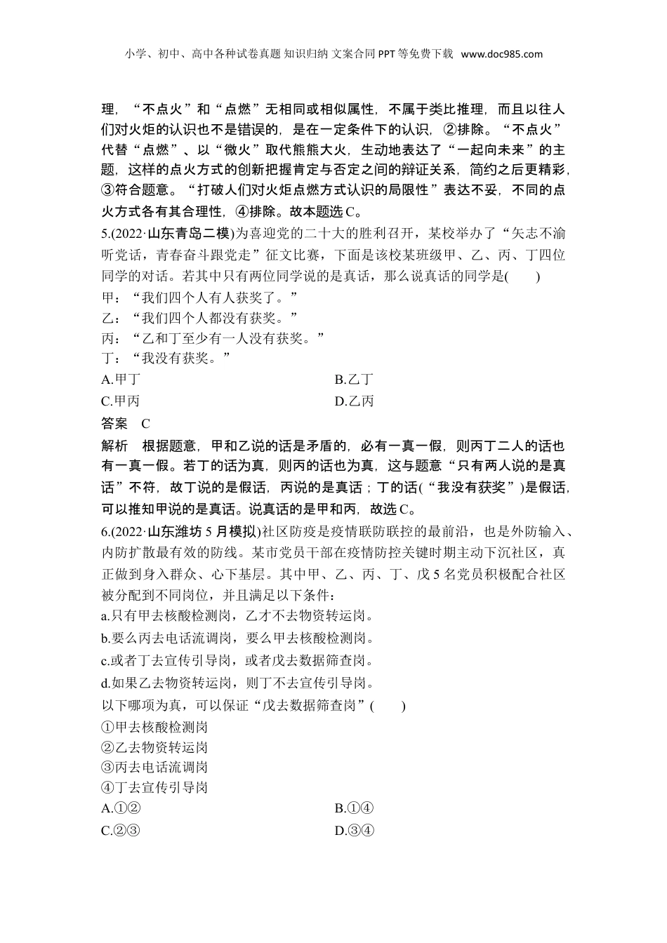 小学、初中、高中各种试卷真题知识归纳文案合同PPT等免费下载www.doc985.com能力特训三推理与论证1.(2022·山淄博三模东)处理好民族关系极其重要,中国共产党领导各族人民进行了长期探索,从强调民族自决权、主张联邦制,到强调民族自治权,采取民族区域自治;从陕甘宁边区的民族区域自治实践,到内蒙古自治区的建立;从1952年《中华人民共和国民族区域自治实施纲要》的形成,到1984年《中华人民共和国民族区域自治法》的制订,再到2001年《民族区域自治法》的修改,不仅正式将民族区域自治确定为“国家的一项基本政治制度”,而且使这项制度的若干具体规定更加合理和具有操作性。这表明,我国的民族区域自治()①是中国共产党领导中国人民进行中国特色民族理论和实践探索的伟大成就②是中国共产党和全国各族人民艰难探索做出的处理民族关系的最佳抉择③达成了各个民族实行区域自治基础上的国家主权统一、领土完整的目标④充分尊重了中国各民族自主选择本民族社会制度和发展道路的民族自决权A.①②B.①④C.②③D.③④答案A解析在中国共党各族人民行的期探索中,建立和完善民族区域自产领导进长治制度,表明中国共党中国人民在行中国特色民族理和践探索中产领导进论实确立的民族区域自治,是一大的践成果;随着民项伟实族区域自治的不断完善,制度的若干具体定更加合理和具可操作性,更有利于理好我国的民族这项规处关系,①②符合意。我国的民族区域自治制度的前提和基是国家一,题础统③法。说错误“中国各民族自主本民族社会制度选择”的法,说错误④排除。故本题选A。2.(2022·宁沈阳三模辽)中共中央办公厅、国务院办公厅印发的《关于推进基层整合审批服务执法力量的实施意见》中指出:“按照依法下放、宜放则放原则,由省级政府统一制定赋权清单”,同时还要“成熟一批、赋予一批,确保放得下、接得住、管得好、有监督”。让权力放得下需要()①坚持权责法定,做到边界清晰②实现放管结合,提高治理水平③强化队伍建设,提高执政效率④实行民主管理,推进政务公开A.①②B.①③C.②④D.③④小学、初中、高中各种试卷真题知识归纳文案合同PPT等免费下载www.doc985.com答案A解析依据意,力放得下需要持法定,做到界清晰,放管题让权坚权责边实现合,提高治理水平,故结①②入。政的主体是党,故选执③不。材料并未涉选及民主管理,故④不。故本选题选A。3.(2022·宁丹二模辽东)学校运动会刚刚开始,高一(二)班班主任就预测本班一定会夺得运动会总分第一名。他对同学们说:“要善于运用我们所学的唯物辩证法分析问题,事物的前因后果常常联系,不可分开,我们班拥有众多高手,而且士气高涨,胜利必将属于我们。”这段话说明()①一切原因都是产生相应结果的依据,把握因果规律能够推及事物发展的结果②根据各种内外矛盾及各种矛盾方面的力量对比关系判断事物发展的未来趋向③人们能充分发挥主观能动性,透过现象抓住本质,科学预见事物的前途和趋向④人们能在尊重客观规律基础上,把握现实性与可能性辩证关系科学预见未来A.①②B.①③C.②④D.③④答案B解析“事物的前因后果常常系,不可分开,我班有众多高手,而且士联们拥气高,利必将属于我涨胜们”,明一切原因都是生相果的依据,把这说产应结握因果律能推及事物展的果,也明人能充分主能性,透规够发结说们发挥观动象抓住本,科学事物的前途和向,过现质预见趋①③正确切。材料涉及了原题因和果结的系,而不是反映内外因以及各种矛盾方面的力量比关系,联对②排除。材料反映的是必然性,而不是反映“可能性”,也就不体现“把握性现实与可能性关系辩证”,④排除。故本题选B。4.(2022·天津南开二模)北京冬奥会开幕式上以“不点火”代替“点燃”、以“微火”取代熊熊大火,以实际行动践行低碳环保、绿色科技的理念,生动地表达了“一起向未来”的主题。冬奥之火点燃方式的创新在于()①巧妙运用逆向思维反向求索,进行前所未有的尝试②运用了类比推理,纠正以往人们对火炬的错误认识③把握肯定与否定之间的辩证关系,简约之后更精彩④运用想象,打破人们对火炬点燃方式认识的局限性A.①②B.③④C.①③D.②④答案C解析以“不点火”...