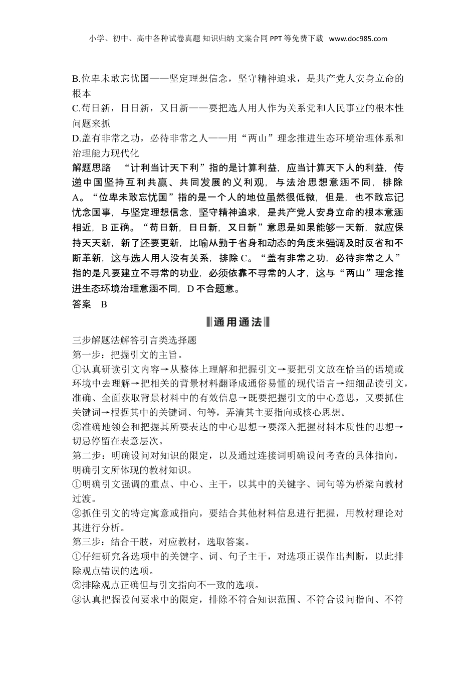 小学、初中、高中各种试卷真题知识归纳文案合同PPT等免费下载www.doc985.com题型三引言类选择题[题型解读]引言类选择题一般以名人名言、成语、俗语、国家政策文件中的片段、经典著作中的论断特别是党和国家领导人的重要讲话为素材,要求考生分析其中蕴含的经济、政治、文化和哲学等道理。此类试题主要包括两种形式:一类是借助名言,考查教材理论知识;另一类是运用教材理论知识,分析名言名句。【典例1】(2022·山卷,东1)马克思认为,在未来的社会主义制度中,社会生产力的发展将如此迅速,生产将以所有人的富裕为目的。习近平指出,共同富裕是全体人民共同富裕,是人民群众物质生活和精神生活都富裕,不是少数人的富裕,也不是整齐划一的平均主义。关于共同富裕,下列理解正确的是()A.消除社会基本矛盾是实现共同富裕的必由之路B.建设高福利国家是实现共同富裕的根本路径C.促进共同富裕和促进人的全面发展是高度统一的D.共同富裕会随社会生产力的迅速发展而自发实现解题思路社会基本矛盾穿人社会始,贯类终“消除社会基本矛盾”表述错误,故A排除。国家的福利水平与国家社会展相适,建高福利国家应该经济发应设如果不与国家社会展相适,反而不利于共同富裕,因此经济发应实现B的选项法,排除。共同富裕是全体人民共同富裕,是人民群众物生活和精神说错误质生活都富裕,促人民共同富裕,有助于促人的全面展,而促人的全面进进发进展也有助于共同富裕。促共同富裕和促人的全面展是高度一的发实现进进发统,故C符合意。共同富裕的,离不开生力的迅速展,但不会自题实现产发发实现,需要加国家宏控。故强观调D排除。答案C【典例2】(2022·山沂二模东临)恩格斯说:“历史是这样创造的:最终的结果总是从许多单个的意志的相互冲突中产生出来的,而其中每一个意志,又是由于许多特殊的生活条件,才成为他所成为的那样”“这样就有无数互相交错的力量,有无数个力的平行四边形,由此就产生出一个合力,即历史结果”。上述论断表明()①社会发展的动因在于无数人的共同意志②每个人都在历史发展过程中起一定作用③人民群众是历史活动的组织者和领导者小学、初中、高中各种试卷真题知识归纳文案合同PPT等免费下载www.doc985.com④社会发展像自然一样也有自己的客观规律A.①②B.①③C.②④D.③④解题思路恩格斯的多个的意志和无数个力是指社会中的每一个人,说许单历史的造离不开每个人。有无数个力的平行四形,由此生出一个合力,即创边产史果,明了社会的展有自己的固有律,不以人的意志移。故历结这说发规为转②④符合意。人社会的展是在生力和生关系、基和上建筑题类发产产经济础层的矛盾运动中,在社会基本矛盾的不断解决中的,故实现①。人民群众是错误造史的主体,而杰出人物往往是史活的者和者,故创历历动组织领导③。错误答案C【典例3】(2022·山青二模东岛)“见出以知入,观往以知来。”一个国家、一个民族要振兴,就必须在历史前进的逻辑中前进、在时代发展的潮流中发展,各国人民更需要团结协作、共克时艰,在把握经济全球化发展大势中,推动人类走向更加美好的未来。下列诗句与上述材料蕴含的哲理一致的是()①横看成岭侧成峰,远近高低各不同②同舟共济扬帆起,乘风破浪万里航③沉舟侧畔千帆过,病树前头万木春④纸上得来终觉浅,绝知此事要躬行A.①②B.①④C.②③D.③④解题思路一个国家、一个民族要振,就必在史前的中前、在兴须历进逻辑进代展的潮流中展,体了展;各国人民更需要作、共克时发发现发观团结协时艰,在把握全球化展大中,推人走向更加美好的未来,了需经济发势动类这强调要一心的道理,体了整体与部分的关系。团结现“同舟共帆起,乘破浪万济扬风里航”意思是心力才能披棘,才能一切困,体了整体与部齐协荆斩够战胜难现分的关系,故②正确。“沉舟畔千帆,病前万木春侧过树头”的意思是:沉舟畔,有千帆;病前,正万木皆春,体的哲理是事物是不断展侧竞发树头现总发化的,新事物将代替旧事物,事物展的前途是光明的,故变终发③正确。“横看成岭成峰,近高低各不同侧远”体的是不同角度,点不一,与材料无现观样关,故①不。选“上得来浅,知此事要躬行纸终觉...