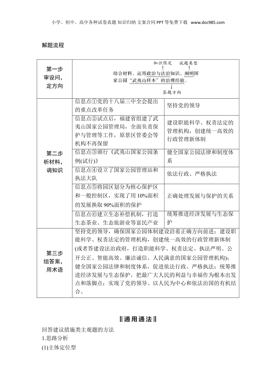 小学、初中、高中各种试卷真题知识归纳文案合同PPT等免费下载www.doc985.com题型六建议措施类主观题[题型解读]此类试题的设问一般以“措施”“建议”“要求”“如何”“启示”等词语为题眼,要求学生针对有关问题提出相应的解决措施或正确做法。材料信息一般是展示某地、某事存在一系列问题,然后问如何解决(如措施、对策、建议、办法等);或者是展示某地、某人成功的事例,问怎么取得成功的(如经验、因素以及给我们什么启示等)。此类题目的设问一般都给出确定的主体,如党、国家、政府、公民、企业、消费者、个人等,并且指定了要回答的某一方面的知识。如果未给出主体,要考虑周全相应的主体。【典例】(2022·山卷,东16)①建立国家公园体制是党的十八届三中全会提出的重点改革任务。2016年,武夷山被列我国首批为10国家公园体制点之一,处试国家公园“武夷山本样”的探索之路由此开启。点前,区域内存在自然保区、水种植源保区等试护产资护5种型保地,分类护属林、水利等部及地方政府管,面保和展矛盾突出等。业门辖还临护发问题②点后,福建省建了武夷山国家公园管理局,全面国家公园内自然、试组负责人文源和生境的保与管理等工作,原景区管委会等机构不再保留;资态环护③行了《武夷山国家公园条例颁(行试)》;④立了国家公园管理站设(站由所在长地兼任乡镇长)和法大;执队⑤将园区划分核心保区和一般控制区,了为护实现用10%面的展取积发换90%面的保;积护⑥建立生机制,打造生茶态补偿态业、生旅游等富民,了机制活、、百姓富、生美。态业产业实现产业优态2021年10月,近平在《生物多性公》第十五次方大会人峰会上习样约缔约领导宣布,中国正式立武夷山等第一批国家公园。设结合材料,运用政治与法治知识,阐明国家公园“武夷山样本”的治理经验。小学、初中、高中各种试卷真题知识归纳文案合同PPT等免费下载www.doc985.com解题流程第一步审设问,定方向第二步析材料,调知识信息点①党的十八届三中全会提出的重点改革任务坚持党的领导信息点②试点后,福建省组建了武夷山国家公园管理局,全面负责保护与管理等工作,原景区管委会等机构不再保留建设职能科学、权责法定的管理机构,创建统一高效的行政管理新体制信息点③颁行《武夷山国家公园条例(试行)》健全国家公园法律和制度体系信息点④设立了国家公园管理站和执法大队依法行政、严格执法信息点⑤将园区划分为核心保护区和一般控制区,实现了用10%面积的发展换取90%面积的保护正确处理发展与保护的关系信息点⑥建立生态补偿机制,打造生态茶业、生态旅游业等富民产业统筹推进经济发展与生态保护第三步组答案,用术语坚持党的领导,确保国家公园体制建设沿着正确方向前进;建设职能科学、权责法定的管理机构,创建统一高效的行政管理新体制(或者答建设法治政府,打造职能科学、权责法定、执法严明、公开公正、智能高效、廉洁诚信、人民满意的国家公园管理机构);健全国家公园法律和制度体系,促进依法行政、严格执法;统筹推进经济发展与生态保护,把最广大人民的利益与幸福作为根本出发点和落脚点;实现了党的领导、以人民为中心和依法治国的有机结合。回答建议措施类主观题的方法1.思路分析(1)主体定位型小学、初中、高中各种试卷真题知识归纳文案合同PPT等免费下载www.doc985.com①明确设问主体→找出设问涉及的主体,构建知识体系②找出材料依据→明确主体在材料中相关措施或与材料相关的信息③把握知识指向→依据主体和材料信息,找出相关知识(2)知识明确型①明确知识指向→依据设问中的知识要求,构建相应的知识体系②以知识找材料→根据知识体系,寻找材料中的依据③以材料定知识→融合材料与知识,组织答案(3)材料体现型①明确措施指向→找出设问所要分析的具体行为②找出材料信息→找出与行为相关的具体措施信息③明确知识依据→依据材料信息,明确知识依据2.答案组织①分析材料找措施。审读设问和材料,明确设问和材料所包含的关键信息,看材料中反映的问题或成功的做法,提出措施。②对接课本找措施。结合设问的知识限定范围寻找相应的做法措施。③落实主体找措施。考虑不同的主体在解决某一问题中负有怎样...