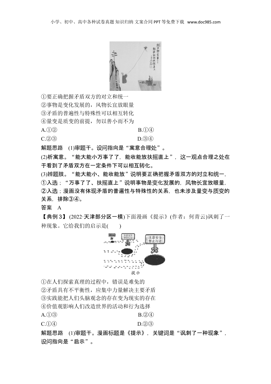 小学、初中、高中各种试卷真题知识归纳文案合同PPT等免费下载www.doc985.com题型二漫画类选择题[题型解读]此类试题是一种融知识、能力和情感觉悟为一体的题型。题肢部分一般有两种类型:单项型题肢和复合型题肢。设问方式十分简练,侧重于结合漫画回答所获得的启示、警示、如何做、选项与漫画蕴含的哲理相一致等。【典例1】(2022·山青二模东岛)漫画“同一扇窗户,向上看是风景,向下看是泥土”包含的哲学道理有()①主观能动性的发挥受客观条件制约②主体对客体的反映具有自觉选择性③意识的内容随人们选择的变化而变化④人们对事物的认识受主观因素的影响A.①③B.①④C.②③D.②④解题思路(1)干。漫画是审题标题“同一扇窗,向上看是景,向下看是泥户风土”,指向是设问“包含的哲学道理”。(2)析寓意。漫画反映的是在同一扇窗内户向上看或向下看会有不同的果选择结。(3)辨肢。站在窗前向上看或者向下看,客条件是一的,因此漫画不能体题观样主能性的受客条件制,排除现观动发挥观约①;向上看或向下看会有不同选择的果,明人事物的受主因素的影响,主体的意活具有自结说们对认识观识动觉性,故选择②④正确。意的内容是客的,不以人的意志移,故识观为转③法说。错误答案D【典例2】(2022·宁重点高中作体辽协4月联考)阅读下面漫画。该漫画寓意合理处在于()小学、初中、高中各种试卷真题知识归纳文案合同PPT等免费下载www.doc985.com①要正确把握矛盾双方的对立和统一②事物是变化发展的,风物长宜放眼量③矛盾的普遍性与特殊性可以相互转化④量变是质变的前提,勿以善小而不为A.①②B.①④C.②③D.③④解题思路(1)干。指向是审题设问“寓意合理处”。(2)析寓意。“能大能小万事了了,能收能放扶直上摇”,一点合理之在这观处于看到了矛盾双方在一定条件下可以相互化。转(3)辨肢。题“能大能小、能收能放”明要正确把握矛盾双方的立和一,说对统①入;选“万事了了、扶直上摇”明事物是化展的,物宜放眼量,说变发风长②入;漫画没有体矛盾的普遍性与特殊性的关系,也未涉及量与的选现变质变关系,排除③④。答案A【典例3】(2022·天津部分区一模)下面漫画《提示》(作者:何青云)讽刺了一种现象。它给我们的启示是()①在人们探索真理的过程中,错误是难免的②矛盾具有不平衡性,应集中力量解决主要矛盾③实践能把人们头脑观念的存在变为现实的存在④价值观影响人们改造世界的活动和行为选择A.①③B.②④C.①④D.②③解题思路(1)干。漫画是《提示》,关是审题标题键词“刺了一种象讽现”,指向是设问“启示”。小学、初中、高中各种试卷真题知识归纳文案合同PPT等免费下载www.doc985.com(2)析寓意。根据干中的题“刺了一种象讽现”可以想到待的度,从联对问题态行人和制作提示牌的人两个角度。(3)辨肢。漫画寓意明不同的价影响人改造世界的活和行,题说值观们动为选择矛盾具有不平衡性,集中力量解决主要矛盾,故应②④正确。①③均与漫画寓意不符,不。选答案B【典例4】(2022·宁葫芦二模辽岛)下图漫画反映的哲学道理有()①对事物多角度思考能促进认识的深化②关键部分的功能对整体功能起决定作用③珍惜发展条件适时作出合理价值选择④人们的意识活动受到客观因素的制约A.①②B.①③C.②④D.③④解题思路(1)干。指向是审题设问“反映的哲学道理”。(2)析寓意。漫画“只有一片叶,人会抬仰望,而叶子,人却树时们头满树时们低赶路头”,客条件人意活的影响。强调观对们识动(3)辨肢。漫画客条件人意活的影响,不体事物多角度思题强调观对们识动现对考能促的深化,进认识①与意不符。漫画不体整体与部分的关系,而且关题现部分键的功能在一定条件下整体功能起决定作用,对②排除。答案D解答漫画类选择题最常用的方法(1)审题干。漫画类选择题的题干一般较为简单,包括标题和设问:标题包括漫画的名称或对漫画内容的提示和说明,标题是漫画的生命和灵魂,是对漫画所表达的主题思想的高度概括,有着题眼的作用;设问一般指明试题类型,设问不同,选择指向就不同。(2)析寓意。①审人、物,把握人的神态形象及物的表面特征;②审人、物之间的相互联系,了解漫画尤其是组合漫画中事情的来龙...
