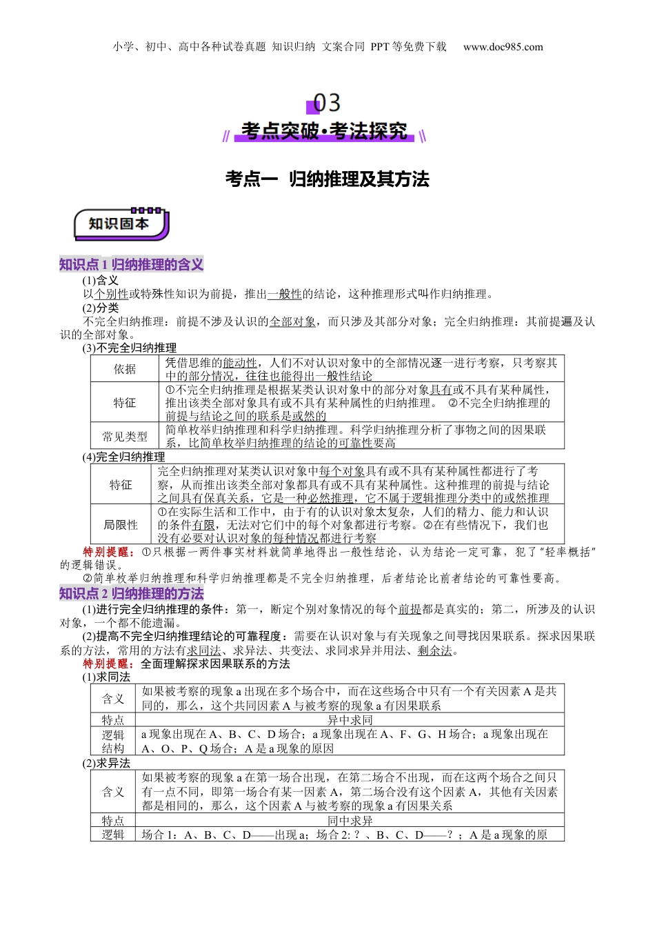 小学、初中、高中各种试卷真题知识归纳文案合同PPT等免费下载www.doc985.com第07课学会归纳与类比推理目录01考情透视·目标导航...................................................................................................102知识导图·思维领航...................................................................................................203考点突破·考法探究...................................................................................................3考点一归纳推理及其方法.........................................................................................................3知识点1归纳推理的含义.....................................................................................................3知识点2归纳推理的方法.....................................................................................................3考向1归纳推理的含义.........................................................................................................4考向2归纳推理的方法.........................................................................................................6考点二类比推理及其方法.........................................................................................................7知识点1类比推理的含义.....................................................................................................7知识点2类比推理的方法.....................................................................................................8考向1类比推理的含义.........................................................................................................8考向2类比推理的方法.........................................................................................................904真题练习·命题洞见.................................................................................................11考点要求考题统计考建备议归纳推理及其方法2023选择题:江苏卷、海南卷主观题:浙江卷本讲选择题和主观题都有考查,复习时关注一些命题:理解归纳推理的含义与要求,把握归纳推理的方法,能够区分探求因果联系的常用方法,能结合实际事例,运用探求因果联系的常用方法进行不完全归纳推理,培养科学思维的习惯;理解类比推理的内涵与性质,把握类比推理的方法;能结合实际事例,运用类比推理的方法,进行简单的推理,结合事物属性、功能进行类比推理,提升解决实际问题的能力。2022选择题:海南卷类比推理及其方法2023选择题:浙江卷、福建卷主观题:北京卷2022无复习目标:1.理解归纳推理的含义和种类小学、初中、高中各种试卷真题知识归纳文案合同PPT等免费下载www.doc985.com2.掌握归纳推理的方法,把握探求事物因果联系的方法3.理解归纳推理的意义4.明确类比推理的含义,掌握提高类比推理可靠程度的条件,运用类比推理的方法5.理解类比推理在思维创新中的功用小学、初中、高中各种试卷真题知识归纳文案合同PPT等免费下载www.doc985.com考点一归纳推理及其方法知识点1归纳推理的含义(1)含义以个别性或特性知识为前提,推出殊一性般的结论,这种推理形式作归纳推理。叫(2)分类不完全归纳推理:前提不及认识的涉全部对象,而只及其部分对象;完全归纳推理:其前提及认涉遍识的全部对象。(3)不完全归纳推理依据借思维的凭能动性,人们不对认识对象中的全部情况一进行考察,只考察其逐中的部分情况,也能得出一性结论往往般特征不完全归纳推理是根据某类认识对象中的部分对象①具有或不具有某种属性,推出该类全部对象具有或不具有某种属性的归纳推理。不完全归纳推理的②前提与结论之间的联系是或然的常见类型简单枚举归纳推理和科学归纳推理。科学归纳推理分析了事物之间的因果联系,比简单枚举归纳推理的结论的可靠性...