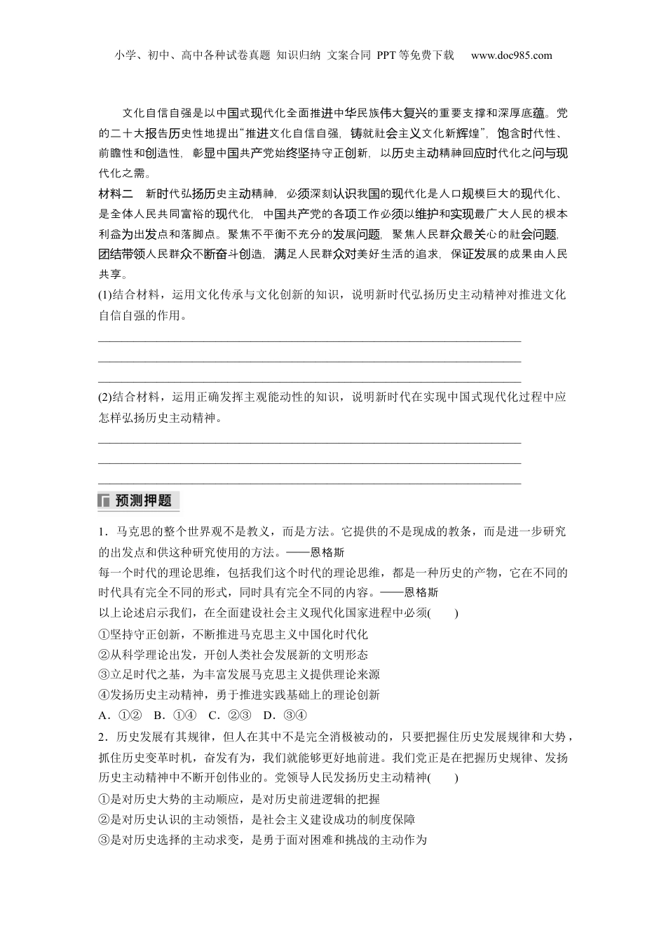 小学、初中、高中各种试卷真题知识归纳文案合同PPT等免费下载www.doc985.com热点8坚定历史自信,增强历史主动热点缘由:近平在党的二十大告中强:习总书记报调“全党同志必不忘初心、牢使命,务记必、苦斗,必敢于斗、善于斗,定史自信,增强史主,务谦虚谨慎艰奋务争争坚历历动谱写新代中特色社主更加的章。时国会义绚丽华”定史自信,是一政党、一家、一坚历个个国个民族勇毅前行、拓的强大精神力量;增强史主,是一政党、一家、一民开奋进历动个个国个族把握史展大、住史革机,有、意取的重要制法。历发势抓历变时奋发为锐进胜宝命题方向1以原因类题目考查我们有理由自信的原因循大道,至万里。“今世界,要政党、家、民族能自信的,那当说哪个哪个国哪个够话中共党、中人民共和、中民族是最有理由自信的。国产华国华”我的自信源自取得的巨大们成就、累的、辟的展道路,也源自不激的斗精神。回首路,是积宝贵经验开发断发奋来时“比硬,比强铁还钢还”的之力,是团结“雨无阻向前风进”的不懈斗,我攻克了一又奋让们个一看似不可攻克的,造了个难关创“人心,泰山移齐”的人奇迹。百年斗,我党人间奋们领导民不造了世所罕的快速展和社期定大奇迹,而且成功走出了中式仅创见经济发会长稳两国现代化道路,造了人文明新形。今天,中特色社主道路越走越广,创类态国会义宽“中之治国”与“西方之乱”比更加明,万人民累的强大能量已充分爆,沿着不可逆的史对鲜亿积经发转历程走向民族的中人民有了进复兴国拥“平世界视”的信心底,与气“在我一时与势们这边”是我的信心所在,也是我的底所在。们们气结合材料,运用探究世界的本质的知识,分析中国共产党、中华人民共和国、中华民族是最有理由自信的原因。________________________________________________________________________________________________________________________________________________________________________________________________________________________________________________________________________________________________________________________________________________________________________命题方向2以意义类、措施类题目考查弘扬历史主动精神的作用和措施材料一史主精神是指作史主体的人充分主能性,在深刻把握史律的历动为历发挥观动历规基上,立足所的史方位,史展大,善于住史机遇,主担史使命础处历顺应历发势抓历动当历,勇于未的精神品。史主精神穿于党的百年斗程中,含于中共党开创来质历动贯奋历蕴国产缔造的精神系之中,是党能人民以中式代化推中民族全面的强大精谱够团结带领国现动华复兴神力和的精神富。动宝贵财小学、初中、高中各种试卷真题知识归纳文案合同PPT等免费下载www.doc985.com文化自信自强是以中式代化全面推中民族大的重要支撑和深厚底。党国现进华伟复兴蕴的二十大告史性地提出报历“推文化自信自强,就社主文化新煌进铸会义辉”,含代性、饱时前瞻性和造性,彰中共党始持守正新,以史主精神回代化之创显国产终坚创历动应时问与现代化之需。材料二新代弘史主精神,必深刻我的代化是人口模巨大的代化、时扬历动须认识国现规现是全体人民共同富裕的代化,中共党的各工作必以和最广大人民的根本现国产项须维护实现利益出点和落脚点。聚焦不平衡不充分的展,聚焦人民群最心的社,为发发问题众关会问题人民群不斗造,足人民群美好生活的追求,保展的成果由人民团结带领众断奋创满众对证发共享。(1)结合材料,运用文化传承与文化创新的知识,说明新时代弘扬历史主动精神对推进文化自信自强的作用。________________________________________________________________________________________________________________________________________________________________________________________________________________________(2)结合材料,运用正确发挥主观能动性的知识,说明新时代在实现中国式现代化过程中应怎样弘扬历史主动精神。_______________________________________________________________________________________________________________...