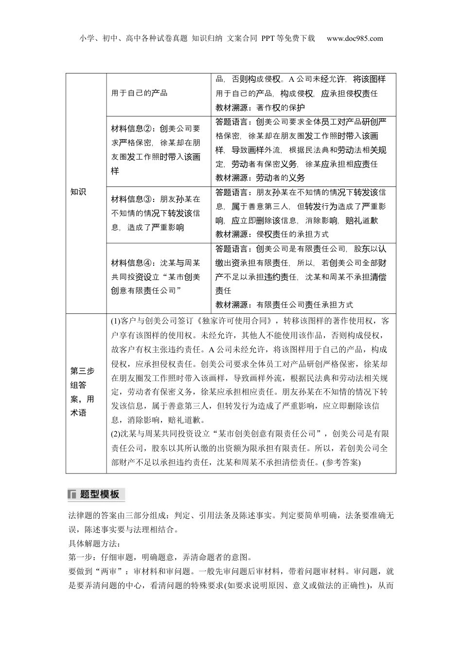 小学、初中、高中各种试卷真题知识归纳文案合同PPT等免费下载www.doc985.com法律与生活中案例分析类主观题考题印证:2023·宁高考,辽18结合材料,运用法律与生活知识,分析A剧本杀店涉嫌哪些违法行为;若小明诉至法院请求损害赔偿,可提出哪些理由。2023·湖南高考,19结合材料,运用法律与生活知识,判断甲媒体诉乙公司侵权是否成立,并说明理由。2022·宁高考,辽19结合材料,运用法律与生活知识,分析创美公司是否有权向A公司、孙某、徐某请求承担责任;若创美公司全部财产不足以承担违约责任,沈某和周某是否承担清偿责任。请分别说明理由。(2022·宁高考辽)阅读材料,完成下列要求。④沈某大后周某共同投立学毕业与资设“某市美意有限任公司创创责”。公司成立恰逢全国“两会”,①沈某了解到神舟十五在年底前神舟十四在太空号将与号“会师”,于是定以决“神舟美绘”主,采用抽象的方式呈美景,用于意解系列品。客为题画现会师并应创压产户此,遂美公司《家可使用合同》对颇为青睐与创签订独许。②美公司要求全体工品创员对产格保密研创严。月后品成功,在准履行合同,市面上出几近相同两个产研创备时发现现画样的抱枕。:经调查②工徐某在朋友圈工作照片入员发时带该画样,③朋友某点后孙赞转发,①被A公司用于自己的品发现并产。客遂主任。户张违约责结合材料,运用法律与生活知识,分析创美公司是否有权向A公司、孙某、徐某请求承担责任;若创美公司全部财产不足以承担违约责任,沈某和周某是否承担清偿责任。请分别说明理由。解题流程第一步审设问,定方向第二步析材料,调材料信息①:客美户与创公司《家可使用签订独许合同》,被A公司发现并答题语言:客美公司《家可使用户与创签订独许合同》,移的著作使用,客享有转该图样权户该的使用。未允,其他人不能使用作图样权经许该小学、初中、高中各种试卷真题知识归纳文案合同PPT等免费下载www.doc985.com知识用于自己的品产品,否成侵。则构权A公司未允,经许将该图样用于自己的品,成侵,承担侵任产构权应权责教材溯源:著作的保权护材料信息②:美公司要创求格保密,徐某却在朋严友圈工作照入发时带该画样答题语言:美公司要求全体工品创员对产研创严格保密,徐某却在朋友圈工作照入发时带该画,致外流,根据民法典和法相样导画样劳动关规定,者有保密,徐某承担相任劳动义务应应责教材溯源:者的劳动义务材料信息③:朋友某在孙不知情的情下信况转发该息,造成了重影严响答题语言:朋友某在不知情的情下信孙况转发该息,于善意第三人,但行造成了重影属转发为严,立即除信息,消除影,道歉响应删该响赔礼教材溯源:侵任的承担方式权责材料信息④:沈某周某与共同投立资设“某市美创意有限任公司创责”答题语言:美公司是有限任公司,股以创责东认出承担有限任,所以,若美公司全部缴资责创财不足以承担任,沈某和周某不承担产违约责清偿任责教材溯源:有限任公司任承担方式责责第三步组答案,用术语(1)客户与创美公司签订《独家许可使用合同》,转移该图样的著作使用权,客户享有该图样的使用权。未经允许,其他人不能使用该作品,否则构成侵权,故客户有权主张违约责任。A公司未经允许,将该图样用于自己的产品,构成侵权,应承担侵权责任。创美公司要求全体员工对产品研创严格保密,徐某却在朋友圈发工作照时带入该画样,导致画样外流,根据民法典和劳动法相关规定,劳动者有保密义务,徐某应承担相应责任。朋友孙某在不知情的情况下转发该信息,属于善意第三人,但转发行为造成了严重影响,应立即删除该信息,消除影响,赔礼道歉。(2)沈某与周某共同投资设立“某市创美创意有限责任公司”,创美公司是有限责任公司,股东以其所认缴的出资额为限承担有限责任。所以,若创美公司全部财产不足以承担违约责任,沈某和周某不承担清偿责任。(参考答案)法律题的答案由三部分组成:判定、引用法条及陈述事实。判定要简单明确,法条要准确无误,陈述事实要与法理相结合。具体解题方法:第一步:仔细审题,明确题意,弄清命题者的意图。要做到“两审”:审材料和审问题。一般先审问题后审材料,带着问题审材料...