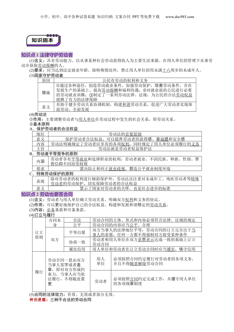 小学、初中、高中各种试卷真题知识归纳文案合同PPT等免费下载www.doc985.com第42讲做个明白的劳动者目录01考情透视·目标导航...................................................................................................102知识导图·思维领航...................................................................................................203考点突破·考法探究...................................................................................................2考点一立足职场有法宝.............................................................................................................2知识点1法律守护劳动者.....................................................................................................3知识点2劳动也要签合同.....................................................................................................3考向1法律守护劳动者.........................................................................................................4考向2劳动也要签合同.........................................................................................................5考点二心中有数上职场.............................................................................................................7知识点1明明白白工作——权利与义务.............................................................................7知识点2清清楚楚维权.........................................................................................................7考向1明明白白工作——权利与义务.................................................................................8考向2清清楚楚维权.............................................................................................................904真题练习·命题洞见.................................................................................................10考点要求考题统计备考建议立足职场有法宝2023选择题:重庆卷;广东卷;山东卷本讲选择题和主观题都有考查,复习时关注一些命题:以劳动合同为背景,考查维护劳动者合法权益的重要依据。理解劳动者权利与义务,发挥劳动者主体作用。劳动者权利和义务将是高考命题的重点,以劳动者就业过程为依据,考查劳动者的权利和劳动者维权。2022无心中有数上职场2024选择题:浙江卷2023选择题:福建卷;天津卷;主观题:河北卷2022选择题:北京卷习目标:复了解劳动法的基本原则,理解劳动者的权利和义务,解释劳动合同的主要内容,熟悉劳动者依法维权的途径和方式小学、初中、高中各种试卷真题知识归纳文案合同PPT等免费下载www.doc985.com考点一立足职场有法宝小学、初中、高中各种试卷真题知识归纳文案合同PPT等免费下载www.doc985.com知识点1法律守护劳动者(1)含义:具有劳动能力、以从事某种社会劳动获得收入为主要生活来源、在用人单位的管理下从事劳动并获取劳动报酬的人。(2)要求:应当达到法定就业年龄,除特殊情况外,禁止用人单位招用未满十六周岁的未成年人。(3)国家守护劳动者原因公民有劳动的权利和义务施措通过各种途径,创造劳动就业条件,加强劳动保护,劳动条件,并在①改善发展生产的基础上,提高劳动报酬和福利待遇;对就业前的公民进行必要②的劳动就业训;制定了一系列劳动法律、法规,为公民的合法练③劳动权益提了有力的法律保障供意义有助于健全劳动关系协调机制,构建和谐劳动关系,促进广大劳动者实现体面劳动、全面发展(4)劳动法作用:①主要调整劳动者与用人单位在劳动过程中发生的社会关系,即劳动关系。基本原则②A.保护劳动者的合法权益地位劳动法的首要原则意义保护劳动者合法权益,可以提劳动者的获得、升感福幸感和安全感内容劳动法明确规定了劳动者应享有的各项权利,同时规定了用人单位必须履行的义务主旨劳动...