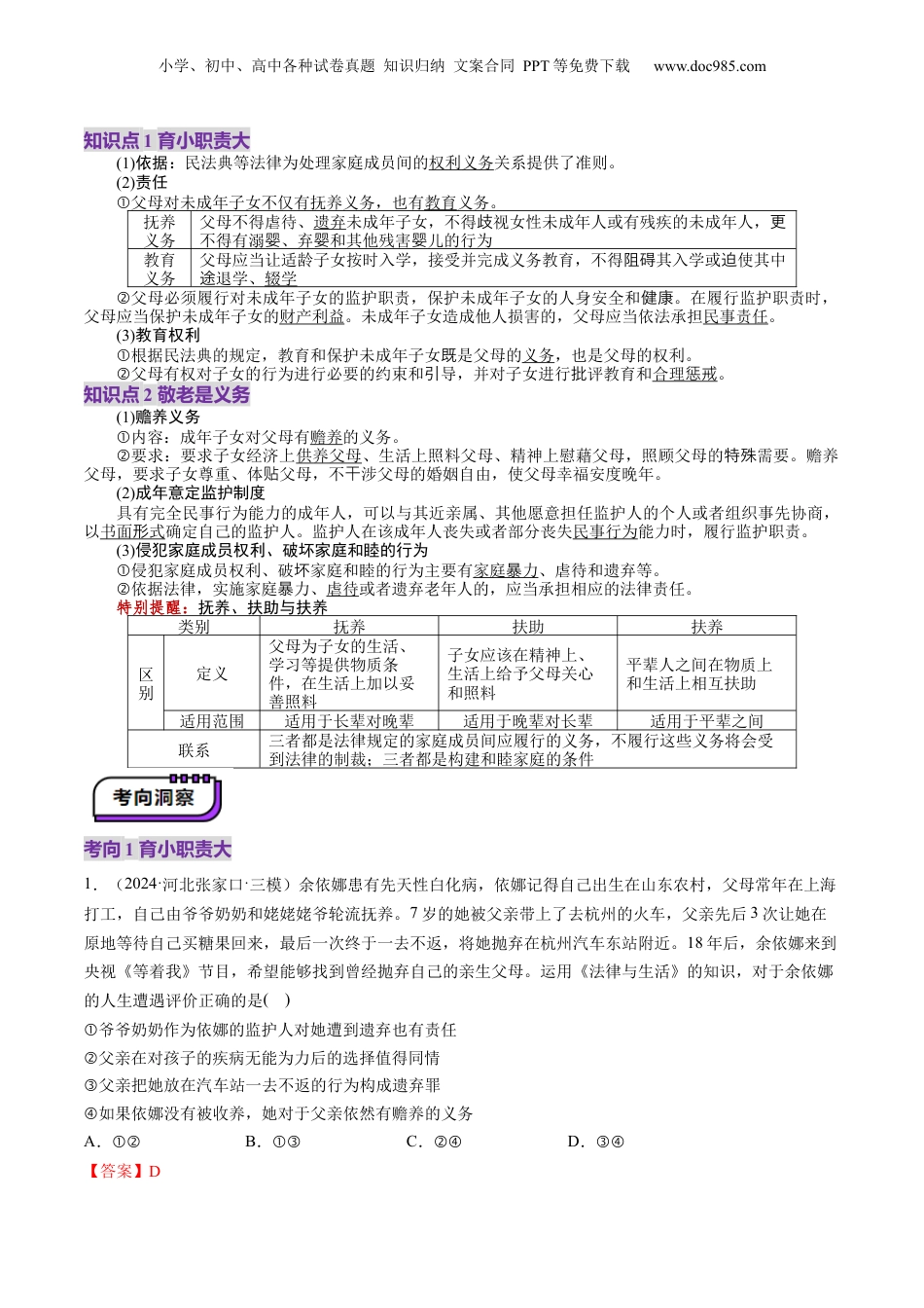 小学、初中、高中各种试卷真题知识归纳文案合同PPT等免费下载www.doc985.com第40讲在和睦家庭中成长目录01考情透视·目标导航...................................................................................................102知识导图·思维领航...................................................................................................203考点突破·考法探究...................................................................................................2考点一家和万事兴.....................................................................................................................2知识点1育小职责大.............................................................................................................3知识点2敬老是义务.............................................................................................................3考向1育小职责大.................................................................................................................3考向2敬老是义务.................................................................................................................5考点二薪火相传有继承.............................................................................................................7知识点1法定继承有顺序.....................................................................................................7知识点2遗嘱继承重意愿.....................................................................................................7考向1法定继承有顺序.........................................................................................................8考向2遗嘱继承重意愿.........................................................................................................904真题练习·命题洞见.................................................................................................11考点要求考题统计考建备议家和万事兴2024主观题:浙江卷本讲选择题和主观题都有考查,复习时关注一些命题:以父母对未成年子女的教育、抚养、监护为背景,考查父母的权利和义务;明确家庭成员的权利义务关系,理解家庭违法行为及处罚措施。以遗产继承为背景,考查法定继承和遗嘱继承;明确继承与遗产,理解法定继承顺序,明确遗嘱继承重意愿。明确遗产继承中的法律规定,能够运用法治思维分析现实问题。2023选择题:湖南卷薪火相传有继承2024主观题:浙江卷2023选择题:福建卷;江苏卷2022选择题:浙江卷习目标:复熟知监护、抚养、扶养、赡养、继承等民事关系,培育家庭责任意识小学、初中、高中各种试卷真题知识归纳文案合同PPT等免费下载www.doc985.com考点一家和万事兴小学、初中、高中各种试卷真题知识归纳文案合同PPT等免费下载www.doc985.com知识点1育小职责大(1)依据:民法典等法律为处理家庭成员间的权利义务关系提供了准则。(2)责任父母对未成年子女不仅有抚养义务,也有①教育义务。抚养义务父母不得虐待、遗弃未成年子女,不得视女性未成年人或有残疾的未成年人,歧更不得有溺、弃和其他残害儿的行为婴婴婴教育义务父母应当让适龄子女按时入学,接受并完成义务教育,不得其入学或使其中阻碍迫退学、途辍学父母必须履行对未成年子女的监护职责,保护未成年子女的人身安全和。在履行监护职责时,②健康父母应当保护未成年子女的财产利益。未成年子女造成他人损害的,父母应当依法承担民事责任。(3)教育权利根据民法典的规定,教育和保护未成年子女是父母的①既义务,也是父母的权利。父母有权对子女的行为进行必要的约束和导,并对子女进行评教育和②引批合理惩戒。知识点2敬老是义务(1)赡养义务内容:成年子女对父母有①赡养的义务。要求:要求子女经济上②供养父母、生活上照料父母...
