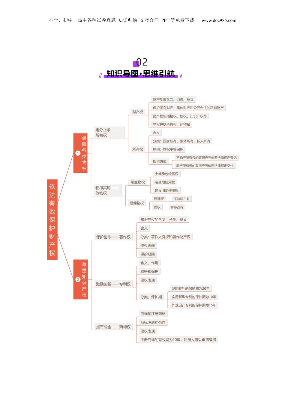 小学、初中、高中各种试卷真题知识归纳文案合同PPT等免费下载www.doc985.com第37讲依法有效保护财产权目录01考情透视·目标导航...................................................................................................102知识导图·思维领航...................................................................................................103考点突破·考法探究...................................................................................................3考点一保障各类物权.................................................................................................................3知识点1定分止争——所有权.............................................................................................3知识点2物尽其用——他物权.............................................................................................4考向1定分止争——所有权.................................................................................................5考向2物尽其用——他物权.................................................................................................6考点二尊重知识产权.................................................................................................................7知识点1保护创作——著作权.............................................................................................7知识点2激励创新——专利权.............................................................................................8知识点3点石成金——商标权.............................................................................................8考向1保护创作——著作权.................................................................................................9考向2激励创新——专利权...............................................................................................11考向2点石成金——商标权...............................................................................................1204真题练习·命题洞见.................................................................................................14考点要求考题计统考建备议保障各类物权2023选择题:海南卷本讲选择题和主观题都有考查,复习时关注一些命题:以钱物归属、抵押等为背景,考查所有权和他物权;理解著作权、专利权、商标权的相关内。以著作、专利、商标等为背容景,考查知识产权。善于用依法有效保护财产权的相关知识运分析和处理相关经现象。济2022选择题:海南卷尊重知识产权2023选择题:湖北卷2022无复习目标:列举物权法的基本原则和物权的主要类型,懂得维护物权的途径小学、初中、高中各种试卷真题知识归纳文案合同PPT等免费下载www.doc985.com小学、初中、高中各种试卷真题知识归纳文案合同PPT等免费下载www.doc985.com考点一保障各类物权知识点1定分止争——所有权(1)财产权财产制度规各类民事主体的①范财产关系,是一个会得以定与发展的基性法律制度。社稳础我国法和法律明确规定,保护国有财产、集体财产和公民②宪合法的有财产。私财产权包括物权、债权、③知识产权等能给民事主体带来经收益的权利。够济物权是权利人依法对特定的物享有直接支配和他的权利,包所有权、④排括他物权。物包动产与不括动产。(2)所有权义:所有权是权利人对自己的不动产或者动产,依法享有的占有、①含使用、收益和处分的权利。分类:国家所有②(全民所有)、集体所有、人所有。私民法典规定了物权③平等保护原则,国家、集体、人的物权和其他权利人的物权受法律平等保护,私任何组织或者个人不得侵犯。所有权的取得方式④A.动产所有权的取得应当依照法律规定交付。所有人按照转让财产所有权的意图,直接把财产交给对方占有,对方...