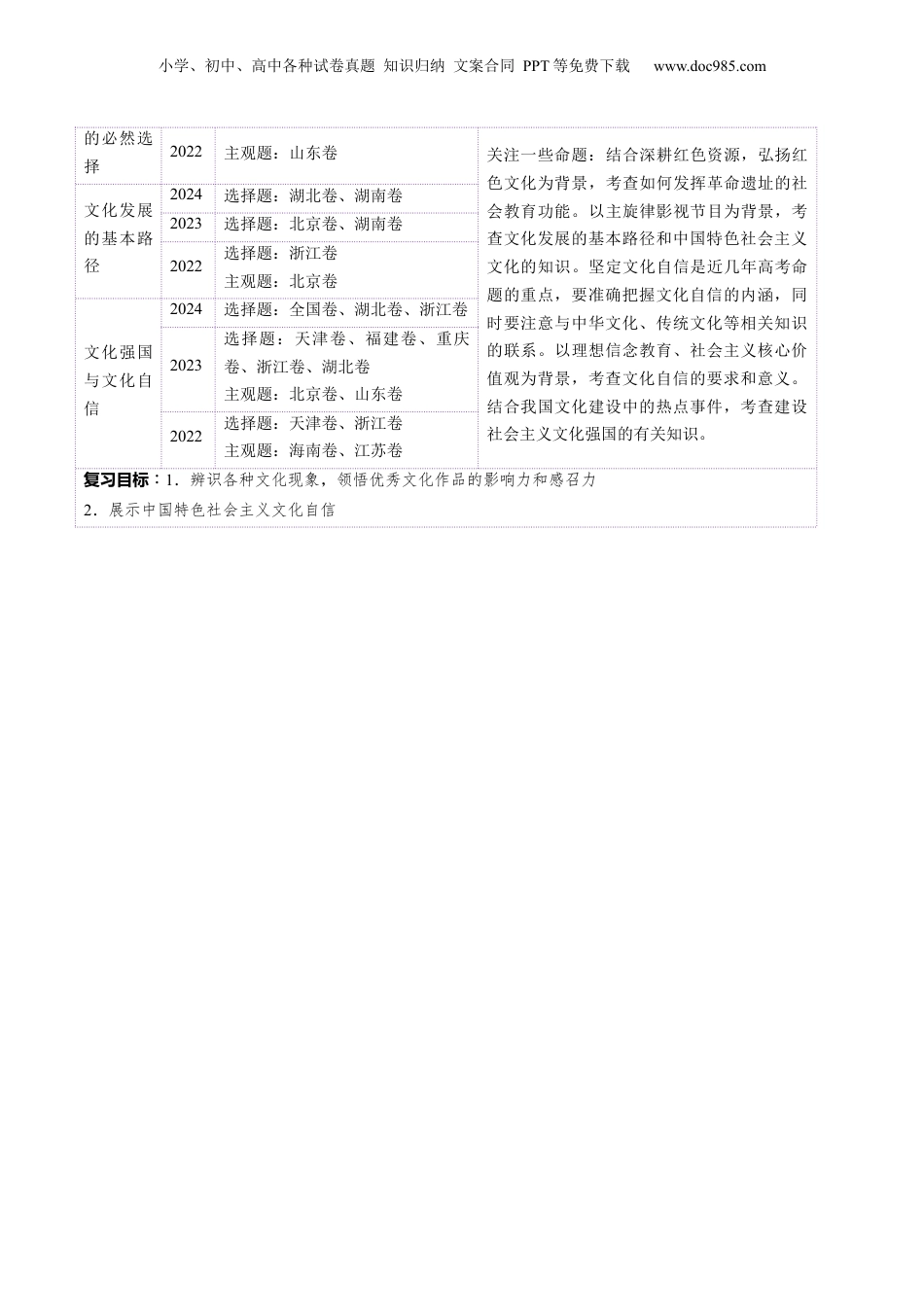 小学、初中、高中各种试卷真题知识归纳文案合同PPT等免费下载www.doc985.com第09课发展中国特色社会主义文化目录01考情透视·目标导航...................................................................................................202知识导图·思维领航...................................................................................................303考点突破·考法探究...................................................................................................3考点一文化发展的必然选择.....................................................................................................3知识点1革命文化与社会主义先进文化.............................................................................4知识点2中国特色社会主义文化发展道路的历史必然性.................................................4考向1革命文化与社会主义先进文化.................................................................................4考向2中国特色社会主义文化发展道路的历史必然性.....................................................6考点二文化发展的基本路径.....................................................................................................7知识点1坚定理想信念坚持以人民为中心.......................................................................7知识点2立足时代之基回答时代之问...............................................................................7知识点3融通不同资源实现综合创新...............................................................................7考向1坚定理想信念坚持以人民为中心...........................................................................8考向2立足时代之基回答时代之问...................................................................................9考向3融通不同资源实现综合创新.................................................................................10考点三文化强国与文化自信...................................................................................................12知识点1如何建设文化强国...............................................................................................12知识点2坚定文化自信.......................................................................................................13考向1如何建设文化强国...................................................................................................13考向2坚定文化自信...........................................................................................................1504真题练习·命题洞见.................................................................................................16考点要求考题统计考建备议文化发展2023无本讲选择题和主观题都有考查,复习时小学、初中、高中各种试卷真题知识归纳文案合同PPT等免费下载www.doc985.com的必然选择关注一些命题:结合深耕红色资源,弘扬红色文化为背景,考查如何发挥革命遗址的社会教育功能。以主旋律影视节目为背景,考查文化发展的基本路径和中国特色社会主义文化的知识。坚定文化自信是近几年高考命题的重点,要准确把握文化自信的内涵,同时要注意与中华文化、传统文化等相关知识的联系。以理想信念教育、社会主义核心价值观为背景,考查文化自信的要求和意义。结合我国文化建设中的热点事件,考查建设社会主义文化强国的有关知识。2022主观题:山东卷文化发展的基本路径2024选择题:湖北卷、湖南卷2023选择题:北京卷、湖南卷2022选择题:浙江卷主观题:北京卷文化强国与文化自信2024选择题:全国卷、湖北卷、浙江卷2023选择题:天津卷、福建卷、重庆卷、浙江卷、湖北卷主观题:北...