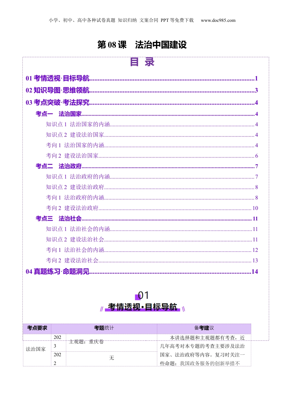 小学、初中、高中各种试卷真题知识归纳文案合同PPT等免费下载www.doc985.com第08课法治中国建设目录01考情透视·目标导航...................................................................................................102知识导图·思维领航...................................................................................................303考点突破·考法探究...................................................................................................4考点一法治国家.........................................................................................................................4知识点1法治国家的内涵.....................................................................................................4知识点2建设法治国家.........................................................................................................4考向1法治国家的内涵.........................................................................................................4考向2建设法治国家.............................................................................................................6考点二法治政府.........................................................................................................................7知识点1法治政府的内涵.....................................................................................................7知识点2建设法治政府.........................................................................................................8考向1法治政府的内涵.........................................................................................................8考向2建设法治政府...........................................................................................................10考点三法治社会.......................................................................................................................11知识点1法治社会的内涵...................................................................................................11知识点2建设法治社会.......................................................................................................11考向1法治社会的内涵.......................................................................................................12考向2建设法治社会...........................................................................................................1304真题练习·命题洞见.................................................................................................14考点要求考题统计考建备议法治国家2023主观题:重庆卷本讲选择题和主观题都有考查,近几年高考对本专题的考查主要涉及法治国家、法治政府等内容。复习时关注一些命题:我国政务服务的创新举措不2022无小学、初中、高中各种试卷真题知识归纳文案合同PPT等免费下载www.doc985.com断,政务服务不断优化、行政效能不断提升;如何整治形式主义;应如何完善基层治理,赋能法治社会建设;国务院制定出台的《未成年人网络保护条例》等;主要考查学生辨识与判断、分析与综合、推理与论证、反思与评价的能力,考查调动运用相关知识分析解决现法治政府2024选择题:全国卷、新课标卷、Ⅱ浙江卷2023选择题:湖南卷、湖北卷、海南卷、北京卷、浙江卷主观题:山东卷、河北卷2022选择题:江苏卷、海南卷、重庆卷主观题:辽宁卷、北京卷、山东卷法治社会2024主观题:新课标卷Ⅱ、湖南卷2023主观题:全国卷、重庆卷2022无习目标:复列举事例,阐明建设法治国家、法治政府、法治社会的意义小学、初中、高中各种试卷真题知识归纳文案合同PPT等...