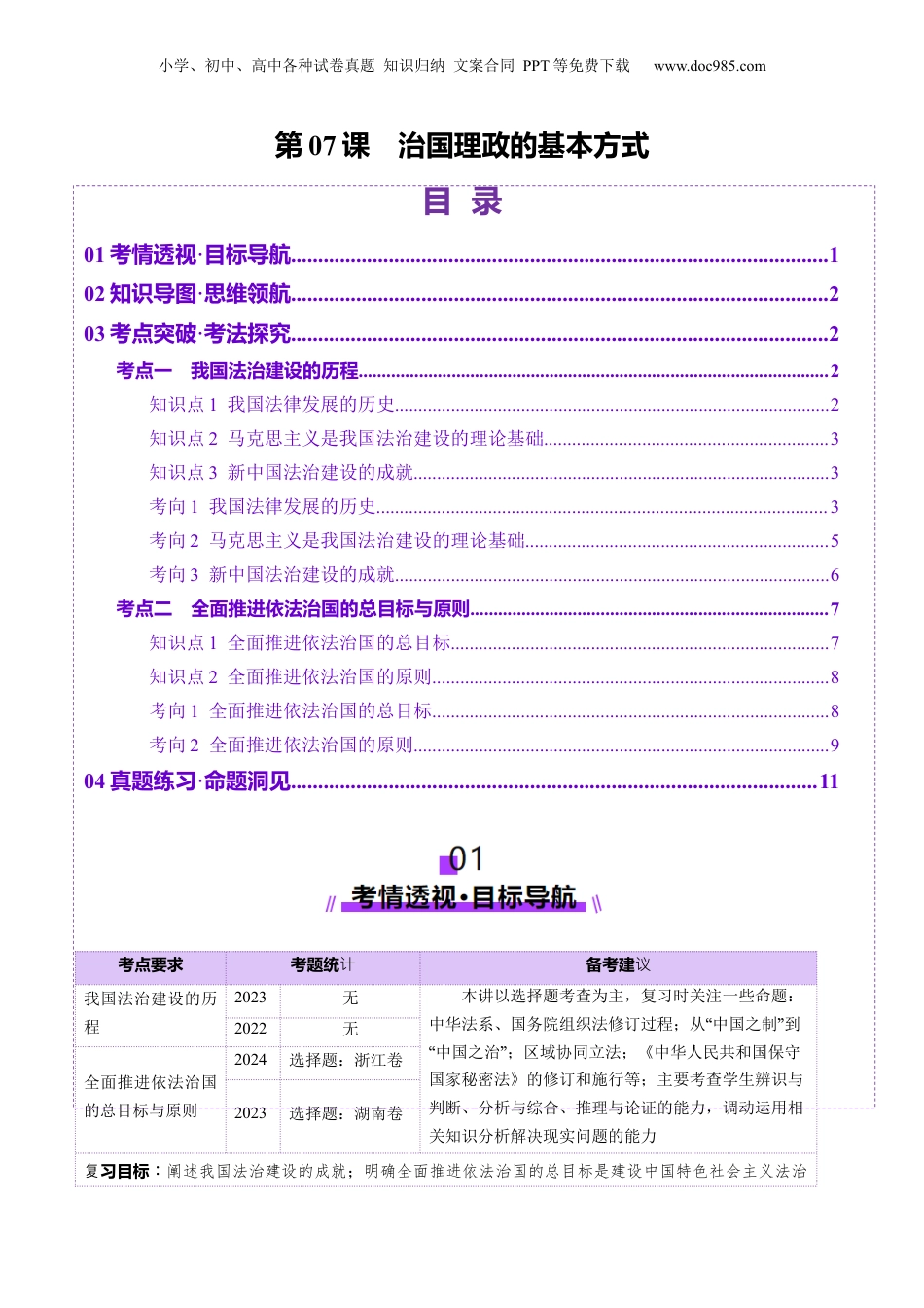 小学、初中、高中各种试卷真题知识归纳文案合同PPT等免费下载www.doc985.com第07课治国理政的基本方式目录01考情透视·目标导航...................................................................................................102知识导图·思维领航...................................................................................................203考点突破·考法探究...................................................................................................2考点一我国法治建设的历程.....................................................................................................2知识点1我国法律发展的历史.............................................................................................2知识点2马克思主义是我国法治建设的理论基础.............................................................3知识点3新中国法治建设的成就.........................................................................................3考向1我国法律发展的历史.................................................................................................3考向2马克思主义是我国法治建设的理论基础.................................................................5考向3新中国法治建设的成就.............................................................................................6考点二全面推进依法治国的总目标与原则.............................................................................7知识点1全面推进依法治国的总目标.................................................................................7知识点2全面推进依法治国的原则.....................................................................................8考向1全面推进依法治国的总目标.....................................................................................8考向2全面推进依法治国的原则.........................................................................................904真题练习·命题洞见.................................................................................................11考点要求考题统计备考建议我国法治建设的历程2023无本讲以选择题考查为主,复习时关注一些命题:中华法系、国务院组织法修订过程;从中国之制到“”中国之治“”;区域协同立法;《中华人民共和国保守国家秘密法》的修订和施行等;主要考查学生辨识与判断、分析与综合、推理与论证的能力,调动运用相关知识分析解决现实问题的能力2022无全面推进依法治国的总目标与原则2024选择题:浙江卷2023选择题:湖南卷习目标复:阐述我国法治建设的成就;明确全面推进依法治国的总目标是建设中国特色社会主义法治小学、初中、高中各种试卷真题知识归纳文案合同PPT等免费下载www.doc985.com体系,建设社会主义法治国家考点一我国法治建设的历程知识点1我国法律发展的历史(1)法律的产生、本质和作用法律是人类社会发展到一定历史阶段的产物。法律体现着统治阶级的意志,是实现国家职能的工具,既维护公共管理秩序,也保障正常的社会生活。它(2)中国古代的法治历程我国是一个具有五多年文明史的古国,中华法系千源远流长。春秋战国时期,我国开制定成文法,始并通过刑、书等方式发布法律。汉时期,铸鼎竹简西家思想儒成为政治生活的主导思想,强调礼法结合。唐时期,我国形成了为完备的封建法典,并为以后历代封建王所传承和发展。中华法系成为世界上朝朝较独树一帜的法律文明,古老的中国为人类法治发展作出了重要贡献。小学、初中、高中各种试卷真题知识归纳文案合同PPT等免费下载www.doc985.com知识点2马克思主义是我国法治建设的理论基础法的起源法是人类社会发展到一定历史阶段,随着私有制、阶级和国家的出现而逐步产生的法的本质及其决定因素在阶级社会中,法反映的是该社会中在...