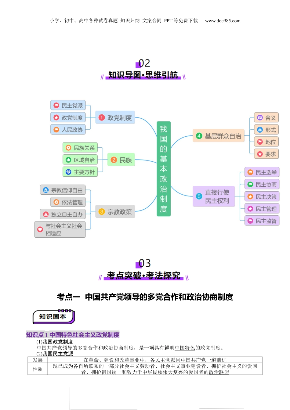 小学、初中、高中各种试卷真题知识归纳文案合同PPT等免费下载www.doc985.com第06课我国的基本政治制度目录01考情透视·目标导航...................................................................................................202知识导图·思维领航...................................................................................................303考点突破·考法探究...................................................................................................3考点一中国共产党领导的多党合作和政治协商制度.............................................................2知识点1中国特色社会主义政党制度.................................................................................3知识点2中国人民政治协商会议.........................................................................................4考向1中国特色社会主义政党制度.....................................................................................5考向2中国人民政治协商会议.............................................................................................6考点二民族区域自治制度.........................................................................................................7知识点1我国是统一的多民族国家.....................................................................................8知识点2符合国情的民族区域自治制度.............................................................................8知识点3我国的宗教政策与法律.........................................................................................9考向1我国是统一的多民族国家.........................................................................................9考向2符合国情的民族区域自治制度...............................................................................10考向3我国的宗教政策与法律...........................................................................................12考点三基层群众自治制度.......................................................................................................13知识点1我国基层群众自治的组织形式...........................................................................13知识点2人民群众直接行使民主权利的生动实践...........................................................14考向1我国基层群众自治的组织形式...............................................................................14考向2人民群众直接行使民主权利的生动实践...............................................................1504真题练习·命题洞见.................................................................................................17考点要求考题统计考建议备中国共产党领导的2024选择题:浙江卷本讲选择题和主观题都有考小学、初中、高中各种试卷真题知识归纳文案合同PPT等免费下载www.doc985.com多党合作和政治协商制度查,全国及各省对本专题的考查呈现上升趋势,从考查形式上看,既有选择题也有非选择题,从2023年高考来看,非选择题考查大幅增加,且考查题型有阐释说明类、意义类、措施类等多种形式。复习时重点关注根本政治制度、基本政治制度及国家法律政策的制定执行等点问题热,多角度全方位把握,加强非选择题练习,提高获取和解读信息、描述和阐释事物、分析与综合解决问题的能力2023选择题:广东卷、北京卷、重庆卷、全国卷、河北卷、福建卷、江苏卷、2022选择题:海南卷、广东卷主观题:浙江卷民族区域自治制度2023选择题:广东卷2022选择题:全国卷基层群众自治制度2024选择题:全国卷、浙江卷2023选择题:浙江卷、湖南卷、山东卷、重庆卷、海南卷、江苏卷、广东卷、辽宁卷、湖北卷主观题...