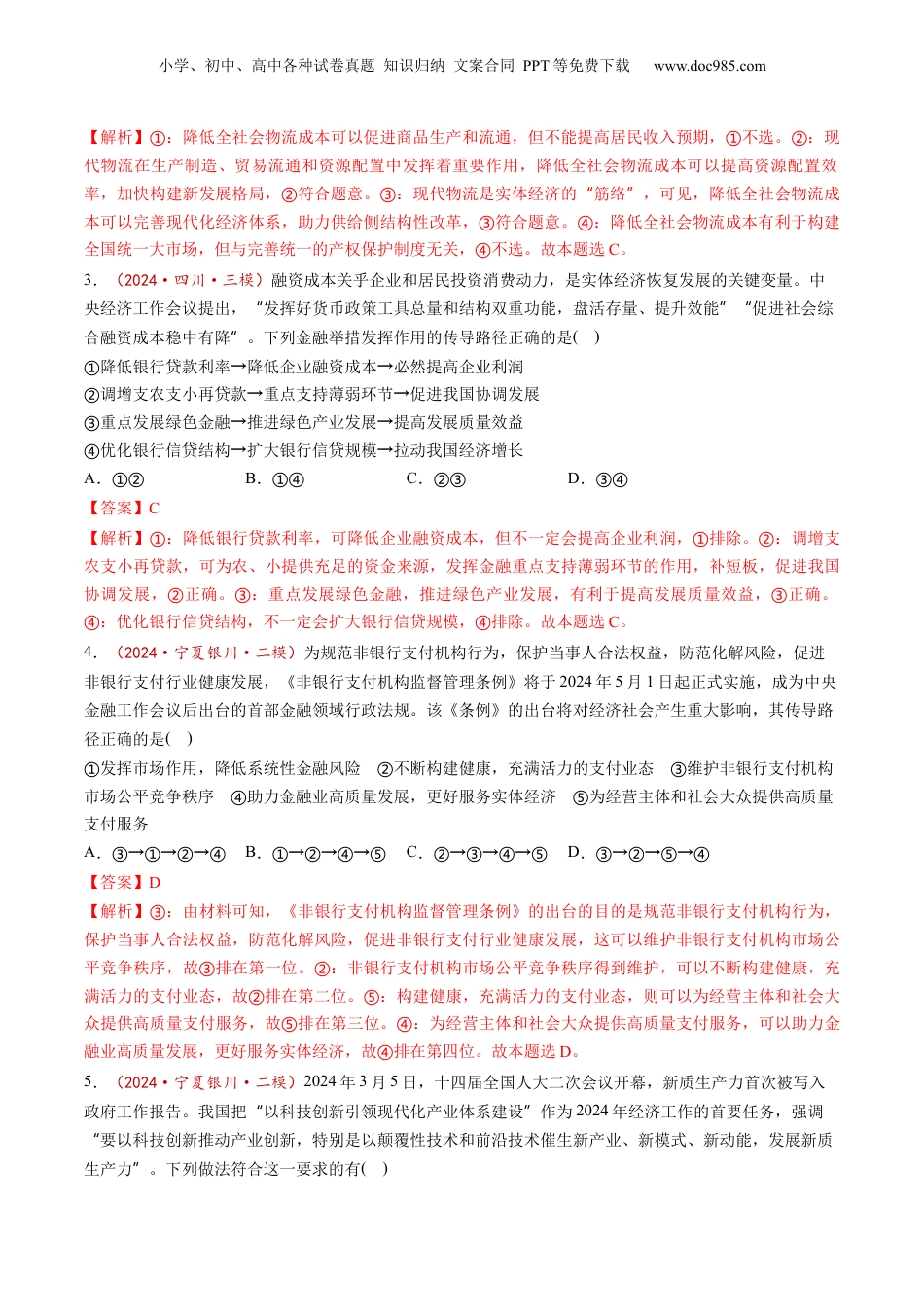 小学、初中、高中各种试卷真题知识归纳文案合同PPT等免费下载www.doc985.com第03课我国的经济发展目录模拟·基础演练...............................................................................................................1重难·创新演练..............................................................................................................11真题·实战演练.............................................................................................................18一、单项选择题1.(2024·辽宁沈阳·三模)当前中国城市正在积极寻求新的发展机遇、发掘新的经济增长潜力。以科技创新推动产业创新,发展高科技、高效能、高质量的新质生产力,是当前中国城市的使命所在。在推动新型城镇化高质量发展的阶段中,以城市群和现代化都市圈带动区域协调发展,则是未来一定时期内的重要目标和方向。由此可见,城市发展要()构建区域创新和产业发展的共同体壮大整体实力①用人力资本和技术创新为新质生产力蓄势赋能②“”取长补短、同频共振,共同打造发展区域增长极③处理顶层设计和实践探索的关系来发挥融合优势④A.①②B.①③C.②④D.③④【答案】B【解析】:材料中指出当前中国城市要坚持发展新质生产力,通过城市群和现代化都市圈带动区域协①③调发展,以此来推动新型城镇化高质量发展,这表明城市发展要取长补短、同频共振,并通过构建区域创新和产业发展的共同体壮大整体实力,故正确。:材料强调的是当前城市的发展要通过发展新质生①③②产力,以此来推动新型城镇化高质量发展,而不是强调以人才支撑去推进新质生产力的发展,故不选。②:材料未涉及政策与实践的关系来发挥融合优势,故不选。故本题选④④B。2.(2024·广东茂名·三模)2024年2月23日,中央财经委员会第四次会议研究有效降低全社会物流成本问题。现代物流涉及领域广、发展潜力大、带动作用强,在生产制造、贸易流通和资源配置中发挥着重要作用,是实体经济的筋络。降低全社会物流成本可以“”()促进商品生产和流通,提高居民收入预期①提高资源配置效率,加快构建新发展格局②完善现代化经济体系,助力供给侧结构性改革③完善统一的产权保护制度,构建全国统一大市场④A.①③B.①④C.②③D.②④【答案】C小学、初中、高中各种试卷真题知识归纳文案合同PPT等免费下载www.doc985.com【解析】:降低全社会物流成本可以促进商品生产和流通,但不能提高居民收入预期,不选。:现①①②代物流在生产制造、贸易流通和资源配置中发挥着重要作用,降低全社会物流成本可以提高资源配置效率,加快构建新发展格局,符合题意。:现代物流是实体经济的筋络,可见,降低全社会物流成②③“”本可以完善现代化经济体系,助力供给侧结构性改革,符合题意。:降低全社会物流成本有利于构建③④全国统一大市场,但与完善统一的产权保护制度无关,不选。故本题选④C。3.(2024·四川·三模)融资成本关乎企业和居民投资消费动力,是实体经济恢复发展的关键变量。中央经济工作会议提出,发挥好货币政策工具总量和结构双重功能,盘活存量、提升效能促进社会综“”“合融资成本稳中有降。下列金融举措发挥作用的传导路径正确的是”()降低银行贷款利率降低企业融资成本必然提高企业利润①→→调增支农支小再贷款重点支持薄弱环节促进我国协调发展②→→重点发展绿色金融推进绿色产业发展提高发展质量效益③→→优化银行信贷结构扩大银行信贷规模拉动我国经济增长④→→A.①②B.①④C.②③D.③④【答案】C【解析】:降低银行贷款利率,可降低企业融资成本,但不一定会提高企业利润,排除。:调增支①①②农支小再贷款,可为农、小提供充足的资金来源,发挥金融重点支持薄弱环节的作用,补短板,促进我国协调发展,正确。:重点发展绿色金融,推进绿色产业发展,有利于提高发展质量效益,正确。②③③:优化银行信贷结构,不一定会扩大银行信贷规模,排除。故本题选④④C。4.(2024·宁夏银川·二模)为规范非银行支付机构行为,保护当事人合法权益,防范化解风险,促进非银行支付行...
