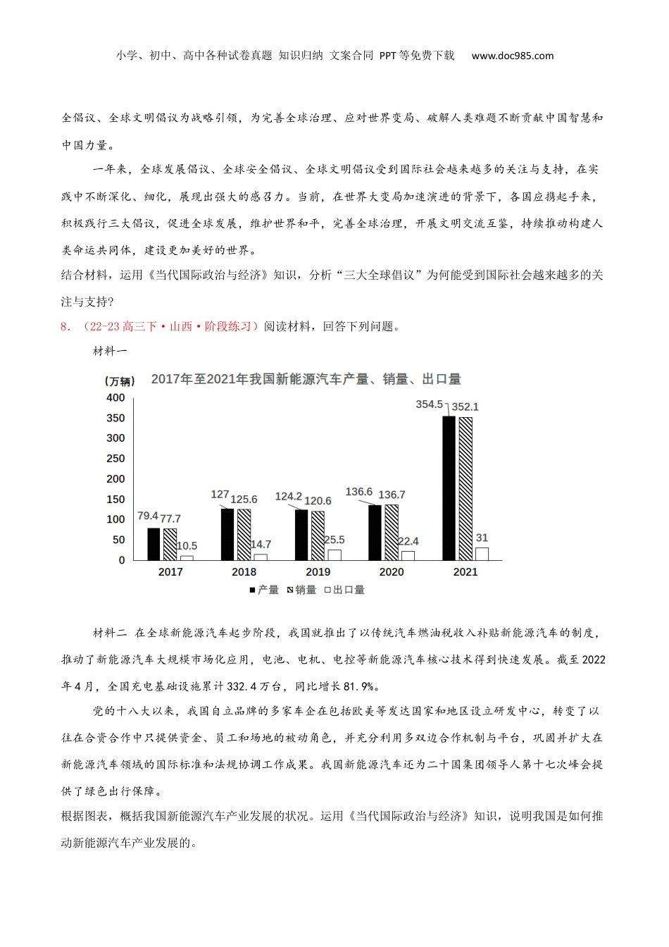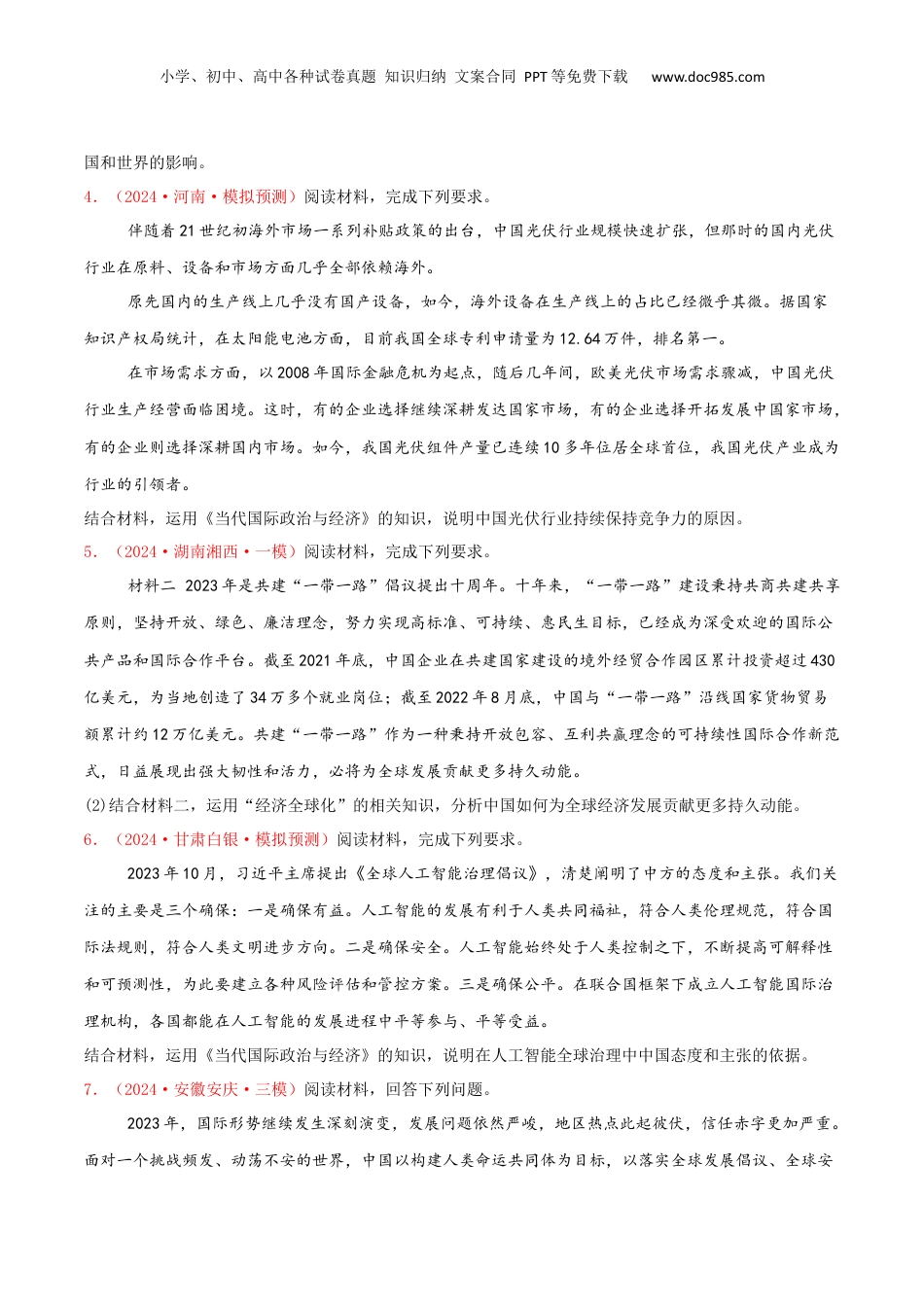 小学、初中、高中各种试卷真题知识归纳文案合同PPT等免费下载www.doc985.com选择性必修一当代国际政治与经济1.(2024·河南郑州·模拟预测)阅读材料,完成下列要求。党的二十大擘画了以中国式现代化全面推进中华民族伟大复兴的宏伟蓝图。中国式现代化是中国共产党领导的走和平发展道路的现代化。自2013年提出共建“一带一路”倡议以来,中国在“一带一路”共建国家建成了一大批交通、通讯等基础设施项目;修建了一批中小学校、职业技术学校,开设了培训中心、“鲁班工坊”;截至2021年底,在86个国家累计投资农业项目超过820个,向40多个国家和地区派出了近1100名农业专家和技术员;积极开展国际减贫经验交流研讨,分享减贫经验,受到国际社会广泛赞誉。运用《当代国际政治与经济》知识,分析中国推动共建“一带一路”对中国式现代化的积极影响。2.(2024·天津·模拟预测)阅读材料,完成下列要求。材料【推动航天技术更好造福全人类】2023年,中国空间站进入应用与发展阶段,天舟六号货运飞船、神舟十六号载人飞船、神舟十七号载人飞船相继发射。天宫空间站是中国正式进入空间站时代建设和运营空间站的重要里程碑。该空间站的建造运营不仅仅是中国航天事业发展的象征,更是一个国家科技、经济和综合国力的重要标志。通过天宫空间站的建设,中国可以储备深空探索所需的技术和积累宝贵的经验,为人类命运共同体的发展作出积极的贡献。结合材料,运用当代国际政治与经济的知识,说明我国天宫空间站建设运营的重要意义。3.(2024·黑龙江哈尔滨·模拟预测)阅读材料,完成下列要求。北极航道大部分航段位于俄罗斯北部,从北欧出发,向东穿越北冰洋,经过白令海峡之后到达亚洲的日本、韩国和中国,被航海界称为连接亚欧的“黄金水道”。材料一2017年习近平主席出访俄罗斯,首次正式提出建设“冰上丝绸之路”,共同开展北极航道的开发与利用,以此扩大中俄和欧洲国家的交流与合作,培育国际合作共生、共赢新机制。在两国的共同努力下,中俄沿北极航道的集装箱班轮常态化运输通道已于2023年7月正式开通,将“一带一路”合作延伸至北冰洋。材料二随着气候变暖,北极海冰融化速度加快,北极地区成为可与中东媲美的油气资源战略储存仓库。“冰上丝绸之路”沿线地区资源种类众多且储量丰富,潜力巨大,对于缓解世界范围内的能源短缺有着重要的价值与意义。结合材料,运用《经济与社会》与《当代国际政治与经济》的知识,说明“冰上丝绸之路”的建设对于中小学、初中、高中各种试卷真题知识归纳文案合同PPT等免费下载www.doc985.com国和世界的影响。4.(2024·河南·模拟预测)阅读材料,完成下列要求。伴随着21世纪初海外市场一系列补贴政策的出台,中国光伏行业规模快速扩张,但那时的国内光伏行业在原料、设备和市场方面几乎全部依赖海外。原先国内的生产线上几乎没有国产设备,如今,海外设备在生产线上的占比已经微乎其微。据国家知识产权局统计,在太阳能电池方面,目前我国全球专利申请量为12.64万件,排名第一。在市场需求方面,以2008年国际金融危机为起点,随后几年间,欧美光伏市场需求骤减,中国光伏行业生产经营面临困境。这时,有的企业选择继续深耕发达国家市场,有的企业选择开拓发展中国家市场,有的企业则选择深耕国内市场。如今,我国光伏组件产量已连续10多年位居全球首位,我国光伏产业成为行业的引领者。结合材料,运用《当代国际政治与经济》的知识,说明中国光伏行业持续保持竞争力的原因。5.(2024·湖南湘西·一模)阅读材料,完成下列要求。材料二2023年是共建“一带一路”倡议提出十周年。十年来,“一带一路”建设秉持共商共建共享原则,坚持开放、绿色、廉洁理念,努力实现高标准、可持续、惠民生目标,已经成为深受欢迎的国际公共产品和国际合作平台。截至2021年底,中国企业在共建国家建设的境外经贸合作园区累计投资超过430亿美元,为当地创造了34万多个就业岗位;截至2022年8月底,中国与“一带一路”沿线国家货物贸易额累计约12万亿美元。共建“一带一路”作为一种秉持开放包容、互利共赢理念的可持续性国际合作新范式,日益展现出强大韧性和活力,...