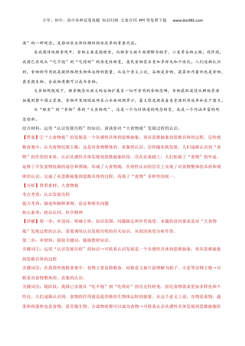 小学、初中、高中各种试卷真题知识归纳文案合同PPT等免费下载www.doc985.com选择性必修三逻辑与思维1.(2024·重庆·模拟预测)阅读材料,回答下列问题。新中国成立以来,我们党领导人民创造了两大奇迹,一是经济快速发展奇迹,二是社会长期稳定奇迹。我国长期稳定的社会环境,为发展厚植根基,也为人民创造美好生活提供有利条件。当前,世界经济增长乏力,逆全球化思潮抬头,单边主义、保护主义明显上升,我国对外贸易发展受阻,这给我国全面建设社会主义现代化国家新征程带来巨大挑战。行稳才能致远,要不断夯实“稳”的基础,才能实现党的二十大提出的两步走战略安排。结合材料,运用《逻辑与思维》中质量互变规律的知识,谈谈中国经济的“行稳”与“致远”的辩证关系。【答案】①事物变化是量变与质变的统一,以统一性的观念把握事物发展中的渐进性和飞跃性,连续性和统一性。正确把握“行稳”与“致远”的辩证关系,才能真正把握中国经济的发展阶段特点和长远战略安排。②量变是质变的必要前提。我们要重视经济的稳定增长,同时要坚持适度原则,保持稳定的社会发展环境。③质变是量变的必然结果。在经济稳定发展的基础上,抓住时机,实现两步走的战略安排。【分析】背景素材:新中国成立以来,我们党领导人民创造了两大奇迹考点考查:《逻辑与思维》中质量互变规律的相关知识能力考查:获取和解读信息、调动和运用知识、描述和阐释事物核心素养:政治认同、科学精神【详解】第一步:审设问。明确主体、知识范围、问题限定和作答角度。本题要求考生结合材料,运用《逻辑与思维》中质量互变规律的知识,谈谈中国经济的“行稳”与“致远”的辩证关系。第二步:审材料。提取关键信息,链接教材知识。关键信息①:新中国成立以来,我们党领导人民创造了两大奇迹,一是经济快速发展奇迹,二是社会长期稳定奇迹→可联系事物变化是量变与质变的统一,以统一性的观念把握事物发展中的渐进性和飞跃性,连续性和统一性。关键信息②:行稳才能致远,要不断夯实“稳”的基础,才能实现党的二十大提出的两步走战略安排→可联系量变是质变的必要前提,质变是量变的必然结果。第三步:整合信息,组织答案。注意教材信息与材料信息相结合。2.(2024·黑龙江哈尔滨·模拟预测)阅读材料,完成下列要求。大食物观是“向耕地草原森林海洋、向植物动物微生物要热量、要蛋白,全方位多途径开发食物资小学、初中、高中各种试卷真题知识归纳文案合同PPT等免费下载www.doc985.com源”的一种观念。是推动农业供给侧结构性改革的重要内容。在我国传统粮食观中,食物主要是指粮食,而粮食又被片面理解为稻子、小麦等谷物主粮。现阶段,我国已实现从“吃不饱”到“吃得好”的历史性转变,居民食物需求更加多样化和个性化。人们逐渐认识到,食物的作用就是提供维持生物体运转的能量,从这个意义上说,谷物是食物,蔬菜和肉蛋奶也是食物,甚至微生物、合成物质都可以成为食物。大食物观视域下,粮食概念从狭义的谷物扩展至一切可食用的食物范畴,食物获取途径从耕地资源拓展到整个国土资源,食物开发领域延伸至山水林田湖草沙,最大限度提高各类资源利用效率和生产潜力。从“粮食”到“食物”再到“大食物观”,这是一个与时俱进的观念转变,也是一个内涵丰富的观念创新。结合材料,运用“认识发展历程”的知识,谈谈你对“大食物观”发展过程的认识。【答案】①“大食物观”的发展是一个从感性具体到思维抽象,再从思维抽象到思维具体的过程。②传统粮食观中,认为食物仅指主粮,这是对食物整体的、表象的认识。②伴随实践发展,人们逐渐认识到“食物”的作用的本质,认识从感性具体发展到思维抽象阶段。③在此基础上,人们拓展了“食物”的外延、延伸了开发食物资源的途径和领域,形成了大食物观,在理性认识的层次上实现了对食物整体的本质和规律的认识,完成了从思维抽象到思维具体的过程,再现了“食物”多样性的统一。【分析】背景素材:大食物观考点考查:认识发展历程能力考查:描述和阐释事物、论证和探究问题核心素养:政治认同、科学精神【详解】第一步:审设问。明确主体、知识范围、问题限定和...