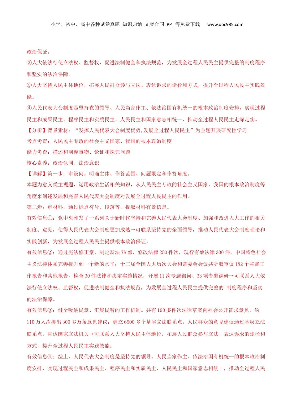 小学、初中、高中各种试卷真题知识归纳文案合同PPT等免费下载www.doc985.com必修三政治与法治1.(2024·安徽六安·模拟预测)阅读材料,完成下列要求。民族要复兴,乡村必振兴。某乡镇通过健全完善治理体系,营造出乡村振兴新风貌。➢加强组织建设引领乡村治理该镇紧紧抓住基层党组织建设这个“牛鼻子”。各村以村党组织换届为契机,把有能力、有担当、愿作为、能作为的党员选为党组织委员,配齐配强党组织班子,带领村民奋力脱贫致富,走上了美丽乡村的发展之路。➢建立“三长联动”助力乡村治理该镇创新建立了村长、社长、联户长的农村“三长联动”机制。每个村都设村长1名,每个村民小组设立男女社长各1名,每相邻的10户至20户居民中选举1人作为联户长。发挥“三长联动”机制“快、准、严、细、实”的特点,及时调解邻里纠纷,建立和谐有序、守望相助的邻里关系。➢打造“三治融合”推进乡村治理该镇通过自治增活力。创新建立村企、村社联席会议制度,充分调动村民参与新村治理的积极性和自觉性。例如,联席会议制度创设“生活环境联营”机制,引导各村村民自觉清理垃圾,自行拆除违章建筑,争相打造美丽庭院和干净人家。通过法治强保障。加强法治教育培训,强化村委会成员的法治意识,规范乡村小微权力运行,建立健全小微权力监督机制,织密农村基层权力运行“防护网”。通过德治扬正气。开展道德讲堂,推动社会主义核心价值观融入村规民约,设立“道德红黑榜”,引导村民提升精神生活水平。结合材料,运用《政治与法治》的知识,说明该镇是如何营造乡村振兴新风貌的。【答案】①坚持中国共产党的领导,发挥中国共产党总揽全局、协调各方的核心作用,该镇紧紧抓住基层党组织建设这个“牛鼻子”。各村以村党组织换届为契机,把有能力、有担当、愿作为、能作为的党员选为党组织委员,配齐配强党组织班子,带领村民奋力脱贫致富,充分发挥党组织的战斗堡垒作用。②完善基层群众自治组织,发挥基层群众自治组织能力,建立“三长联动”助力乡村治理,发挥“三长联动”机制“快、准、严、细、实”的特点,及时调解邻里纠纷,建立和谐有序、守望相助的邻里关系。③打造“三治融合”推进乡村治理,坚持自治、法治、德治三者相结合。该镇通过自治增活力。创新建立村企、村社联席会议制度,充分调动村民参与新村治理的积极性和自觉性。通过法治强保障。加强法治教小学、初中、高中各种试卷真题知识归纳文案合同PPT等免费下载www.doc985.com育培训,强化村委会成员的法治意识,规范乡村小微权力运行,建立健全小微权力监督机制,织密农村基层权力运行“防护网”。通过德治扬正气。开展道德讲堂,推动社会主义核心价值观融入村规民约,设立“道德红黑榜”,引导村民提升精神生活水平。【分析】背景素材:某乡镇通过健全完善治理体系,营造出乡村振兴新风貌考点考查:党的领导、基层自治、依法治国的相关知识能力考查:获取和解读信息、调动和运用知识、描述和阐释事物核心素养:政治认同、科学精神、法治意识、公共参与【详解】第一步:审设问,明确主体、作答范围、问题限定和作答角度。本题的设问指向是说明该镇是如何营造乡村振兴新风貌的,需要调用《政治生活》的相关知识,从怎么做角度分析作答。第二步:审材料,提取关键词,链接教材知识。关键词①:该镇紧紧抓住基层党组织建设这个‘牛鼻子’”→可联系发挥党的领导核心和基层党组织的战斗堡垒作用等相关知识。关键词②:建立“三长联动”助力乡村治理→可联系完善基层群众自治组织的相关知识。关键词③打造“三治融合”推进乡村治理→可联系加强自治、法治、德治三者结合的相关知识。第三步:整合信息,组织答案。注意设问限定以及教材相关知识与材料相结合。2.(2024·陕西·模拟预测)阅读材料,完成下列要求。2024年是全国人民代表大会成立70周年。70年来特别是党的十八大以来,以习近平同志为核心的党中央全面加强对人大工作的领导,推动人民代表大会制度理论和实践创新取得重大成果,为发展全过程人民民主提供可靠制度保障。某班级以“发挥人民代表大会制度优势,发展全过程人民民主”为主题开展研究性学习,以下为部分学习材...