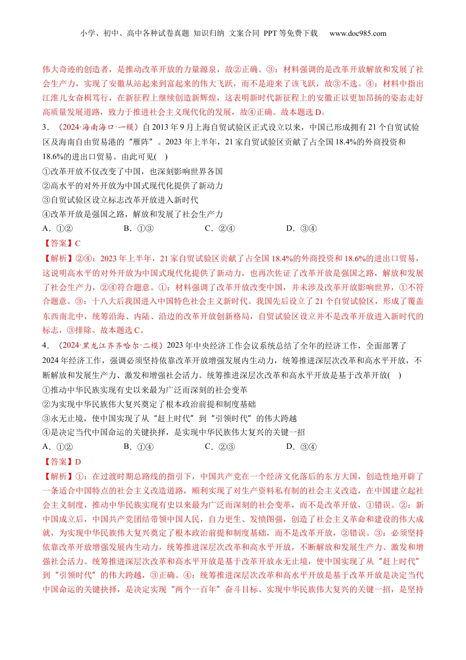 小学、初中、高中各种试卷真题知识归纳文案合同PPT等免费下载www.doc985.com第03讲只有中国特色社会主义才能发展中国目录模拟·基础演练...............................................................................................................1重难·创新演练...............................................................................................................7真题·实战演练.............................................................................................................15一、单项选择题1.(2024·辽宁沈阳·二模)改革开放以来,我们党立足社会主义初级阶段的基本国情,坚持解放思想、实事求是、与时俱进、求真务实,推动我国迈上了民族复兴伟业的新征程。全面推进强国建设必须坚持深化改革开放,这是因为改革开放()①以问题为导向,在科学谋划基础上破解发展难题②是强国之路,也是决定当代中国命运的关键一招③为开创中国特色社会主义提供了坚实的物质基础④是当代中国最鲜明的特色,改革开放没有完成时A.①②B.①③C.②④D.③④【答案】C【解析】①:在实践基础上,而不是科学谋划基础上,故①说法错误。②④:改革开放是强国之路,也是决定当代中国命运的关键一招;是当代中国最鲜明的特色,改革开放没有完成时,故②④正确。③:党在革命、建设时期取得的伟大成就为开创中国特色社会主义提供了坚实的物质基础,而不是改革开放,故③说法错误。故本题选C。2.(2024·安徽合肥·二模)改革开放以来,安徽发展实现总量居中、人均靠后向总量靠前、人均居中的历史性跨越在国家发展全局中的战略地位进一步凸显。江淮儿女奋楫笃行,加快打造三地一区,建设“”七个强省,在新征程上继续创造新辉煌。由此可见“”()①基于对前途命运的把握,改革开放从根本上改变了安徽发展方向②人民是改革开放伟大奇迹的创造者,是推动改革开放的力量源泉③在改革开放纵深推进中,安徽迎来从站起来到富起来的伟大飞跃④新时代新征程上的安徽正以更加昂扬的姿态走好高质量发展道路A.①③B.①④C.②③D.②④【答案】D【解析】①:新中国的成立改变了中国社会的发展方向,也从根本上改变了安徽的发展方向,故①错误。②:材料中指出江淮儿女奋楫笃行,加快打造三地一区,推动当地经济发展,这表明人民是改革开放“”小学、初中、高中各种试卷真题知识归纳文案合同PPT等免费下载www.doc985.com伟大奇迹的创造者,是推动改革开放的力量源泉,故②正确。③:材料强调的是改革开放解放和发展了社会生产力,实现了安徽从站起来到富起来的伟大飞跃,而不是迎来了该飞跃,故③不选。④:材料中指出江淮儿女奋楫笃行,在新征程上继续创造新辉煌,这表明新时代新征程上的安徽正以更加昂扬的姿态走好高质量发展道路,致力于推进社会主义现代化的发展,故④正确。故本题选D。3.(2024·海南海口·一模)自2013年9月上海自贸试验区正式设立以来,中国已形成拥有21个自贸试验区及海南自由贸易港的雁阵。“”2023年上半年,21家自贸试验区贡献了占全国18.4%的外商投资和18.6%的进出口贸易。由此可见()①改革开放不仅改变了中国,也深刻影响世界各国②高水平的对外开放为中国式现代化提供了新动力③自贸试验区设立标志改革开放进入新时代④改革开放是强国之路,解放和发展了社会生产力A.①②B.①③C.②④D.③④【答案】C【解析】②④:2023年上半年,21家自贸试验区贡献了占全国18.4%的外商投资和18.6%的进出口贸易,这说明高水平的对外开放为中国式现代化提供了新动力,也再次佐证了改革开放是强国之路,解放和发展了社会生产力,②④符合题意。①:材料强调了改革开放改变中国,并未涉及改革开放影响世界,①不符合题意。③:十八大后我国进入中国特色社会主义新时代。我国先后设立了21个自贸试验区,形成了覆盖东西南北中,统筹沿海、内陆、沿边的改革开放创新格局,自贸试验区设立并不是改革开放进入新时代的标志,③排除。故本题选C。4.(2024·黑龙江齐齐哈尔·二模)2023年中央经济工作会议系统总结了全年的经济工作,全面部署了2024年经...