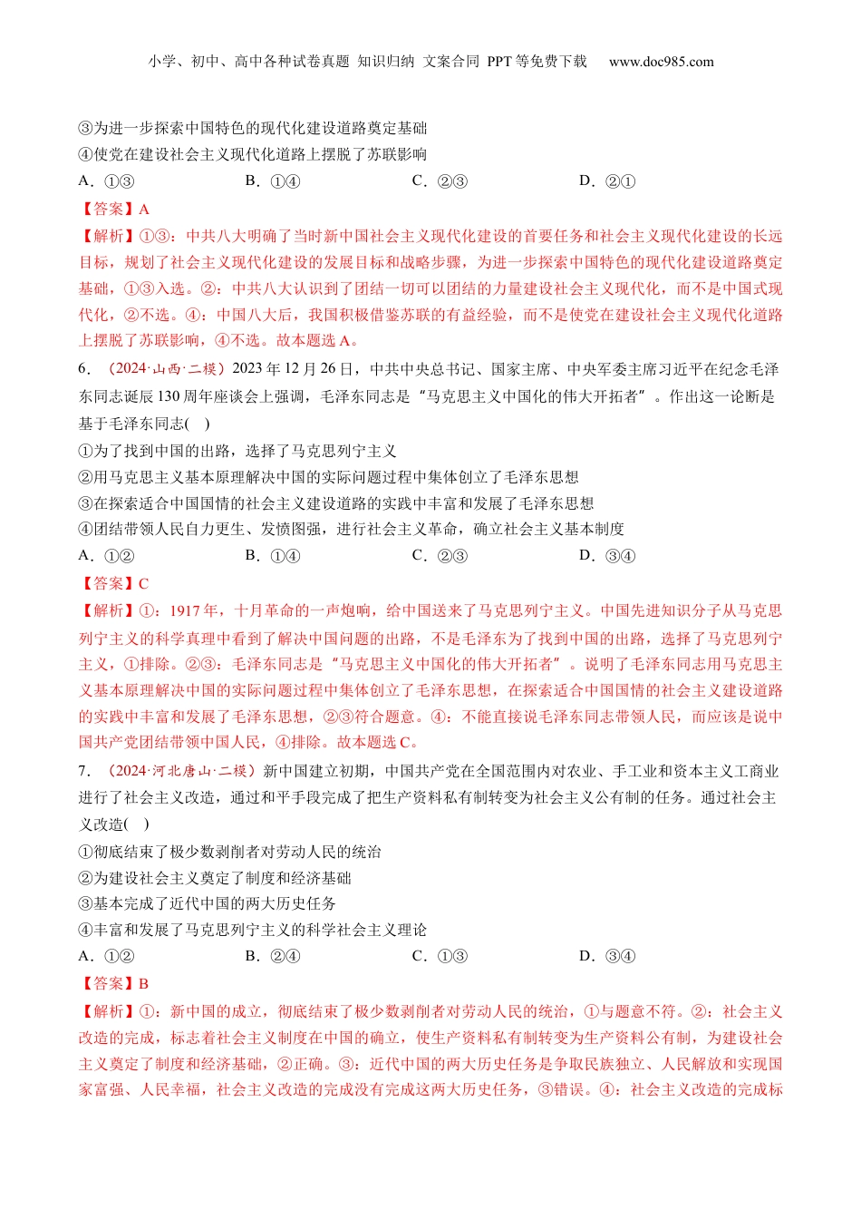 小学、初中、高中各种试卷真题知识归纳文案合同PPT等免费下载www.doc985.com第02讲只有社会主义才能救中国目录模拟·基础演练1重难·创新演练5真题·实战演练13一、单项选择题1.(2024·安徽淮北·二模)回看走过的路,探究科学社会主义发展的历程,我们才能更好地远眺前行的路。从历史逻辑和理论逻辑的角度看,对关于科学社会主义的发展认知正确的是()①揭露和批判资本主义的空想社会主义是科学社会主义的理论基石②1917年俄国爆发了十月革命建立了无产阶级政权和社会主义制度③毛泽东思想实现了马克思主义中国化时代化的第一次历史性飞跃④新中国成立后翻天覆地的变化证明了科学社会主义蓬勃的生命力A.①②B.①③C.②④D.③④【答案】D【解析】①:空想社会主义是科学社会主义的思想来源,剩余价值学说和唯物史观是科学社会主义的理论基石,①错误。②:1917年俄国十月革命建立了无产阶级政权,1936年,苏联通过了新宪法,宣布实现了社会主义,建立了社会主义制度,②错误。③:毛泽东思想是马克思主义与中国实际第一次伟大结合的理论产物,是马克思主义中国化时代化的第一次历史性飞跃,③正确。④:新中国成立后,中国共产党带领中国人民在实现中华民族伟大复兴历史进程中取得了翻天覆地的变化,以事实彰显了科学社会主义鲜活的生命力,④正确。故本题选D。2.(2024·湖南·二模)习近平总书记在中共中央政治局第十四次集体学习时指出,五四运动是一场以先进青年知识分子为先锋、广大人民群众参加的彻底反帝反封建的伟大爱国革命运动。五四运动对当代中国发展进步具有深远影响。关于这场伟大爱国革命运动的表述正确的是()①马克思列宁主义开始在中国传播②促进了马克思主义同中国工人运动的结合③为中国共产党成立做了思想上组织上的准备④孕育了以爱国、进步、民主、科学为主要内容的伟大五四精神“”A.①④B.②③C.②④D.③④【答案】C【解析】②④:五四运动孕育了以爱国、进步、民主、科学为主要内容的伟大五四精神,促进了马克“”小学、初中、高中各种试卷真题知识归纳文案合同PPT等免费下载www.doc985.com思主义在中国的传播,促进了马克思主义同中国工人运动的结合,是中国旧民主主义革命走向新民主主义革命的转折点,②④正确。①:十月革命一声炮响,给中国送来了马克思列宁主义,而不是五四运动使马克思列宁主义开始在中国传播,①错误。③:五四运动为中国共产党成立做了思想上干部上的准备,③错误。故本题选C。3.(2024·安徽蚌埠·三模)三十八年过去,弹指一挥间。可上九天揽月,可下五洋捉鳖,谈笑凯歌还。“世上无难事,只要肯登攀。”(《水调歌头·重上井冈山》)这首词写毛主席重上井冈山所见的景色及由此发出的感慨。透过这首词,我们可以感悟到()A.中国共产党应运而生,中国人民从此就有了主心骨B.经过浴血奋战和顽强奋斗,夺取了新民主主义革命的胜利C.建立起社会主义制度,实现了最为广泛而深刻的社会变革D.崭新课题没有现成答案,我国的社会主义在艰辛探索中前进【答案】D【解析】D:《水调歌头·重上井冈山》是毛泽东于1965年5月,重上井冈山所见的景色及由此发出的感慨。透过这首词,我们可以感悟到共产党人和革命人民所具有的藐视困难、敢于战胜困难的英雄气概和凌云壮志,折射了崭新课题没有现成答案,我国的社会主义在艰辛探索中前进,D正确。A:材料不涉及1921年中国共产党应运而生,A排除。B:材料不涉及1949年夺取新民主主义革命的胜利,B排除。C:材料不涉及1956年建立社会主义制度,实现了最为广泛而深刻的社会变革,C排除。故本题选D。4.(2024·河北保定·二模)土地改革运动,是解放战争时期中国共产党在广大解放区领导贫苦农民进行的大规模的土地制度改革运动,实行耕者有其田的土地制度。农业实行社会主义改造,大体上经历了从实行有少量公共财产的常年互助组,到实现土地入股、统一经营的初级社,再发展到实现集体公有制的高级社三个阶段。两者的共同点是()①把土地私有转化为土地集体所有②激发农民发展农业生产的积极性③发生在中华人民共和国建国后④对革命取得胜利起积极推动作用A.①②B.①③C.②④D.③④【...