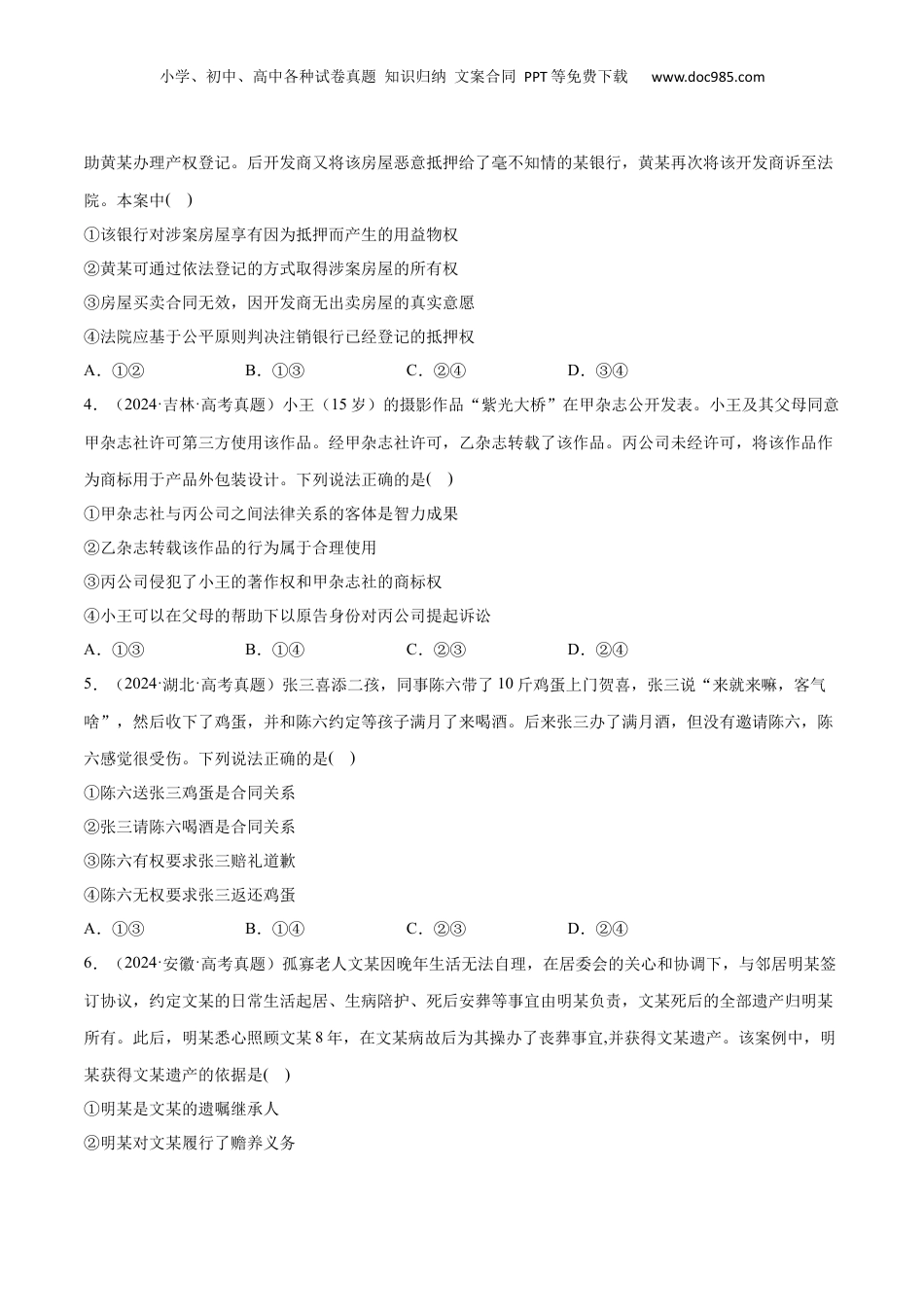 小学、初中、高中各种试卷真题知识归纳文案合同PPT等免费下载www.doc985.com必刷题高考真题系列选择性必修2《法律与生活》一、单项选择题1.(2024·北京·高考真题)一座理想的儿童友好城市应该是什么样的?如图展示了北京市儿童友好城市的“五个友好”。关于儿童友好城市建设,下列观点正确的是()①针对儿童群体的特殊优待和保护,属于特权,但并未违反平等原则②开通“通学公交线”体现了“服务友好”,强化了城市的基层自治③儿童参与社会公共事务的讨论,有助于“政策友好”“空间友好”等目标的实现④落实“五个友好”,维护儿童生存、发展、受保护和参与的权利,需要各方形成合力A.①②B.①③C.②④D.③④2.(2024·全国·高考真题)罗某以2000元从蔡某处购买山地自行车一辆,支付1000元后蔡某交付该车,双方约定余款1个月内付清。罗某又以120万元从开发商那里购买商品房一套,办理了房产转移登记,并取得不动产权属证书。据此,下列说法正确的是()①山地自行车已交付,罗某取得该车所有权②待余款付清后,罗某才取得该车的所有权③罗某取得该房所有权和所在地块的建设用地所有权④罗某取得该房所有权和所在地块的建设用地使用权A.①③B.①④C.②③D.②④3.(2024·湖南·高考真题)黄某为满足自住需求,向某开发商购买一套房产并签订了房屋买卖合同。黄某按约定履行了付款义务并入住,但该开发商未协助办理产权登记手续。黄某诉至法院,法院判决开发商协小学、初中、高中各种试卷真题知识归纳文案合同PPT等免费下载www.doc985.com助黄某办理产权登记。后开发商又将该房屋恶意抵押给了毫不知情的某银行,黄某再次将该开发商诉至法院。本案中()①该银行对涉案房屋享有因为抵押而产生的用益物权②黄某可通过依法登记的方式取得涉案房屋的所有权③房屋买卖合同无效,因开发商无出卖房屋的真实意愿④法院应基于公平原则判决注销银行已经登记的抵押权A.①②B.①③C.②④D.③④4.(2024·吉林·高考真题)小王(15岁)的摄影作品“紫光大桥”在甲杂志公开发表。小王及其父母同意甲杂志社许可第三方使用该作品。经甲杂志社许可,乙杂志转载了该作品。丙公司未经许可,将该作品作为商标用于产品外包装设计。下列说法正确的是()①甲杂志社与丙公司之间法律关系的客体是智力成果②乙杂志转载该作品的行为属于合理使用③丙公司侵犯了小王的著作权和甲杂志社的商标权④小王可以在父母的帮助下以原告身份对丙公司提起诉讼A.①③B.①④C.②③D.②④5.(2024·湖北·高考真题)张三喜添二孩,同事陈六带了10斤鸡蛋上门贺喜,张三说“来就来嘛,客气啥”,然后收下了鸡蛋,并和陈六约定等孩子满月了来喝酒。后来张三办了满月酒,但没有邀请陈六,陈六感觉很受伤。下列说法正确的是()①陈六送张三鸡蛋是合同关系②张三请陈六喝酒是合同关系③陈六有权要求张三赔礼道歉④陈六无权要求张三返还鸡蛋A.①③B.①④C.②③D.②④6.(2024·安徽·高考真题)孤寡老人文某因晚年生活无法自理,在居委会的关心和协调下,与邻居明某签订协议,约定文某的日常生活起居、生病陪护、死后安葬等事宜由明某负责,文某死后的全部遗产归明某所有。此后,明某悉心照顾文某8年,在文某病故后为其操办了丧葬事宜,并获得文某遗产。该案例中,明某获得文某遗产的依据是()①明某是文某的遗嘱继承人②明某对文某履行了赡养义务小学、初中、高中各种试卷真题知识归纳文案合同PPT等免费下载www.doc985.com③双方签订了遗赠扶养协议④明某对文某履行了扶养义务A.①②B.①④C.②③D.③④7.(2024·山东·高考真题)小张经其妻小陈同意,用婚后继承自张父的40万元遗产注册成立了甲公司。为购入公司经营所需设备,小张、小陈又向葛某借款100万元。后小张受伤住院,小陈接手甲公司经营,与小张协商将自家住房抵押给葛某,换取葛某同意延期还款。下列说法正确的是()①若小张和小陈约定由小张负责还款,则葛某仍有权要求小陈偿还②小陈不是张父的法定继承人,所以不享有处理40万元遗产的权利③葛某有权针对小张、小陈的住房和购入设备优先受偿,但无权予以占有④若甲公司对外负债,则该债务不构成...