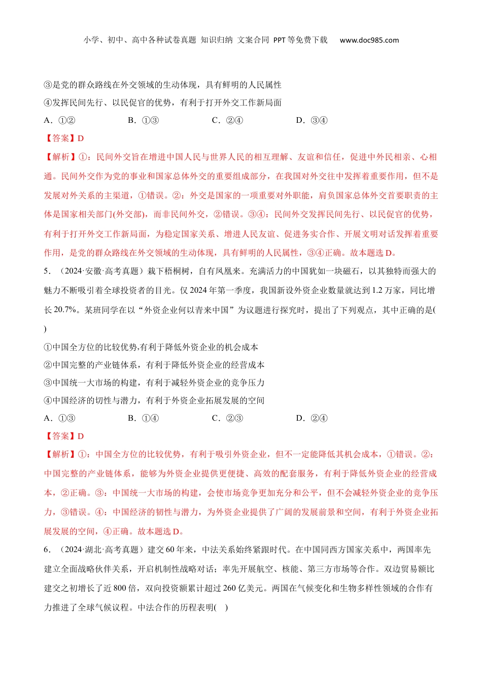 小学、初中、高中各种试卷真题知识归纳文案合同PPT等免费下载www.doc985.com必刷题高考真题系列选择性必修1《当代国际政治与经济》一、单项选择题1.(2024·安徽·高考真题)多极化已成为当今世界的基本趋势,中国倡导平等有序的世界多极化。平等的多极化,要体现各国权利平等、机会平等、规则平等,要确保国家不分大小、强弱,都能在多极化进程中平等参与、享受权利,发挥作用。为此,中国主张世界各国()①同等地享有主权国家权利,同等地承担国际责任②恪守国家主权平等的原则,推动国际关系民主化③立足国家共同利益开展外交,共同掌握人类命运④坚持共商共建共享的治理观,完善全球治理体系A.①②B.①③C.②④D.③④【答案】C【解析】①:主权国家享有的权利和承担的责任是依据国际法和自身的实际情况而定的,并非同等,①不选。②:恪守国家主权平等原则,有利于推动国际关系民主化,促进平等的多极化,②正确。③:国际关系的决定因素是国家利益,主权国家维护本国的国家利益是主权国家对外活动的出发点和落脚点,立足国家共同利益开展外交,共同掌握人类命运”说法不准确,③不选。④:坚持共商共建共享的治理观,完善全球治理体系,有助于实现平等有序的世界多极化,④正确。故本题选C。2.(2024·山东·高考真题)核电是减碳降污的重要贡献者。中国政府提出,到2025年核电装机容量达到7000万千瓦。法国总统宣布重振核电计划后,国民议会通过了《加速核能发展法案》。2023年12月,第28届联合国气候变化大会发布了和平发展核能的联合宣言、提出到2050年全球核电规模突破11亿千瓦。材料表明()①气候变化大会以多边主义推动防扩散领域共同安全②法国国民议会执行总统令以立法保障核电计划实施③各国在能源战略中拥有自主选择清洁能源的权利④和平安全利用核能有助于全球能源绿色低碳转型A.①②B.①③C.②④D.③④【答案】D小学、初中、高中各种试卷真题知识归纳文案合同PPT等免费下载www.doc985.com【解析】①:材料不涉及多边主义的问题,不能说明气候变化大会以多边主义推动防扩散领域共同安全,①与题意不符。②:法国实行三权分立原则,立法、行政和司法三种国家权力分别由不同机关掌握,各自独立行使、相互制约制衡,议会拥有的只是监督和限制法国总统的权力,因此“法国议会执行总统令立法”的说法错误,②错误。③:材料反映的是中法等国家在核电利用上都有各自的方案,这说明各国在能源战略中拥有自主选择清洁能源的权利,故③正确。④:核电是减碳降污的重要贡献者,第28届联合国气候变化大会发布了和平发展核能的联合宣言、提出到2050年全球核电规模突破11亿千瓦,这说明和平安全利用核能有助于全球能源绿色低碳转型,④正确。故本题选D。3.(2024·全国·高考真题)2023年2月,“中国复眼”二期项目开工建设。项目计划实现对千万公里外的小行星探测,拓展人类深空观察的边界,为近地小行星撞击防御和行星形成等世界前沿科学研究提供重要支撑。该项目的建设表明()①太空安全是国家主权安全的重要内容②中国综合国力增强助推太空开发利用③构建人类命运共同体离不开对地球安全的保护④太空安全是当今世界和平与发展面临的最大挑战A.①②B.①④C.②③D.③④【答案】C【解析】①:当今世界太空安全成为国家安全的重要支柱和组成部分,是国家主权安全的重要内容,但题干未体现太空安全是国家主权安全的重要内容,①不选。②:航天技术不仅是一个国家综合国力的体现,更是人类探索宇宙、认知自然、实现可持续发展的重要手段。“中国复眼”二期项目开工建设表明中国实综合国力增强助推太空开发利用,②正确。③:“中国复眼”二期项目开工建设,该项目拓展人类深空观察的边界,为近地小行星撞击防御和行星形成等世界前沿科学研究提供重要支撑,这表明构建人类命运共同体离不开对地球安全的保护,③应选。④:当今世界和平与发展面临主要挑战是霸权主义和强权政治,④错误。故本题选C。4.(2024·湖北·高考真题)国之交在于民相亲,民相亲在于心相通。习近平总书记指出:“人民友好是促进世界和平与发展的基础力量,是实现合作共赢的基本前提。”民间外交...