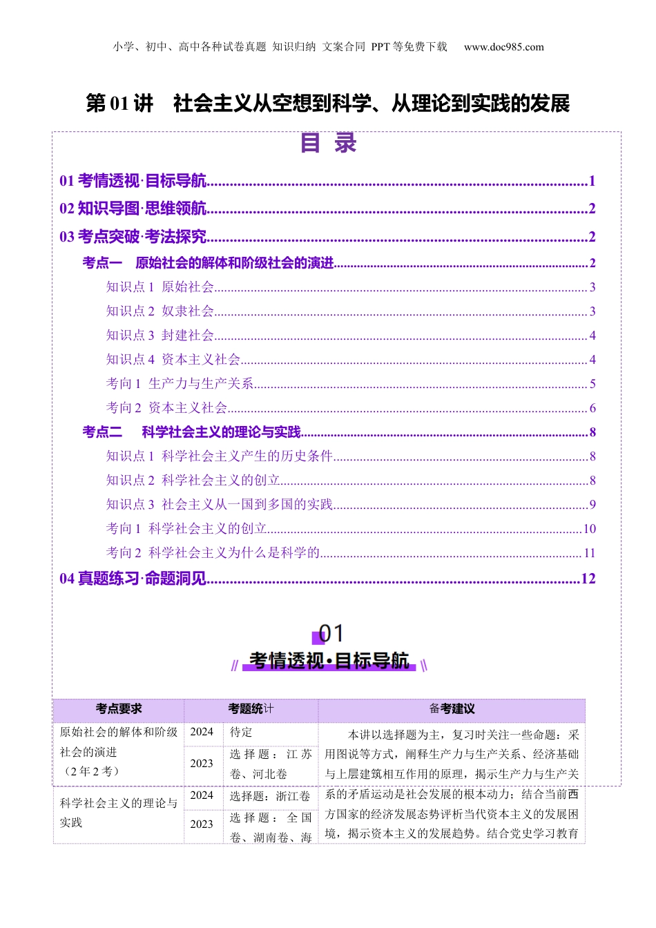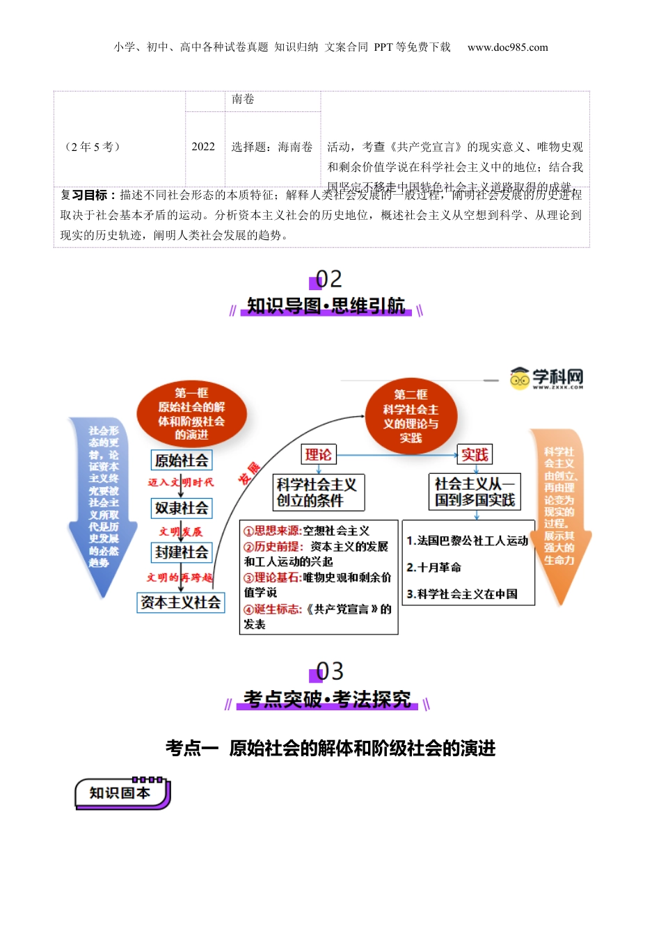 小学、初中、高中各种试卷真题知识归纳文案合同PPT等免费下载www.doc985.com第01讲社会主义从空想到科学、从理论到实践的发展目录01考情透视·目标导航...................................................................................................102知识导图·思维领航...................................................................................................203考点突破·考法探究...................................................................................................2考点一原始社会的解体和阶级社会的演进.............................................................................2知识点1原始社会.................................................................................................................3知识点2奴隶社会.................................................................................................................3知识点3封建社会.................................................................................................................4知识点4资本主义社会.........................................................................................................4考向1生产力与生产关系.....................................................................................................5考向2资本主义社会.............................................................................................................6考点二科学社会主义的理论与实践.......................................................................................8知识点1科学社会主义产生的历史条件.............................................................................8知识点2科学社会主义的创立.............................................................................................8知识点3社会主义从一国到多国的实践.............................................................................9考向1科学社会主义的创立...............................................................................................10考向2科学社会主义为什么是科学的...............................................................................1104真题练习·命题洞见.................................................................................................12考点要求考题统计考建议备原始社会的解体和阶级社会的演进(2年2考)2024待定本讲以选择题为主,复习时关注一些命题:采用图说等方式,阐释生产力与生产关系、经济基础与上建相互作用的原理,揭示生产力与生产关层筑系的矛盾运动是社会发展的根本动力;结合当前西方国家的经济发展态势评析当代资本主义的发展困境,揭示资本主义的发展趋势。结合党史学习教育2023选择题:江苏卷、河北卷科学社会主义的理论与实践2024选择题:浙江卷2023选择题:全国卷、湖南卷、海小学、初中、高中各种试卷真题知识归纳文案合同PPT等免费下载www.doc985.com(2年5考)南卷活动,考《共产党宣言》的现实意义、唯物史观查和剩余价值学说在科学社会主义中的地位;结合我国坚定不中国特色社会主义道路取得的成就,移走2022选择题:海南卷习目标:复描述不同社会形态的本质特征;解释人类社会发展的一般过程,阐明社会发展的历史进程取决于社会基本矛盾的运动。分析资本主义社会的历史地位,概述社会主义从空想到科学、从理论到现实的历史轨迹,阐明人类社会发展的趋势。考点一原始社会的解体和阶级社会的演进小学、初中、高中各种试卷真题知识归纳文案合同PPT等免费下载www.doc985.com知识点1原始社会地位人类社会发展的最初阶段,也是最低阶段生产力①绝大部分时间于处旧石器时代,人们主要以采集天然物为生食②距今一年前,人类进入了新石器时代,原始畜牧业和农业开始出...