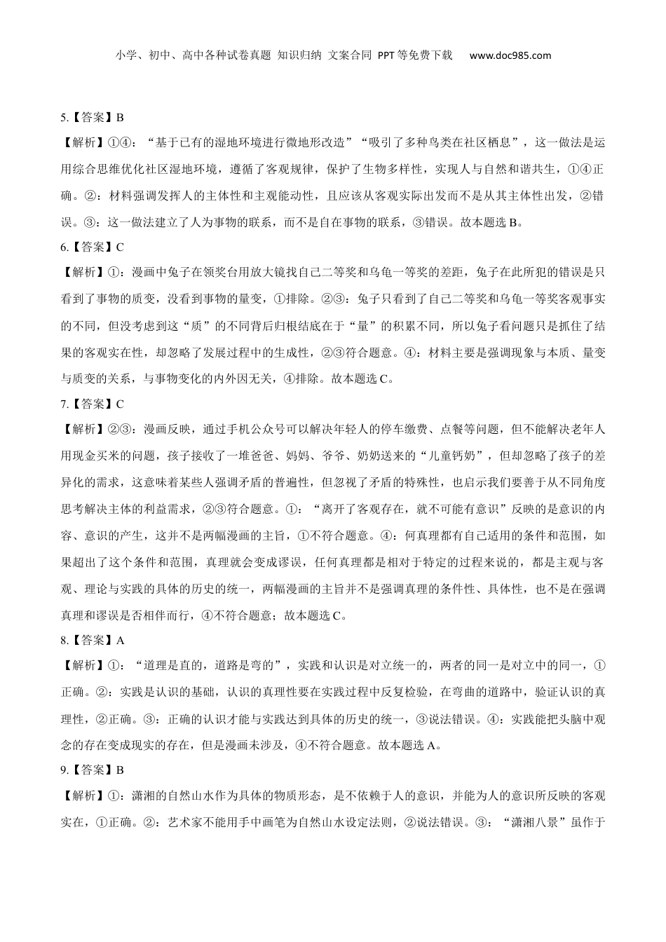 小学、初中、高中各种试卷真题知识归纳文案合同PPT等免费下载www.doc985.com必刷题高考真题系列必修4《哲学与文化》参考答案1.【答案】D【解析】①:《共产党宣言》第一次阐述了科学社会主义原理,①不选。②:马克思的功绩在于,“第一个把已经被遗忘的辩证方法……应用到一种经验科学即政治经济学的事实上去”,说明唯物辩证法是马克思研究政治经济学的方法,②正确。③:黑格尔辩证法是唯心的,马克思辩证法是唯物的,二者有本质区别,③说法错误。④:“第一个把已经被遗忘的辩证方法,它和黑格尔辩证法的联系以及差别重新提到人们面前”,说明马克思批判地吸收了黑格尔哲学的合理成分,④正确。故本题选D。2.【答案】C【解析】①:“魂脉”与“根脉”的思想来源不同,马克思主义来自西方,中华优秀传统文化是土生土长的中国文化,①错误。②:“魂脉”与“根脉”存在高度契合性,二者贯通融通,马克思主义中国化时代化,与中华优秀传统文化相结合,②正确。③:“魂脉”与“根脉”的结合推进了党的理论守正创新,使党的理论不断发展和完善,③正确。④:“魂脉”与“根脉”的结合为深化改革提供理论基础,而非物质基础,④错误。故本题选C。3.【答案】B【解析】①④:漫画显示,一个人出于好心帮别人打伞,但却遮住了被帮助人的眼睛,给被帮助人带来了麻烦,这启示我们不仅要肯做好事,还要会做好事,做好事时既要全面把握客观实际,尊重客观规律,又要正确发挥主观能动性,把正确发挥主观能动性和尊重客观规律相结合,①④符合题意。②:世界观和方法论都很重要,既要“肯做”,又要“会做”,二者不可偏废,②错误。③:我们要把“会做”和“肯做”结合起来,“会做”不是对“背做”的否定,③错误。故本题选B。4.【答案】A【解析】①②:影片中的行星发动机与中国环流器二号实验装置具有视觉相似性;运送核聚变燃料的巨车,让人联想到中国生产的巨型矿车;展示太空天梯的长镜头,说明任何意识包括幻想都是对客观存在的反映,意识对客观存在的反映是自觉的和创造性的,①②正确。③:意识来源于客观存在,但意识与客观存在不一定是相符合、相一致的,正确的意识才与客观存在相符合、相一致,③说法错误。④:意识反映客观存在的形式具有主观性,但也并不是人完全自由选择、与意识的内容无关的,也会受到客观条件的制约,④说法错误。故本题选A。小学、初中、高中各种试卷真题知识归纳文案合同PPT等免费下载www.doc985.com5.【答案】B【解析】①④:“基于已有的湿地环境进行微地形改造”“吸引了多种鸟类在社区栖息”,这一做法是运用综合思维优化社区湿地环境,遵循了客观规律,保护了生物多样性,实现人与自然和谐共生,①④正确。②:材料强调发挥人的主体性和主观能动性,且应该从客观实际出发而不是从其主体性出发,②错误。③:这一做法建立了人为事物的联系,而不是自在事物的联系,③错误。故本题选B。6.【答案】C【解析】①:漫画中兔子在领奖台用放大镜找自己二等奖和乌龟一等奖的差距,兔子在此所犯的错误是只看到了事物的质变,没看到事物的量变,①排除。②③:兔子只看到了自己二等奖和乌龟一等奖客观事实的不同,但没考虑到这“质”的不同背后归根结底在于“量”的积累不同,所以兔子看问题只是抓住了结果的客观实在性,却忽略了发展过程中的生成性,②③符合题意。④:材料主要是强调现象与本质、量变与质变的关系,与事物变化的内外因无关,④排除。故本题选C。7.【答案】C【解析】②③:漫画反映,通过手机公众号可以解决年轻人的停车缴费、点餐等问题,但不能解决老年人用现金买米的问题,孩子接收了一堆爸爸、妈妈、爷爷、奶奶送来的“儿童钙奶”,但却忽略了孩子的差异化的需求,这意味着某些人强调矛盾的普遍性,但忽视了矛盾的特殊性,也启示我们要善于从不同角度思考解决主体的利益需求,②③符合题意。①:“离开了客观存在,就不可能有意识”反映的是意识的内容、意识的产生,这并不是两幅漫画的主旨,①不符合题意。④:何真理都有自己适用的条件和范围,如果超出了这个条件和范围,真理就会变成谬误,任何真理都是相对于特定的过程来说的,都是...