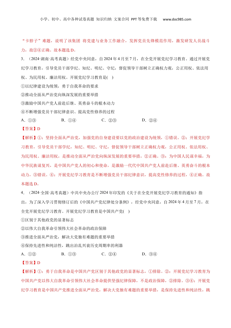 小学、初中、高中各种试卷真题知识归纳文案合同PPT等免费下载www.doc985.com必刷题高考真题系列必修3《政治与法治》一、单项选择题1.(2024·全国·高考真题)2023年12月,中共中央修订《中国共产党纪律处分条例》,要求从严抓好党的纪律建设。经党中央同意,自2024年4月至7月,在全党开展党纪学习教育,引导党员干部学纪、知纪、明纪、守纪。深入开展党纪学习教育()①反映了党要依靠法律管党治党,建设高素质干部队伍②彰显了党推进自我革命、走好新的赶考之路的决心和意志③体现了党坚持以纪律建设为统领,不断提高党的建设质量④有利于解决大党独有难题,保持和巩固党的长期执政地位A.①③B.①④C.②③D.②④【答案】D【解析】①:《中国共产党纪律处分条例》属于党内法规,不属于法律,①排除。②:引导党员干部学纪、知纪、明纪、守纪,说明深入开展党纪学习教育彰显了党推进自我革命、走好新的赶考之路的决心和意志,②正确。③:全面从严治党以政治建设为统领,③排除。④:深入开展党纪学习教育有利于解决大党独有难题,保持和巩固党的长期执政地位,④正确。故本题选D。2.(2024·吉林·高考真题)某国有科技产业集团为破解关键设备核心技术“卡脖子”难题,成立由集团党委牵头的专项工作领导小组,将党组织建在产业链上,组建以党员为核心的攻坚团队,以党建共建为牵引,对项目重大节点统一调度,设备最终研制成功。这表明该集团()①完善党的领导制度体系,实现资源的有效整合②发挥党员先锋模范作用,激发研发人员战斗力③以党的组织建设为统领,保障设备的研制成功④将党建与业务工作融合,为攻坚克难凝心聚力A.①③B.①④C.②③D.②④【答案】D【解析】①:材料强调的是加强党建,充分发挥党员先锋模范作用,故①排除。③:应以党的政治建设为统领,故③排除。②④:将党组织建在产业链上,组建以党员为核心的攻坚团队破解关键设备核心技术小学、初中、高中各种试卷真题知识归纳文案合同PPT等免费下载www.doc985.com“卡脖子”难题,说明了该集团将党建与业务工作融合,发挥党员先锋模范作用,激发研发人员战斗力,故②④正确。故本题选D。3.(2024·湖南·高考真题)经党中央同意,自2024年4月至7月,在全党开展党纪学习教育。通过开展党纪学习教育,引导党员干部学纪、知纪、明纪、守纪,督促领导干部树立正确权力观,公正用权、依法用权、为民用权、廉洁用权。开展党纪学习教育是()①以纪律建设为统领,勇于自我革命的要求②推动全面从严治党向纵深发展的重要举措③激励中国共产党人前赴后继、英勇奋斗的根本动力④不断增强党员干部纪律意识、提高党性修养的过程A.①③B.①④C.②③D.②④【答案】D【解析】①:坚持全面从严治党,加强党的自身建设要以党的政治建设为统领,①错误。②:开展党纪学习教育,引导党员干部学纪,知纪、明纪、守纪,督促领导干部树立正确权力观,公正用权、依法用权、为民用权、廉洁用权,是推动全面从严治党向纵深发展的重要举措,②正确。③:为中国人民谋幸福,为中华民族谋复兴,是中国共产党人的初心和使命,是激励一代代中国共产党人前赴后继、英勇奋斗的根本动力,③错误。④:开展党纪学习教育是不断增强党员干部纪律意识,提高党性修养的过程,④正确。故本题选D。4.(2024·全国·高考真题)中共中央办公厅2024年印发的《关于在全党开展党纪学习教育的通知》指出,为了深入学习贯彻修订后的《中国共产党纪律处分条例》,经党中央同意,自2024年4月至7月,在全党开展党纪学习教育。开展党纪学习教育是中国共产党()①区别于其他政党的显著标志②以伟大自我革命引领伟大社会革命的政治保障③推进全面从严治党,解决大党独有难题的重要举措④保持先进性和纯洁性,跳出治乱兴衰历史周期率的利器A.①②B.①③C.②④D.③④【答案】D【解析】①:勇于自我革命是中国共产党区别于其他政党的显著标志,①排除。②:开展党纪学习教育为中国共产党以伟大自我革命引领伟大社会革命提供坚强纪律保障,不是政治保障,②排除。③④:开展党纪学习教育是中国共产党推进全面从严治党,解决大党独有难题的重要举措,是保持先...
