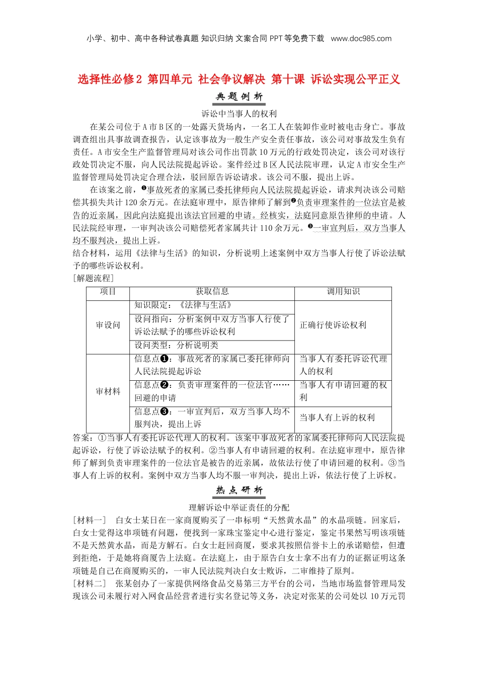 小学、初中、高中各种试卷真题知识归纳文案合同PPT等免费下载www.doc985.com选择性必修2第四单元社会争议解决第十课诉讼实现公平正义诉讼中当事人的权利在某公司位于A市B区的一处露天货场内,一名工人在装卸作业时被电击身亡。事故调查组出具事故调查报告,认定该事故为一般生产安全责任事故,该公司对事故发生负有责任。A市安全生产监督管理局对该公司作出罚款10万元的行政处罚决定,该公司对该行政处罚决定不服,向人民法院提起诉讼。案件经过B区人民法院审理,认定A市安全生产监督管理局处罚决定合理合法,驳回原告诉讼请求。该公司不服,提出上诉。在该案之前,❶事故死者的家属已委托律师向人民法院提起诉讼,请求判决该公司赔偿其损失共计120余万元。在法庭审理中,原告律师了解到❷负责审理案件的一位法官是被告的近亲属,因此向法庭提出该法官回避的申请。经核实,法庭同意原告律师的申请。人民法院经审理,一审判决该公司赔偿死者家属共计110余万元。❸一审宣判后,双方当事人均不服判决,提出上诉。结合材料,运用《法律与生活》的知识,分析说明上述案例中双方当事人行使了诉讼法赋予的哪些诉讼权利。[解题流程]项目获取信息调用知识审设问知识限定:《法律与生活》正确行使诉讼权利设问指向:分析案例中双方当事人行使了诉讼法赋予的哪些诉讼权利设问类型:分析说明类审材料信息点❶:事故死者的家属已委托律师向人民法院提起诉讼当事人有委托诉讼代理人的权利信息点❷:负责审理案件的一位法官……回避的申请当事人有申请回避的权利信息点❸:一审宣判后,双方当事人均不服判决,提出上诉当事人有上诉的权利答案:①当事人有委托诉讼代理人的权利。该案中事故死者的家属委托律师向人民法院提起诉讼,行使了诉讼法赋予的权利。②当事人有申请回避的权利。在法庭审理中,原告律师了解到负责审理案件的一位法官是被告的近亲属,故依法行使了申请回避的权利。③当事人有上诉的权利。案例中双方当事人均不服一审判决,提出上诉,依法行使了上诉权。理解诉讼中举证责任的分配[材料一]白女士某日在一家商厦购买了一串标明“天然黄水晶”的水晶项链。回家后,白女士觉得这串项链有问题,便找到一家珠宝鉴定中心进行鉴定,鉴定书果然写明该项链不是天然黄水晶,而是方解石。白女士赶回商厦,要求其按照信誉卡上的承诺赔偿,但遭到拒绝,于是她将商厦告上法庭。在法庭上,由于原告白女士拿不出有力的证据证明这条项链是自己在商厦购买的,一审人民法院判决白女士败诉,二审维持了原判。[材料二]张某创办了一家提供网络食品交易第三方平台的公司,当地市场监督管理局发现该公司未履行对入网食品经营者进行实名登记等义务,决定对张某的公司处以10万元罚小学、初中、高中各种试卷真题知识归纳文案合同PPT等免费下载www.doc985.com款。张某对此处罚不服,于是将市场监督管理局诉至人民法院。【命题视角】命题视角1材料一中白女士为什么会败诉?在本案诉讼过程中,为什么要由原告出示有力的证据?提示:①当事人有责任对自己的诉讼主张负责,依法承担提供证据的责任,来证明自己的诉讼主张。如果提供不出证据或证据不足,就要承担败诉的风险。本案中白女士没能为自己的主张提供证据,所以败诉。②本案属于民事诉讼。民事诉讼实行“谁主张,谁举证”的举证原则。因此,原告白女士有责任对其诉讼主张提供证据。命题视角2在材料二的案例中,谁应该承担举证责任?为什么?提示:在材料二的案例中,市场监督管理局应该承担举证责任。因为本案属于行政诉讼,行政诉讼的核心问题是行政机关的行政行为是否合法,而行政相对人在举证能力上无法与行政机关抗衡。因此,作为被告的行政机关应当承担举证责任。