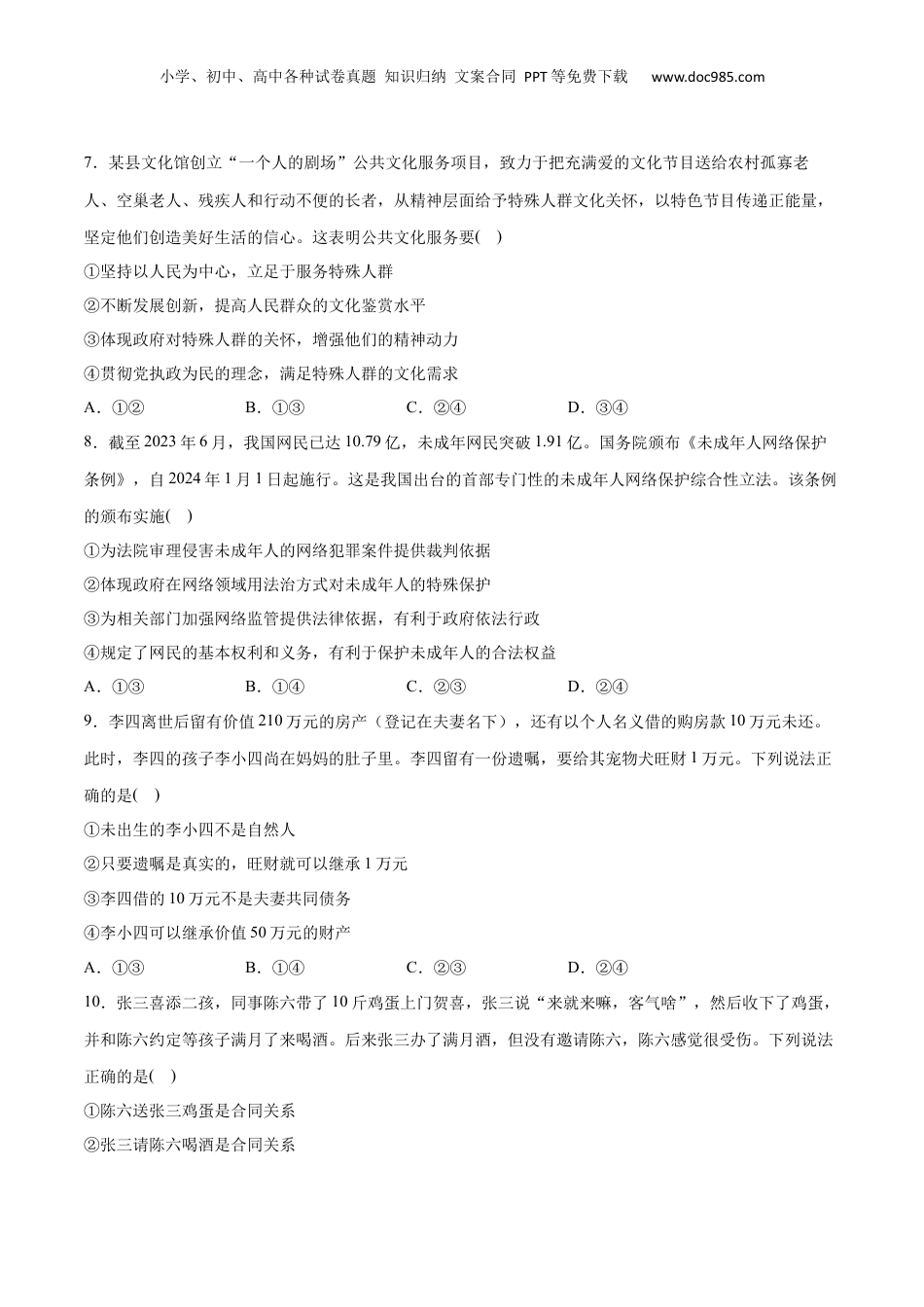 小学、初中、高中各种试卷真题知识归纳文案合同PPT等免费下载www.doc985.com必刷题高考真题系列3年真题湖北卷2024湖北高考政治真题1.我们即将迎来祖国75周年华诞。经过不懈奋斗,中国由一穷二白到全面小康,如今已踏上以中国式现代化全面推进强国建设、民族复兴的新征程。建国以来的经济建设实践证明:生产关系一定要与生产力发展要求相适应。以下对此做出正确诠释的是()①实行家庭联产承包责任制,促进了粮食增产农民增收②鼓励非公有制经济发展,唤醒了很多人的创业梦想③农村“三权分置”改革,推动了基层社会治理的完善④科技创新赋能产业发展,让新能源汽车走俏世界A.①②B.①④C.②③D.③④2.现如今买了电器,有故障需要维修时,常会遇到保修附加条件多、小病大修、乱收费等花式套路,让消费者感到买得起修不起,既“头疼”又“心疼”。为解决这一问题,需要政府()①加强监管,增加行业透明度②反垄断,打击不正当竞争③建立国有家电维修连锁企业,做好便民服务④引导行业协会发挥自律作用,倡导诚信经营A.①③B.①④C.②③D.②④3.下表反映了2023年我国城乡居民人均可支配收入及其来源结构情况。统计指标收入主体人均可支配收入按收入来源分工资性收入经营净收入财产净收入转移净收入收入绝对量(元)城镇居民5182131321590353929205农村居民21691916374315404557收入较上年名义增速城镇居民5.1%5.9%5.7%2.9%3.6%农村居民7.7%8.4%6.6%6.0%8.4%据此可以推断出()小学、初中、高中各种试卷真题知识归纳文案合同PPT等免费下载www.doc985.com①经营净收入是农村居民最大的收入来源②城乡居民人均可支配收入比值较上年有所上升③经济回升向好,农民外出务工形势好转④与农村居民相比,城镇居民的财产净收入占比更高A.①②B.①③C.②④D.③④4.2023年,中国贡献了超过一半的全球可再生能源新增装机容量。中国出口风电、光伏产品到200多个国家和地区,帮助他们获得清洁、可靠、用得起的能源。过去10年,全球风电和光伏发电项目平均每度电成本分别累计下降超过60%和80%,主要归功于中国创新、中国制造、中国工程。这表明()①风电和光伏发电相比水电和火电更具有成本优势②中国为全球可再生能源发电的增长做出了巨大贡献③发展中国家已广泛普及可再生能源发电产品和技术④中国对全球绿色发展的贡献得益于科技和工业实力的增强A.①②B.①③C.②④D.③④5.国之交在于民相亲,民相亲在于心相通。习近平总书记指出:“人民友好是促进世界和平与发展的基础力量,是实现合作共赢的基本前提。”民间外交作为党的事业和国家总体外交的重要组成部分,为稳定国家关系、增进人民友谊、促进务实合作、开展文明对话发挥着重要作用。民间外交()①是发展对外关系的主渠道,旨在增进国际交往与合作②肩负着国家总体外交的首要职责,促进了中外民心相通③是党的群众路线在外交领域的生动体现,具有鲜明的人民属性④发挥民间先行、以民促官的优势,有利于打开外交工作新局面A.①②B.①③C.②④D.③④6.建交60年来,中法关系始终紧跟时代。在中国同西方国家关系中,两国率先建立全面战略伙伴关系,开启机制性战略对话;率先开展航空、核能、第三方市场等合作。双边贸易额比建交之初增长了近800倍,双向投资额累计超过260亿美元。两国在气候变化和生物多样性领域的合作有力推进了全球气候议程。中法合作的历程表明()①两国通过加强沟通协作,共促世界和平发展②两国经济合作领域广泛,助推经济全球化发展③两国的经贸关系维护了多元稳定的国际经济新格局④两国的战略联盟为解决全球性挑战发挥了引领性作用A.①②B.①③C.②④D.③④小学、初中、高中各种试卷真题知识归纳文案合同PPT等免费下载www.doc985.com7.某县文化馆创立“一个人的剧场”公共文化服务项目,致力于把充满爱的文化节目送给农村孤寡老人、空巢老人、残疾人和行动不便的长者,从精神层面给予特殊人群文化关怀,以特色节目传递正能量,坚定他们创造美好生活的信心。这表明公共文化服务要()①坚持以人民为中心,立足于服务特殊人群②不断发展创新,提高人民群众的文化鉴赏水平③体现政府对特殊人群的关怀,增...