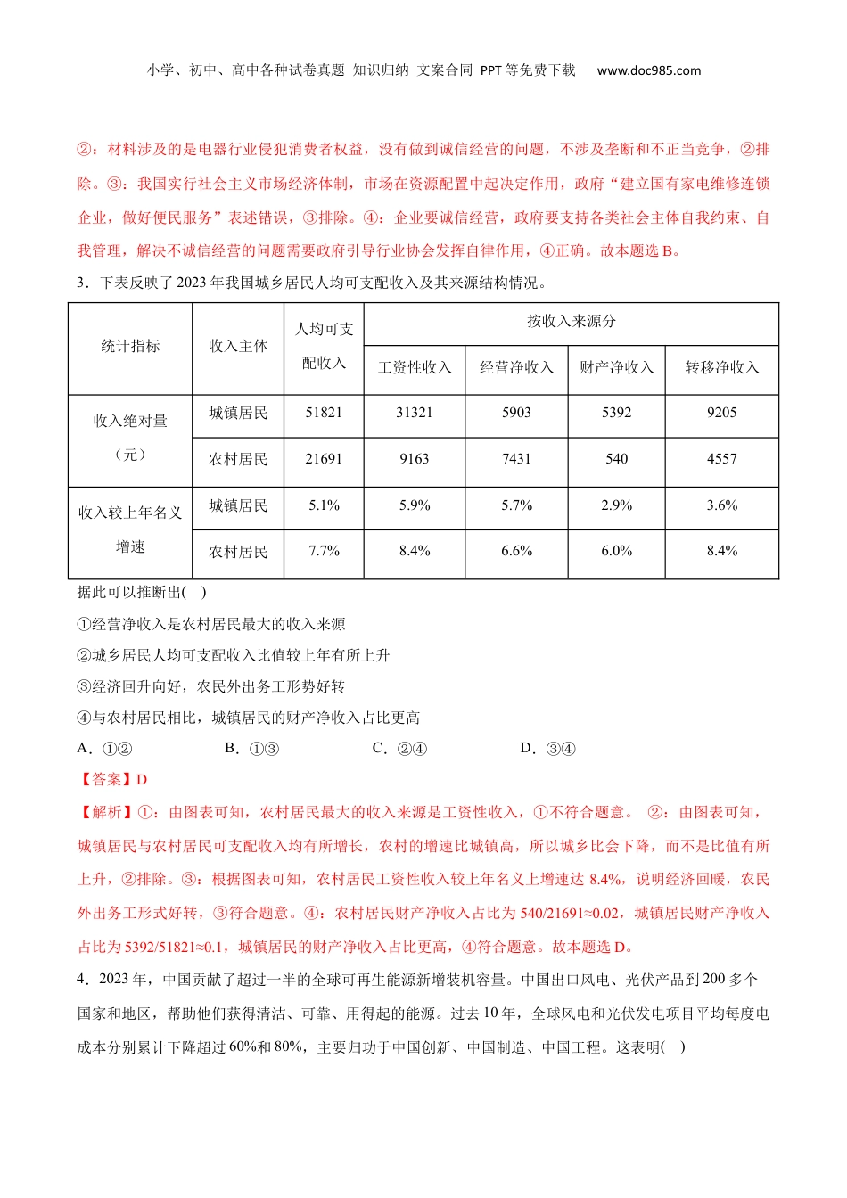 小学、初中、高中各种试卷真题知识归纳文案合同PPT等免费下载www.doc985.com必刷题高考真题系列3年真题湖北卷2024湖北高考政治真题1.我们即将迎来祖国75周年华诞。经过不懈奋斗,中国由一穷二白到全面小康,如今已踏上以中国式现代化全面推进强国建设、民族复兴的新征程。建国以来的经济建设实践证明:生产关系一定要与生产力发展要求相适应。以下对此做出正确诠释的是()①实行家庭联产承包责任制,促进了粮食增产农民增收②鼓励非公有制经济发展,唤醒了很多人的创业梦想③农村“三权分置”改革,推动了基层社会治理的完善④科技创新赋能产业发展,让新能源汽车走俏世界A.①②B.①④C.②③D.③④【答案】A【解析】①:实行家庭联产承包责任制属于生产关系的调整,促进了粮食增产农民增收,体现了生产关系一定要与生产力发展要求相适应,①正确。②:鼓励非公有制经济发展是我国生产资料所有制的完善,属于生产关系的调整,唤醒了很多人的创业梦想体现了生产关系一定要与生产力发展要求相适应,②正确。③:农村“三权分置”改革虽然属于生产关系的调整,但“基层社会治理的完善”不属于生产力的范畴,二者之间,无直接因果关系,③排除。④:科技创新赋能产业发展,让新能源汽车走俏世界,体现的是生产力的发展,不涉及生产关系的调整,④排除。故本题选A。2.现如今买了电器,有故障需要维修时,常会遇到保修附加条件多、小病大修、乱收费等花式套路,让消费者感到买得起修不起,既“头疼”又“心疼”。为解决这一问题,需要政府()①加强监管,增加行业透明度②反垄断,打击不正当竞争③建立国有家电维修连锁企业,做好便民服务④引导行业协会发挥自律作用,倡导诚信经营A.①③B.①④C.②③D.②④【答案】B【解析】①:“有故障需要维修时,常会遇到保修附加条件多、小病大修、乱收费等花式套路”,这体现了单纯市场调节的自发性,要更好发挥政府作用,因此需要政府加强监管,增加行业透明度,①正确。小学、初中、高中各种试卷真题知识归纳文案合同PPT等免费下载www.doc985.com②:材料涉及的是电器行业侵犯消费者权益,没有做到诚信经营的问题,不涉及垄断和不正当竞争,②排除。③:我国实行社会主义市场经济体制,市场在资源配置中起决定作用,政府“建立国有家电维修连锁企业,做好便民服务”表述错误,③排除。④:企业要诚信经营,政府要支持各类社会主体自我约束、自我管理,解决不诚信经营的问题需要政府引导行业协会发挥自律作用,④正确。故本题选B。3.下表反映了2023年我国城乡居民人均可支配收入及其来源结构情况。统计指标收入主体人均可支配收入按收入来源分工资性收入经营净收入财产净收入转移净收入收入绝对量(元)城镇居民5182131321590353929205农村居民21691916374315404557收入较上年名义增速城镇居民5.1%5.9%5.7%2.9%3.6%农村居民7.7%8.4%6.6%6.0%8.4%据此可以推断出()①经营净收入是农村居民最大的收入来源②城乡居民人均可支配收入比值较上年有所上升③经济回升向好,农民外出务工形势好转④与农村居民相比,城镇居民的财产净收入占比更高A.①②B.①③C.②④D.③④【答案】D【解析】①:由图表可知,农村居民最大的收入来源是工资性收入,①不符合题意。②:由图表可知,城镇居民与农村居民可支配收入均有所增长,农村的增速比城镇高,所以城乡比会下降,而不是比值有所上升,②排除。③:根据图表可知,农村居民工资性收入较上年名义上增速达8.4%,说明经济回暖,农民外出务工形式好转,③符合题意。④:农村居民财产净收入占比为540/21691≈0.02,城镇居民财产净收入占比为5392/51821≈0.1,城镇居民的财产净收入占比更高,④符合题意。故本题选D。4.2023年,中国贡献了超过一半的全球可再生能源新增装机容量。中国出口风电、光伏产品到200多个国家和地区,帮助他们获得清洁、可靠、用得起的能源。过去10年,全球风电和光伏发电项目平均每度电成本分别累计下降超过60%和80%,主要归功于中国创新、中国制造、中国工程。这表明()小学、初中、高中各种试卷真题知识归纳文案合同PPT等免费下载www.doc985.com①风电和光伏发电相比水电和火...