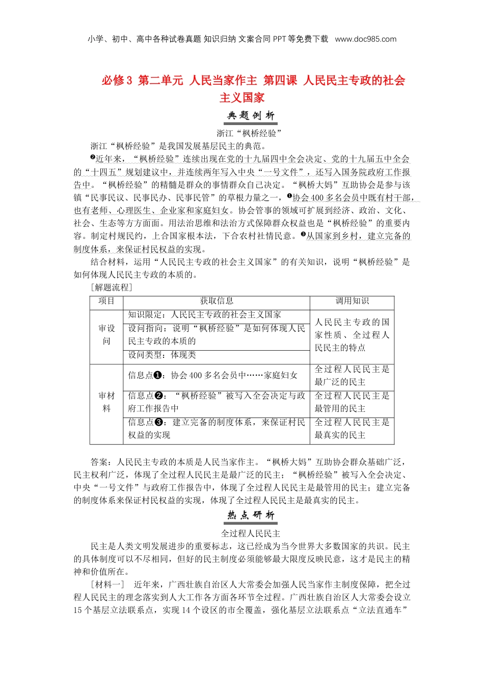 小学、初中、高中各种试卷真题知识归纳文案合同PPT等免费下载www.doc985.com必修3第二单元人民当家作主第四课人民民主专政的社会主义国家浙江“枫桥经验”浙江“枫桥经验”是我国发展基层民主的典范。❷近年来,“枫桥经验”连续出现在党的十九届四中全会决定、党的十九届五中全会的“十四五”规划建议中,并连续两年写入中央“一号文件”,还写入国务院政府工作报告中。“枫桥经验”的精髓是群众的事情群众自己决定。“枫桥大妈”互助协会是参与该镇“民事民议、民事民办、民事民管”的草根力量之一,❶协会400多名会员中既有村干部,也有老师、心理医生、企业家和家庭妇女。协会管事的领域可扩展到经济、政治、文化、社会、生态等方方面面。用法治思维和法治方式保障群众权益也是“枫桥经验”的重要内容。制定村规民约,上合国家根本法,下合农村社情民意。❸从国家到乡村,建立完备的制度体系,来保证村民权益的实现。结合材料,运用“人民民主专政的社会主义国家”的有关知识,说明“枫桥经验”是如何体现人民民主专政的本质的。[解题流程]项目获取信息调用知识审设问知识限定:人民民主专政的社会主义国家人民民主专政的国家性质、全过程人民民主的特点设问指向:说明“枫桥经验”是如何体现人民民主专政的本质的设问类型:体现类审材料信息点❶:协会400多名会员中……家庭妇女全过程人民民主是最广泛的民主信息点❷:“枫桥经验”被写入全会决定与政府工作报告中全过程人民民主是最管用的民主信息点❸:建立完备的制度体系,来保证村民权益的实现全过程人民民主是最真实的民主答案:人民民主专政的本质是人民当家作主。“枫桥大妈”互助协会群众基础广泛,民主权利广泛,体现了全过程人民民主是最广泛的民主;“枫桥经验”被写入全会决定、中央“一号文件”与政府工作报告中,体现了全过程人民民主是最管用的民主;建立完备的制度体系来保证村民权益的实现,体现了全过程人民民主是最真实的民主。全过程人民民主民主是人类文明发展进步的重要标志,这已经成为当今世界大多数国家的共识。民主的具体制度可以不尽相同,但好的民主制度必须能够最大限度反映民意,这才是民主的精神和价值所在。[材料一]近年来,广西壮族自治区人大常委会加强人民当家作主制度保障,把全过程人民民主的理念落实到人大工作各方面各环节全过程。广西壮族自治区人大常委会设立15个基层立法联系点,实现14个设区的市全覆盖,强化基层立法联系点“立法直通车”小学、初中、高中各种试卷真题知识归纳文案合同PPT等免费下载www.doc985.com作用;制定出台关于发展全过程人民民主完善工作机制的实施意见,提出30条要求和措施,并专门召开全区性的专题视频会议进行解读,从制度层面和实践层面推动人民民主落实到决策、管理、监督的全过程;丰富“开门监督”形式,推动解决制约经济社会发展的突出矛盾和问题,努力使人大监督的过程成为发现和解决问题、推动和促进发展的过程。[材料二]广西壮族自治区阳朔县积极发挥人大代表的作用,按照“标准化、品牌化、常态化”要求推进人大代表联络站建设,完善基础设施和工作制度,抓场所“标准化”建设,抓经验“品牌化”推广,抓活动“常态化”开展,在“建、管、用”三方面下足功夫让小站点提供“大服务”,使其成为人大代表履职为民的“新阵地”。贵州省黔东南苗族侗族自治州麻江县始终坚持协商于民、协商为民,把“有事好商量,众人的事情众人办”作为检验标尺,把“解决好人民群众的操心事、烦心事、揪心事”作为一切工作的出发点和落脚点,着力协商解决基层的实际困难,实现了在群众中议事、在协商中成事。浙江省杭州市临安区在辖区内村社打造“民生议事堂”平台,通过村民、干部、乡贤等多方代表现场协商,将民意转化为对策建议和服务项目,全面推进基层工作,着力提升村社基层民主水平。【命题视角】命题视角1结合材料一并运用人民民主专政的知识,说明广西壮族自治区人大立法过程中是如何体现全过程人民民主的。提示:人民民主是社会主义的生命。我国的全过程人民民主,是全链条、全方位、全覆盖的民主。全过程人民民主是最广泛的民主,广西壮族自治区人大常...