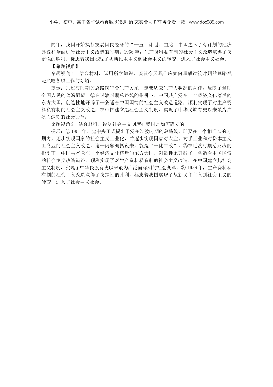 小学、初中、高中各种试卷真题知识归纳文案合同PPT等免费下载www.doc985.com必修1第二课只有社会主义才能救中国中华人民共和国成立中国共产党领导全国各族人民,❶推翻了压在人民头上的帝国主义、封建主义和官僚资本主义三座大山,取得了新民主主义革命的胜利并建立了中华人民共和国。1949年10月1日,毛泽东同志在天安门城楼上主持开国大典,向全世界宣告中华人民共和国成立。中华人民共和国的成立,开辟了中国历史的新纪元。从此,❷中国结束了一百多年来被侵略被奴役的屈辱历史,真正成了独立自主的国家。❸中国人民从此站起来了,成为国家的主人。中华人民共和国的成立,❹壮大了世界和平、民主和社会主义的力量,鼓舞和推动了世界被压迫民族和被压迫人民争取解放的斗争。结合材料,运用只有社会主义才能救中国的知识,说明中华人民共和国成立的意义。[解题流程]项目获取信息调用知识审设问知识限定:只有社会主义才能救中国中华人民共和国成立的意义设问指向:说明中华人民共和国成立的意义设问类型:意义类审材料信息点❶:推翻了三座大山实现了中国从几千年封建专制政治向人民民主的伟大飞跃信息点❷:结束了一百多年来的屈辱历史彻底废除了列强强加给中国的不平等条约和帝国主义在中国的一切特权信息点❸:中国人民成为国家的主人从根本上改变了中国社会的发展方向信息点❹:壮大了世界和平……解放的斗争改变了世界政治力量的对比答案:①推翻了压在人民头上的三座大山,实现了中国从几千年封建专制政治向人民民主的伟大飞跃。②彻底结束了旧中国半殖民地半封建社会的历史,彻底废除了列强强加给中国的不平等条约和帝国主义在中国的一切特权。③彻底结束了极少数剥削者统治广大劳动人民的历史,为实现由新民主主义向社会主义的过渡创造了前提条件,从根本上改变了中国社会的发展方向,为实现国家富强、民族复兴展示了美好前景和现实道路。④冲破了帝国主义的东方战线,极大地改变了世界政治力量的对比,鼓舞和推动了世界被压迫民族和被压迫人民争取解放的斗争。从新民主主义向社会主义转变[材料]中华人民共和国的成立,使中国进入由新民主主义到社会主义的过渡时期。1953年,党中央正式提出了党在过渡时期的总路线,即要在一个相当长的时期内,逐步实现国家的社会主义工业化,并逐步实现国家对农业、对手工业和对资本主义工商业的社会主义改造。这条总路线是照耀我们各项工作的灯塔。小学、初中、高中各种试卷真题知识归纳文案合同PPT等免费下载www.doc985.com同年,我国开始执行发展国民经济的“一五”计划。由此,中国进入了有计划的经济建设和全面进行社会主义改造的时期。1956年,生产资料私有制的社会主义改造取得了决定性的胜利,标志着我国实现了从新民主主义到社会主义的转变,进入了社会主义社会。【命题视角】命题视角1结合材料,运用所学知识,谈谈今天我们应如何理解过渡时期的总路线是照耀各项工作的灯塔。提示:①过渡时期的总路线符合生产关系一定要适应生产力状况的规律,反映了当时全国人民的普遍愿望。②在过渡时期总路线的指引下,中国共产党在一个经济文化落后的东方大国,创造性地开辟了一条适合中国国情的社会主义改造道路,顺利实现了对生产资料私有制的社会主义改造,在中国建立起社会主义制度,实现了中华民族有史以来最为广泛而深刻的社会变革。命题视角2结合材料,说明社会主义制度在我国是如何确立的。提示:①1953年,党中央正式提出了党在过渡时期的总路线,即要在一个相当长的时期内,逐步实现国家的社会主义工业化,并逐步实现国家对农业、对手工业和对资本主义工商业的社会主义改造。这一内容概括说来,就是“一化三改”。②在过渡时期总路线的指引下,中国共产党在一个经济文化落后的东方大国,创造性地开辟了一条适合中国国情的社会主义改造道路,顺利实现了对生产资料私有制的社会主义改造,在中国建立起社会主义制度,实现了中华民族有史以来最为广泛而深刻的社会变革。③1956年,生产资料私有制的社会主义改造取得了决定性的胜利,标志着我国实现了从新民主主义到社会主义的转变,进入了社会主义社会。