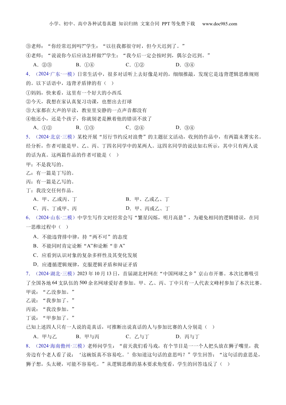 小学、初中、高中各种试卷真题知识归纳文案合同PPT等免费下载www.doc985.com第一单元树立科学思维观念基础过关—能力提升—真题感知(最新模拟试题演练)1.(2025·福建漳州·一模)开学初,某校高三(10)班的学生围绕2024年巴黎奥运会展开了讨论。下列说法中违背逻辑思维一致性要求的是()①小艺:奥运赛场上有输赢,但人生没有输赢②小彤:潘展乐和郑钦文是我最喜欢的运动员,没有之一③小亮:奥运会乒乓球男单决赛太紧张刺激了,但已经不知不觉地过去了④小明:小燕,你觉得这届奥运会的开幕式好看吗?小燕:我有看这届奥运会的开幕式A.①②B.②③C.③④D.①④2.(2024·湖北·一模)初二的李聪遇到一道烧脑的数学题,手里有100元,为何花去的钱和剩余的钱计算结果会不一致?(如下表),从逻辑思维的角度看这是()手里有100元花去剩余买衣服40元60元买书籍30元30元买玩具18元12元买零食12元0元总计100元总计102元①犯了偷换、混淆概念的逻辑错误②违背同一律,思维存在不确定性③违反矛盾律,是思维混乱的表现④违反排中律,犯了自相矛盾的错误A.①②B.①③C.②④D.③④3.(2022·山东聊城·一模)合乎逻辑的思维必须是具有确定性、一致性和明确性的思维,违反上述要求就会犯逻辑错误。情景:一教室门前,就学生迟到问题,师生对话。下面学生的回答,不违反逻辑规则要求的是()①老师:“你今天为什么迟到了?”学生:“我一向守时,这是第一次迟到。”②老师:“你今天迟到了吗?”学生:“我既没有迟到,也没有早到。”小学、初中、高中各种试卷真题知识归纳文案合同PPT等免费下载www.doc985.com③老师:“你经常迟到吗?”学生:“以往我都很守时,但今天迟到了。”④老师;“说说你今后应该怎样做?”学生:“我今后一定会按时到,偶尔会迟到。”A.②③B.①④C.①②D.③④4.(2024·广东·一模)日常生活中,很多对话听上去好像是对的,细细推敲,发现它是违背逻辑思维规则的。以下话语中,违背矛盾律的有()①妈妈,快来看,这里有一个好大的小西瓜②今天,我想在家认真复习功课,也想出去打球③大家都在大声的早读,教室里安静的一点声音都没有④他还小,还是个孩子,你就别老是揪着他的错误不放了A.①②B.①③C.②④D.③④5.(2024·北京·三模)某校开展“厉行节约反对浪费”的主题征文活动,收到的作品中,有两篇未署实名。经分析,作者可能是甲、乙、丙、丁四名同学中的某两人。这四名同学的说法如右所示,其中只有两人说的话为真。这两篇作品的作者可能是()甲:不是我写的。乙:有一篇是丁写的。丙:有一篇是乙写的。丁:我没交任何作品。A.甲、乙或丙、丁B.甲、乙或乙、丁C.丙、丁或甲、丙D.甲、丙或乙、丁6.(2024·山东·二模)中学生写作文时经常会写“繁星闪烁,明月高悬”,为避免相同的逻辑错误,在同一思维过程中()A.不能违背排中律,持“两不可”的态度B.不能同时肯定论断“A”和论断“非A”C.应看到认识对象的复杂多样性及其变化发展D.应遵循逻辑规律,克服逻辑矛盾和辩证矛盾7.(2024·湖北·三模)2023年10月13日,首届湖北村网在“中国网球之乡”京山市开赛。本次比赛吸引了全国各地64支队伍的500余名网球爱好者参加。甲、乙、丙、丁中只有一人代表文峰村参加了本次比赛。甲说:“乙没参加。”乙说:“我参加了。”丙说:“我没参加。”丁说:“甲参加了。”已知上述四人只有一人说的是真话,可推断出说真话的人与参加比赛的人分别是()A.甲与乙B.甲与丙C.乙与丁D.丙与丁8.(2024·海南儋州·三模)老师问学生:“前天我们看马戏,有个节目是一一个人把头放在狮子嘴里,我旁边有个老人看了说:‘这碗饭真不容易吃。’你知道这句话的意思吗?”学生回答:“这句话的意思是,狮子想,头太硬,可能不容易吃。”从逻辑思维的基本要求角度看,学生的回答违反了()小学、初中、高中各种试卷真题知识归纳文案合同PPT等免费下载www.doc985.comA.同一律B.排中律C.矛盾律D.概括性9.(2024·天津河西·三模)“五一”假期到来,看一场热门舞剧,或者心仪歌手的演唱会,是不少人的选择。漫画《购票诈骗》给我们的...