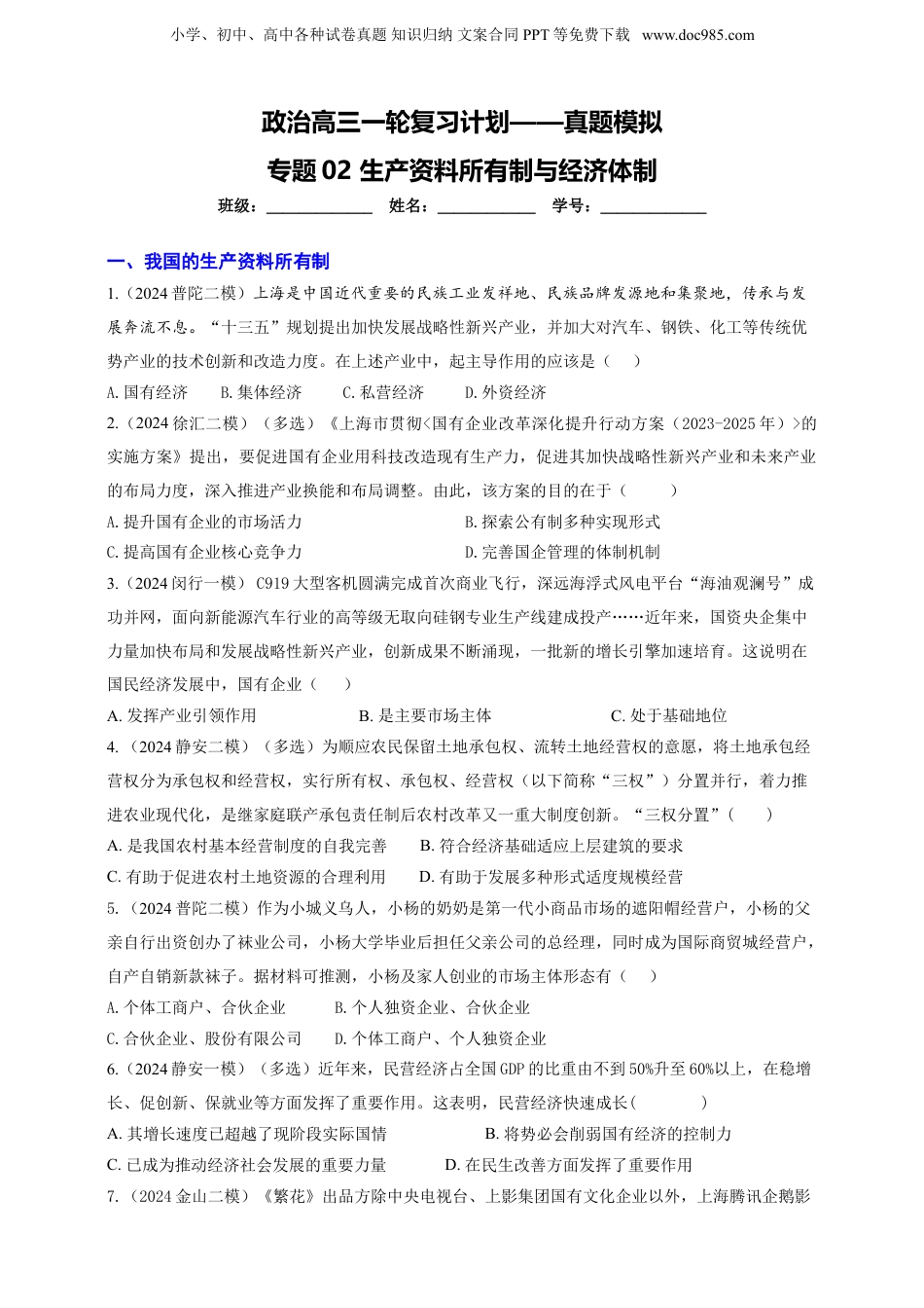 小学、初中、高中各种试卷真题知识归纳文案合同PPT等免费下载www.doc985.com政治高三一轮复习计划——真题模拟专题02生产资料所有制与经济体制班级:_____________姓名:____________学号:_____________一、我国的生产资料所有制1.(2024普陀二模)上海是中国近代重要的民族工业发祥地、民族品牌发源地和集聚地,传承与发展奔流不息。“十三五”规划提出加快发展战略性新兴产业,并加大对汽车、钢铁、化工等传统优势产业的技术创新和改造力度。在上述产业中,起主导作用的应该是()A.国有经济B.集体经济C.私营经济D.外资经济2.(2024徐汇二模)(多选)《上海市贯彻<国有企业改革深化提升行动方案(2023-2025年)>的实施方案》提出,要促进国有企业用科技改造现有生产力,促进其加快战略性新兴产业和未来产业的布局力度,深入推进产业换能和布局调整。由此,该方案的目的在于()A.提升国有企业的市场活力B.探索公有制多种实现形式C.提高国有企业核心竞争力D.完善国企管理的体制机制3.(2024闵行一模)C919大型客机圆满完成首次商业飞行,深远海浮式风电平台“海油观澜号”成功并网,面向新能源汽车行业的高等级无取向硅钢专业生产线建成投产……近年来,国资央企集中力量加快布局和发展战略性新兴产业,创新成果不断涌现,一批新的增长引擎加速培育。这说明在国民经济发展中,国有企业()A.发挥产业引领作用B.是主要市场主体C.处于基础地位4.(2024静安二模)(多选)为顺应农民保留土地承包权、流转土地经营权的意愿,将土地承包经营权分为承包权和经营权,实行所有权、承包权、经营权(以下简称“三权”)分置并行,着力推进农业现代化,是继家庭联产承包责任制后农村改革又一重大制度创新。“三权分置”()A.是我国农村基本经营制度的自我完善B.符合经济基础适应上层建筑的要求C.有助于促进农村土地资源的合理利用D.有助于发展多种形式适度规模经营5.(2024普陀二模)作为小城义乌人,小杨的奶奶是第一代小商品市场的遮阳帽经营户,小杨的父亲自行出资创办了袜业公司,小杨大学毕业后担任父亲公司的总经理,同时成为国际商贸城经营户,自产自销新款袜子。据材料可推测,小杨及家人创业的市场主体形态有()A.个体工商户、合伙企业B.个人独资企业、合伙企业C.合伙企业、股份有限公司D.个体工商户、个人独资企业6.(2024静安一模)(多选)近年来,民营经济占全国GDP的比重由不到50%升至60%以上,在稳增长、促创新、保就业等方面发挥了重要作用。这表明,民营经济快速成长()A.其增长速度已超越了现阶段实际国情B.将势必会削弱国有经济的控制力C.已成为推动经济社会发展的重要力量D.在民生改善方面发挥了重要作用7.(2024金山二模)《繁花》出品方除中央电视台、上影集团国有文化企业以外,上海腾讯企鹅影小学、初中、高中各种试卷真题知识归纳文案合同PPT等免费下载www.doc985.com视文化传播有限公司,以及上海繁花里企业发展有限公司等民营文化企业的身影。这说明()A.发展文化产业必须发展非公有制经济B.非公有制经济是我国社会主义经济的重要组成部分C.非公有制经济在促进文化繁荣发展中有重要作用8.(2024静安一模)依法保护民营企业产权和企业家权益。防止和纠正利用行政或刑事手段干预经济纠纷,以及执法司法中的地方保护主义。对材料主旨概括最准确的是()A.毫不动摇地巩固和发展多种所有制经济B.依法规范民营资本健康发展C.各种所有制经济应该具有同等竞争能力D.强化民营经济发展法治保障二、我国的社会主义市场经济体制9.(2024奉贤一模)亚运会吉祥物深受人们的喜爱,吸引人们纷至沓来。数据显示,浙江省28.3%的制造业小微企业出现了新的围绕亚运吉祥物的热销商品与服务商机。产生这些商机,这主要反映了市场__________机制的调节作用。()A.价格B.供求C.竞争10.(2024奉贤二模)发展的动力源包括市场主体。近年来,农村快递存在运力不足、成本高等问题。某地采用公交公司与多家快递公司联运的方式,多举措激发各市场主体活力。激发市场主体活力举措直接结果甲:快递公司借助公交运力①增加收入来源乙:公交公司提供客货两运②分摊运营成本丙:快递沿公交线下沉进村...