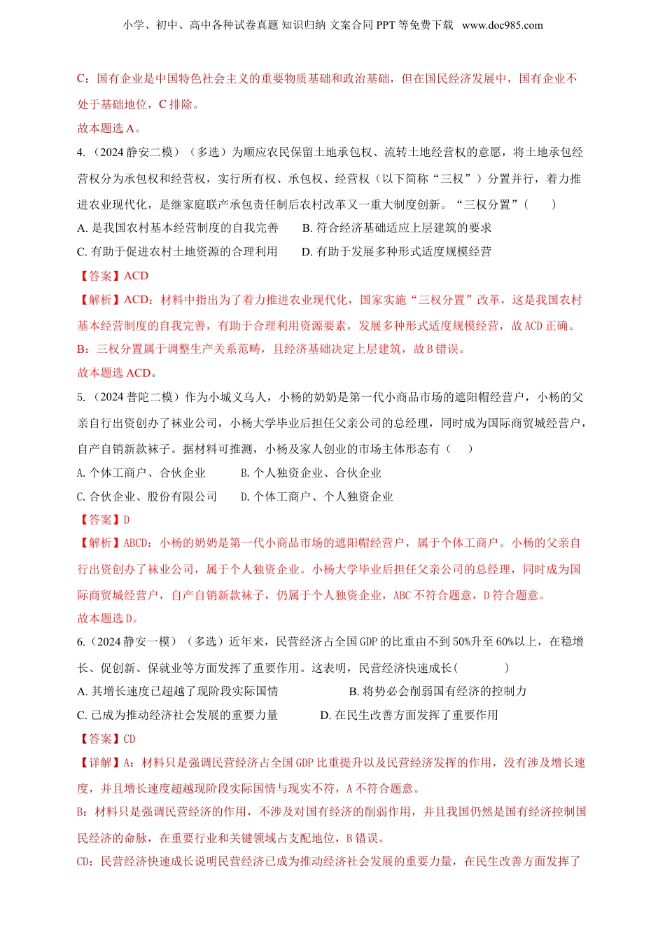 小学、初中、高中各种试卷真题知识归纳文案合同PPT等免费下载www.doc985.com政治高三一轮复习计划——答案解析专题02生产资料所有制与经济体制一、我国的生产资料所有制1.(2024普陀二模)上海是中国近代重要的民族工业发祥地、民族品牌发源地和集聚地,传承与发展奔流不息。“十三五”规划提出加快发展战略性新兴产业,并加大对汽车、钢铁、化工等传统优势产业的技术创新和改造力度。在上述产业中,起主导作用的应该是()A.国有经济B.集体经济C.私营经济D.外资经济【答案】A【详解】A:根据教材所学知识可知,国有经济发挥主导作用,A正确。BCD:集体经济、私营经济、外资经济三者属于非公有制经济,是社会主义市场经济的重要组成部分,不起主导作用,BCD不符合题意。故本题选A。2.(2024徐汇二模)(多选)《上海市贯彻<国有企业改革深化提升行动方案(2023-2025年)>的实施方案》提出,要促进国有企业用科技改造现有生产力,促进其加快战略性新兴产业和未来产业的布局力度,深入推进产业换能和布局调整。由此,该方案的目的在于()A.提升国有企业的市场活力B.探索公有制多种实现形式C.提高国有企业核心竞争力D.完善国企管理的体制机制【答案】AC【解析】AC:要促进国有企业用科技改造现有生产力,促进其加快战略性新兴产业和未来产业的布局力度,深入推进产业换能和布局调整。由此,该方案的目的在于提升国有企业的市场活力,提高国有企业核心竞争力,AC正确。BD:材料不涉及探索公有制多种实现形式、完善国企管理的体制机制,BD排除。故本题选AC。3.(2024闵行一模)C919大型客机圆满完成首次商业飞行,深远海浮式风电平台“海油观澜号”成功并网,面向新能源汽车行业的高等级无取向硅钢专业生产线建成投产……近年来,国资央企集中力量加快布局和发展战略性新兴产业,创新成果不断涌现,一批新的增长引擎加速培育。这说明在国民经济发展中,国有企业()A.发挥产业引领作用B.是主要市场主体C.处于基础地位【答案】A【解析】A:近年来,国资央企集中力量加快布局和发展战略性新兴产业,创新成果不断涌现,一批新的增长引擎加速培育。这说明在国民经济发展中,国有企业发挥产业引领作用,A符合题意。B:在国民经济发展中,企业是主要市场主体,B说法不准确。小学、初中、高中各种试卷真题知识归纳文案合同PPT等免费下载www.doc985.comC:国有企业是中国特色社会主义的重要物质基础和政治基础,但在国民经济发展中,国有企业不处于基础地位,C排除。故本题选A。4.(2024静安二模)(多选)为顺应农民保留土地承包权、流转土地经营权的意愿,将土地承包经营权分为承包权和经营权,实行所有权、承包权、经营权(以下简称“三权”)分置并行,着力推进农业现代化,是继家庭联产承包责任制后农村改革又一重大制度创新。“三权分置”()A.是我国农村基本经营制度的自我完善B.符合经济基础适应上层建筑的要求C.有助于促进农村土地资源的合理利用D.有助于发展多种形式适度规模经营【答案】ACD【解析】ACD:材料中指出为了着力推进农业现代化,国家实施“三权分置”改革,这是我国农村基本经营制度的自我完善,有助于合理利用资源要素,发展多种形式适度规模经营,故ACD正确。B:三权分置属于调整生产关系范畴,且经济基础决定上层建筑,故B错误。故本题选ACD。5.(2024普陀二模)作为小城义乌人,小杨的奶奶是第一代小商品市场的遮阳帽经营户,小杨的父亲自行出资创办了袜业公司,小杨大学毕业后担任父亲公司的总经理,同时成为国际商贸城经营户,自产自销新款袜子。据材料可推测,小杨及家人创业的市场主体形态有()A.个体工商户、合伙企业B.个人独资企业、合伙企业C.合伙企业、股份有限公司D.个体工商户、个人独资企业【答案】D【解析】ABCD:小杨的奶奶是第一代小商品市场的遮阳帽经营户,属于个体工商户。小杨的父亲自行出资创办了袜业公司,属于个人独资企业。小杨大学毕业后担任父亲公司的总经理,同时成为国际商贸城经营户,自产自销新款袜子,仍属于个人独资企业,ABC不符合题意,D符合题意。故本题选D。6.(2024静安一模)(多选)近年来,民营经济占全国GDP的比重由不到50%...