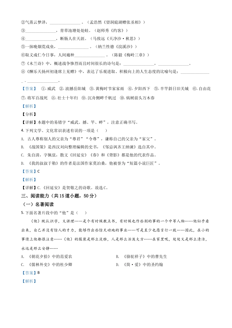 贵州省安顺市2021年中考语文试题同学你好!答题前请认真阅读以下内容:1.全卷共8页,共24道小题,满分150分。答题时间150分钟,考试形式为闭卷2.请在答题卡相应位置作答,在试题卷上答题视为无效。一、书写水平(5分)根据作文的汉字书写水平计分。(5分)二、基础积累(共4道小题,20分)1.根据语境和拼音,请用楷体字写出下面横线处的词语。这里,是中国革命的圣地,福地。在这里,各族儿女艰苦奋斗、qièérhùshě①__________终于挣脱了贫困的束缚,迎来了历史的巨变,在这里,条条通途让青山绿水触手可及;在这里,数字经济发展风生水起;在这里,“中国天眼”正在探索cāngmáng②______宇宙的奥秘,这里,就是贵州!今天,充满活力的多彩贵州,将继续创造属于这片土地的奇迹!【答案】①.①锲而不舍②.②苍茫【解析】【详解】锲而不舍:意思是不停地雕刻。比喻有恒心,有毅力。注意“锲”的写法;苍茫:意思是指辽阔遥远而望不到边。注意“苍”与“沧”的区别。2.下列句中加点词语使用有误的一项是()A.近期,局部地区出现本土病例,这再次提醒我们接种新冠疫苗、构筑免疫屏障刻不容缓。B.禁毒微电影《有你》以生动的故事向人们张扬禁毒理念,丰富了禁毒宣传的形式和内容。C.贵州贵安招果洞遗址出土的一些文物在西南乃至全国都很罕见。其研究价值不言而喻。D.再平凡的工作,我们都不能漫不经心地应付,而要以认真负责、一丝不苟的态度来对待。【答案】B【解析】【分析】【详解】A.屏障:指屏风或阻挡之物,也有保护遮蔽的含义;B.张扬:声张宣扬。有误,“张扬”与语境不符,应改为“宣传”或“宣扬”;C.不言而喻:不用说话就能明白。形容道理很明显;D.漫不经心:比喻人做事随随便便,不放在心上;故选B。3.根据所给信息默写相应内容。①富贵不能淫,贫贱不能移,_______________不能屈。《<孟子>三章》)②气蒸云梦泽,_______________。(孟浩然《望洞庭湖赠张丞相》)③_______________,青草池塘处处蛙。(赵师秀《约客》)④_______________,断肠人在天涯。(马致远《天净沙·秋思》)⑤一抹晚烟荒戍垒,_______________。(纳兰性德《浣溪沙》)⑥取义成仁今日事,人间遍种_______________。(陈毅《梅岭三章》)⑦《木兰诗》中,概述战争惨烈而且时间很长的诗句是:_______________,_______________。⑧《酬乐天扬州初逢席上见赠》中,表达了乐观进取、积极向上的人生态度的比喻句是:_______________﹐_______________。【答案】①.威武②.波撼岳阳城③.黄梅时节家家雨④.夕阳西下⑤.半竿斜日旧关城⑥.自由花⑦.将军百战死⑧.壮士十年归⑨.沉舟侧畔千帆过⑩.病树前头万木春【解析】【分析】【详解】本题中的易错字“威武、撼、竿、畔”,注意正确书写。4.下列文学、文化常识表述有误的一项是()A.古人尊称别人的父亲为“尊君”“令尊”,谦称自己的父亲为“家父”。B.《战国策》是西汉刘向整理编辑的史书,《邹忌讽齐王纳谏》选自其中。C.朱自清,字佩弦,散文《回延安》《春》和《背影》都是他的代表作品。D.《我的叔叔于勒》的作者是法国作家莫泊桑,他被誉为“短篇小说巨匠”。【答案】C【解析】【详解】C.《回延安》是贺敬之的诗歌。故选C。三、阅读能力(共15道小题,50分)(一)名著阅读5.下面名著片段中的“他”是()(他)既认识字,又讲理……是个有时候教点书,有时候也作些别的事的一个中等人物……他似乎看出来,自己并没有惊人的才力,能够作出些惊天动地的事业……可是至少也愿言行一致……因此,在小的事情上他都很注意……(他)的服装是那么淡雅,人是那么活泼大方……在家里呢,处处又是那么清洁,永远是那么安静……A.《朝花夕拾》中的范爱农B.《骆驼祥子》中的曹先生C.《儒林外史》中的杜少卿D.《简·爱》中的圣约翰【答案】B【解析】【详解】B.《骆驼祥子》中的曹先生:一个平凡的教书人,爱好传统美术,因为信奉社会主义,所以待人宽和。祥子在曹先生家拉包月,曹家处处又是那么清洁,永远是那么安静,使他觉得舒服安定。拉着曹先生出去,曹先生的服装是那么淡雅,人是那么活泼大方,他自己是那么干净利落,魁梧雄壮,他就跑得分外...