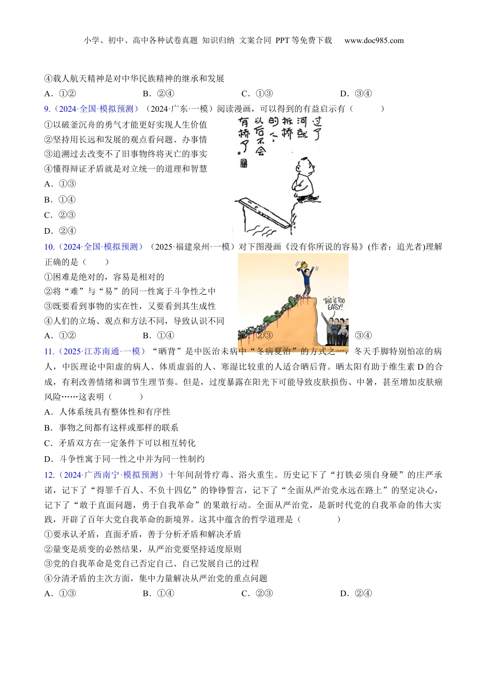 小学、初中、高中各种试卷真题知识归纳文案合同PPT等免费下载www.doc985.com第三课把握世界的规律基础过关—能力提升—真题感知(最新模拟试题演练)1.(2024·湖北·三模)2024年1月23日,国内在建规模最大的塔式光热项目的关键部件安装完成。该项目先通过高精度智能定日镜将太阳辐射聚集到吸热器上,将吸热器内的熔盐加热到560余摄氏度的高温,然后再与水进行热交换产生高温高压蒸汽,驱动汽轮机运转。这一技术解决了传统光伏电站没有日光就无法发电的波动性、间歇性问题。这表明()①部分的功能对事物的整体发展起决定作用②人们可以突破客观条件的制约实现造福人类的愿望③把握事物的多样性联系有利于实现事物的价值④人们可以根据事物固有的联系能够创造出新的具体联系A.①②B.①④C.②③D.③④2.(2024·河北邯郸·一模)垂直农业模式是将一个个水平面的种植系统移入室内并向垂直方向扩展,以最大化利用种植空间,种植的蔬菜或粮食也不是生长在土壤之中,而是生长在循环水、甚至是含有养分、水分和氧气的细雾之中,以更少的能耗生产出更多的食物。这一农业模式()①在客观条件的基础上创造了自在事物联系②体现了人们在农业生产中尊重和利用规律③印证了人们可以根据自身主观需要建立新联系④表明把握事物的属性有利于价值的创造与实现A.①②B.①③C.②④D.③④3.(2025·陕西·一模)2023年6月22日,泰国南部春蓬府的海滩上发现大量死鱼。这一景象在2023年6月9日也出现在美国得克萨斯州墨西哥湾沿岸的海滩上,死鱼密集地覆盖了数公里的海滩。专家认为,气候变化导致海水变暖,可能刺激了浮游生物的大量繁殖,进而导致水中的氧气水平降低,使鱼类窒息而死。专家的分析告诉我们()①联系具有普遍性,任何事物之间都存在着固有的联系②联系具有多样性,不能忽视事物之间联系的中间环节③受主客观多种因素的制约,人们的认识能力有待提高④部分影响整体,要立足部分推动整体发展实现最优目标A.①②B.①④C.②③D.③④4.(2024·广西·模拟预测)畜禽粪污、易腐垃圾等是污染农村人居环境的罪魁祸首,某地利用蚯蚓养殖,将畜禽粪污、易腐垃圾等有机废弃物高温发酵预处理后,经过蚯蚓过腹消化实现高值化利用,蚯蚓粪可还田利用,成品蚯蚓可用于售卖,极大改善了农村的人居环境,也带来了可观的经济效益。这体现的哲学道理有()小学、初中、高中各种试卷真题知识归纳文案合同PPT等免费下载www.doc985.com①事物价值的转化依赖事物属性的多样性②人们可以根据人们的需要建立新的联系③同一事物在不同的联系中有不同的属性④发挥主观能动性就可以实现资源再利用A.①②B.①③C.②③D.②④5.(2025·安徽蚌埠·一模)传统的暑期淡季刚过,8月的车市就迎来了一波新车型的热潮。在全产业链不断创新突破的大背景下,中国新能源汽车不仅在巩固自身优势,同时也在不断磁吸全球工业资源,加速全球汽车产业转型升级。这体现了发展新能源汽车()①要经历肯定、否定,再到否定之否定的过程,实现技术创新②要重视量的积累,通过不断地深入钻研实现技术的渐进飞跃③要树立全局观念,掌握系统优化的方法,用超前思维完成创新④要立足整体,把握系统的整体性、有序性和内部结构优化趋向A.①③B.①④C.②③D.②④6.(2024·辽宁丹东·二模)习近平总书记在新时代推动东北全面振兴座谈会上的重要讲话中强调:“积极培育新能源、新材料、先进制造、电子信息等战略性新兴产业,积极培育未来产业,加快形成新质生产力,增强发展新动能。”这一重大论断的提出说明()①新事物必然战胜旧事物,同时也必然经历曲折的过程②辩证否定是联系的环节,是一事物对另一事物的否定③社会存在决定社会意识,社会意识是社会存在的反映④我们要热情支持新事物的成长壮大,对未来充满信心A.①②B.①④C.②③D.③④7.(2024·山西吕梁·三模)当前,新一轮科技革命和产业变革蓬勃发展,人工智能、生物技术、新能源等前沿技术方兴未艾。发展新质生产力,不仅有利于加快产业升级步伐,提高产业链供应链韧性和安全水平,更有助于抢占全球产业变革和市场竞争的制高点,把握发展主动权,推动中国经...