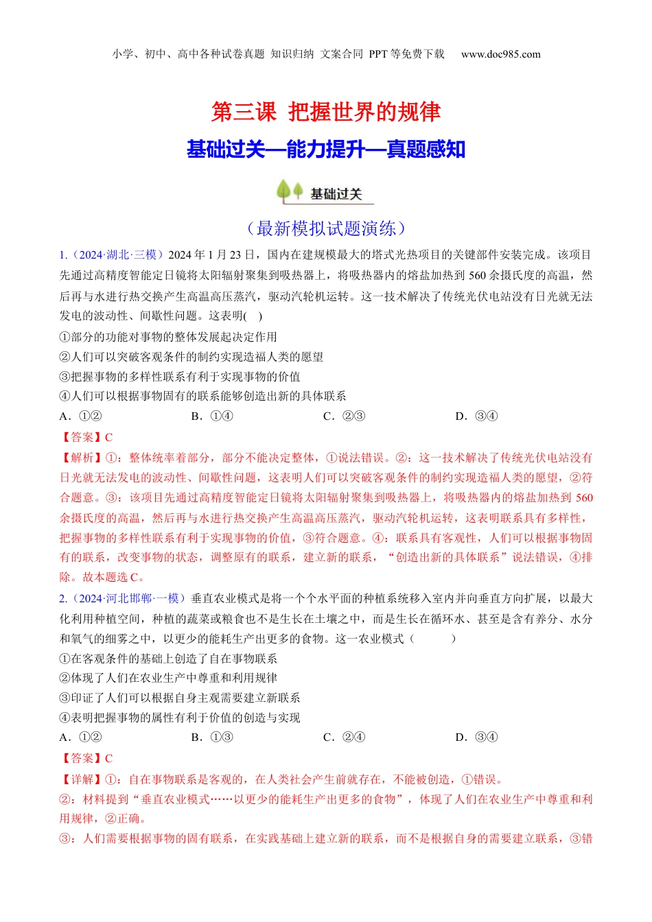 小学、初中、高中各种试卷真题知识归纳文案合同PPT等免费下载www.doc985.com第三课把握世界的规律基础过关—能力提升—真题感知(最新模拟试题演练)1.(2024·湖北·三模)2024年1月23日,国内在建规模最大的塔式光热项目的关键部件安装完成。该项目先通过高精度智能定日镜将太阳辐射聚集到吸热器上,将吸热器内的熔盐加热到560余摄氏度的高温,然后再与水进行热交换产生高温高压蒸汽,驱动汽轮机运转。这一技术解决了传统光伏电站没有日光就无法发电的波动性、间歇性问题。这表明()①部分的功能对事物的整体发展起决定作用②人们可以突破客观条件的制约实现造福人类的愿望③把握事物的多样性联系有利于实现事物的价值④人们可以根据事物固有的联系能够创造出新的具体联系A.①②B.①④C.②③D.③④【答案】C【解析】①:整体统率着部分,部分不能决定整体,①说法错误。②:这一技术解决了传统光伏电站没有日光就无法发电的波动性、间歇性问题,这表明人们可以突破客观条件的制约实现造福人类的愿望,②符合题意。③:该项目先通过高精度智能定日镜将太阳辐射聚集到吸热器上,将吸热器内的熔盐加热到560余摄氏度的高温,然后再与水进行热交换产生高温高压蒸汽,驱动汽轮机运转,这表明联系具有多样性,把握事物的多样性联系有利于实现事物的价值,③符合题意。④:联系具有客观性,人们可以根据事物固有的联系,改变事物的状态,调整原有的联系,建立新的联系,“创造出新的具体联系”说法错误,④排除。故本题选C。2.(2024·河北邯郸·一模)垂直农业模式是将一个个水平面的种植系统移入室内并向垂直方向扩展,以最大化利用种植空间,种植的蔬菜或粮食也不是生长在土壤之中,而是生长在循环水、甚至是含有养分、水分和氧气的细雾之中,以更少的能耗生产出更多的食物。这一农业模式()①在客观条件的基础上创造了自在事物联系②体现了人们在农业生产中尊重和利用规律③印证了人们可以根据自身主观需要建立新联系④表明把握事物的属性有利于价值的创造与实现A.①②B.①③C.②④D.③④【答案】C【详解】①:自在事物联系是客观的,在人类社会产生前就存在,不能被创造,①错误。②:材料提到“垂直农业模式……以更少的能耗生产出更多的食物”,体现了人们在农业生产中尊重和利用规律,②正确。③:人们需要根据事物的固有联系,在实践基础上建立新的联系,而不是根据自身的需要建立联系,③错小学、初中、高中各种试卷真题知识归纳文案合同PPT等免费下载www.doc985.com误。④:通过了解处置农业模式的属性,进而有利于创造更多的价值,④正确。故本题选C。3.(2025·陕西·一模)2023年6月22日,泰国南部春蓬府的海滩上发现大量死鱼。这一景象在2023年6月9日也出现在美国得克萨斯州墨西哥湾沿岸的海滩上,死鱼密集地覆盖了数公里的海滩。专家认为,气候变化导致海水变暖,可能刺激了浮游生物的大量繁殖,进而导致水中的氧气水平降低,使鱼类窒息而死。专家的分析告诉我们()①联系具有普遍性,任何事物之间都存在着固有的联系②联系具有多样性,不能忽视事物之间联系的中间环节③受主客观多种因素的制约,人们的认识能力有待提高④部分影响整体,要立足部分推动整体发展实现最优目标A.①②B.①④C.②③D.③④【答案】C【详解】②③:专家的分析揭示了气候变化——海水变暖——可能刺激浮游生物大量繁殖——水中的氧气水平降低——鱼类窒息而死,体现了联系具有多样性,不能忽视事物之间联系的中间环节,专家的分析用“可能”一词,说明受主客观多种因素的制约,人们的认识能力有待提高,②③正确。①:联系的普遍性并不意味着任何事物之间都存在着固有的联系,①错误。④:应立足整体,不是立足部分,排除④。故本题选C。4.(2024·广西·模拟预测)畜禽粪污、易腐垃圾等是污染农村人居环境的罪魁祸首,某地利用蚯蚓养殖,将畜禽粪污、易腐垃圾等有机废弃物高温发酵预处理后,经过蚯蚓过腹消化实现高值化利用,蚯蚓粪可还田利用,成品蚯蚓可用于售卖,极大改善了农村的人居环境,也带来了可观的经济效益。这体现的哲学道理有()①事物价值的转化依赖事物属性的多样...