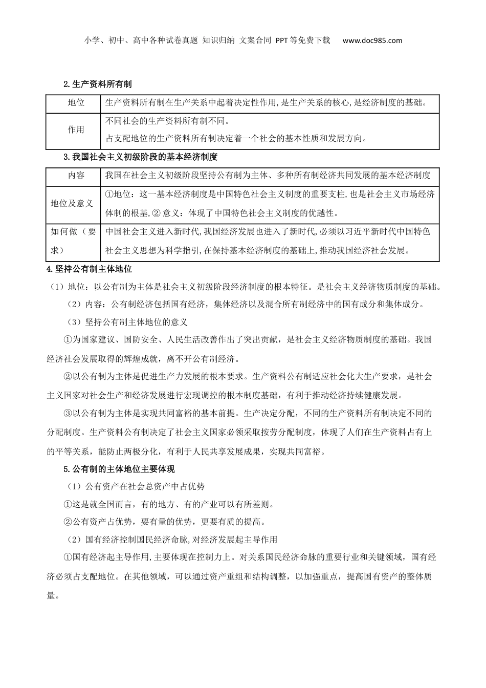 小学、初中、高中各种试卷真题知识归纳文案合同PPT等免费下载www.doc985.com第一课我国的生产资料所有制【课标要求】1.理解公有制为主体、多种所有制经济共同发展,既体现了社会主义制度优越性,又同我国社会主义初级阶段社会生产力发展水平相适应,是党和人民的伟大创造。了解各种所有制经济的地位和作用,2.阐释公有制经济与非公有制经济相互促进、共同发展,明确坚持毫不动摇巩固和发展公有制经济,毫不动摇鼓励、支持、引导非公有制经济发展。【问题导学】1.物质资料生产的重要性、必要条件。P32.生产资料所有制的地位、作用。P33.我国的生产资料所有制:内容、地位。P34.新时代发展经济的指导思想及其内涵。P3及相关链接5.公有制主体地位:(1)范围(2)原因①地位②必要性③作用P3-4(3)主要体现P4(4)国有企业的作用P56.非公有制经济:(1)范围(2)地位(3)作用P6-77.公有制和非公有制经济的关系P78.多种所有制经济共同发展的意义P79.必须发展壮大国有经济(如何)P8-1010.必须发展壮大农村集体经济(如何)P1011.毫不动摇鼓励、支持、引导非公有制经济发展(如何):政府政策角度、企业管理角度、非公有制经济人士自身P12-1312.企业经营成功的主要因素(【相关链接】P13)【必备知识】一、公有制主体地位及其体现1.物质资料生产原因人类要生存和发展,就要满足衣食住行等基本生活需要,就必须进行物质资料生产。构成要素人的劳动和生产资料。人的劳动:劳动是物质财富的源泉。也是价值的唯一源泉。生产资料是创造物质财富和价值的条件。小学、初中、高中各种试卷真题知识归纳文案合同PPT等免费下载www.doc985.com2.生产资料所有制地位生产资料所有制在生产关系中起着决定性作用,是生产关系的核心,是经济制度的基础。作用不同社会的生产资料所有制不同。占支配地位的生产资料所有制决定着一个社会的基本性质和发展方向。3.我国社会主义初级阶段的基本经济制度内容我国在社会主义初级阶段坚持公有制为主体、多种所有制经济共同发展的基本经济制度地位及意义①地位:这一基本经济制度是中国特色社会主义制度的重要支柱,也是社会主义市场经济体制的根基,②意义:体现了中国特色社会主义制度的优越性。如何做(要求)中国社会主义进入新时代,我国经济发展也进入了新时代,必须以习近平新时代中国特色社会主义思想为科学指引,在保持基本经济制度的基础上,推动我国经济社会发展。4.坚持公有制主体地位(1)地位:以公有制为主体是社会主义初级阶段经济制度的根本特征。是社会主义经济物质制度的基础。(2)内容:公有制经济包括国有经济,集体经济以及混合所有制经济中的国有成分和集体成分。(3)坚持公有制主体地位的意义①为国家建议、国防安全、人民生活改善作出了突出贡献,是社会主义经济物质制度的基础。我国经济社会发展取得的辉煌成就,离不开公有制经济。②以公有制为主体是促进生产力发展的根本要求。生产资料公有制适应社会化大生产要求,是社会主义国家对社会生产和经济发展进行宏现调控的根本制度基础,有利于推动经济持续健康发展。③以公有制为主体是实现共同富裕的基本前提。生产决定分配,不同的生产资料所有制决定不同的分配制度。生产资料公有制决定了社会主义国家必领采取按劳分配制度,体现了人们在生产资料占有上的平等关系,能防止两极分化,有利于人民共享发展成果,实现共同富裕。5.公有制的主体地位主要体现(1)公有资产在社会总资产中占优势①这是就全国而言,有的地方、有的产业可以有所差则。②公有资产占优势,要有量的优势,更要有质的提高。(2)国有经济控制国民经济命脉,对经济发展起主导作用①国有经济起主导作用,主要体现在控制力上。对关系国民经济命脉的重要行业和关键领域,国有经济必须占支配地位。在其他领域,可以通过资产重组和结构调整,以加强重点,提高国有资产的整体质量。小学、初中、高中各种试卷真题知识归纳文案合同PPT等免费下载www.doc985.com②国有企业是国有经济最主要的实现形式,是中国特色社会主义的重要物质基础和政治基础,是推进国家现代化、保障人民共同利益的重要力量,是我们党执政兴国的重要支柱和依靠力量...