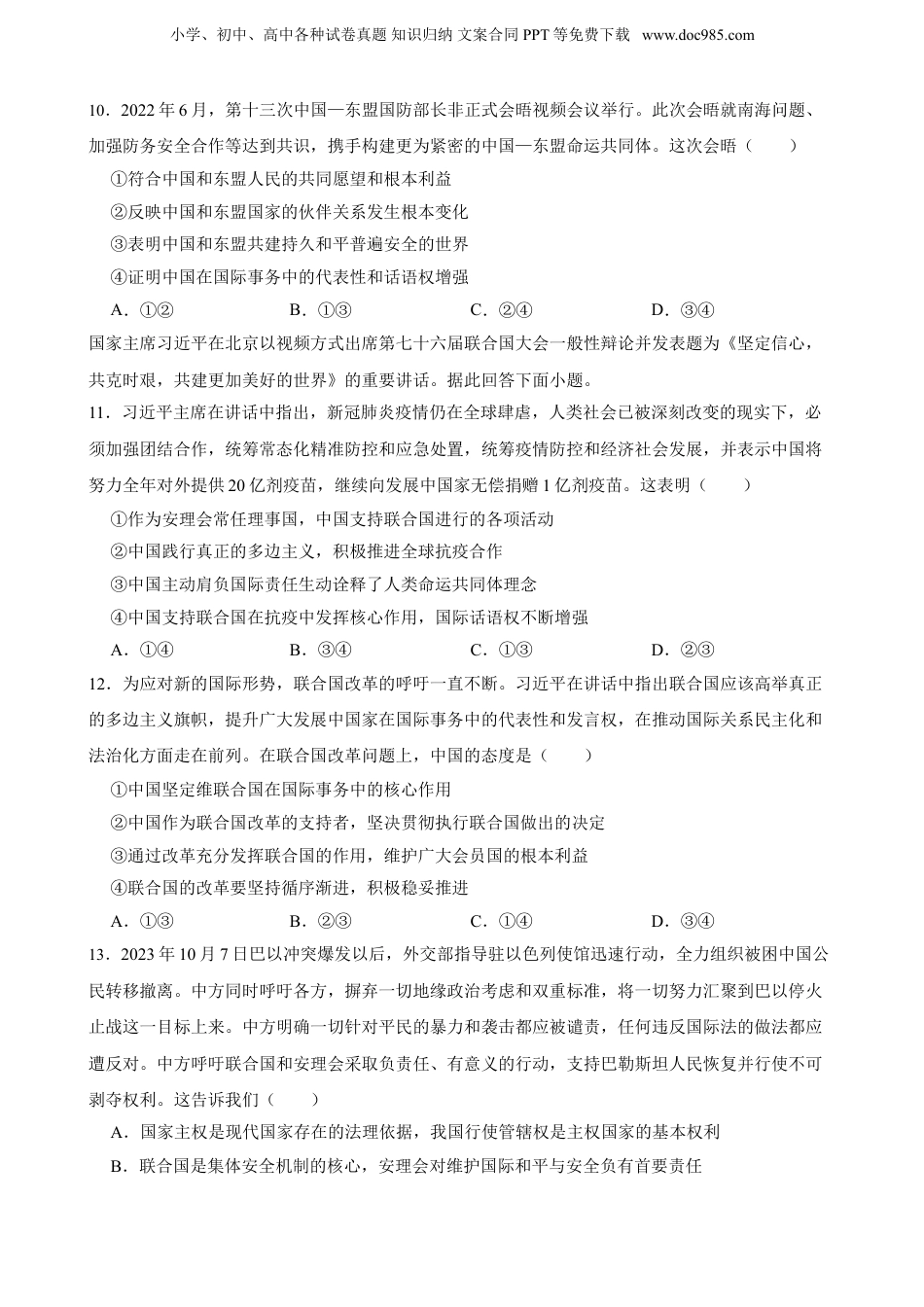 小学、初中、高中各种试卷真题知识归纳文案合同PPT等免费下载www.doc985.com选必一第四单元国际组织一轮复习精练一、单选题1.国际组织是国家、地区之间的组织,两个以上国家、地区的政府、团体或个人才能建立国际组织。这说明国际组织具有()【来源:21·世纪·教育·网】A.目的性B.组织性C.国际性D.自主性2.2023年2月,欧洲议会通过了《2035年欧洲新售燃油轿车和小货车零排放协议》。协议的目标是2035年开始在欧盟27国范围内停售新的燃油轿车和小货车。中国新能源车企纷纷通过投资建厂、品牌收购等方式进一步扩大在欧洲市场布局。据材料,下列说法正确的是()①欧盟通过实施经济一体化政策推动欧洲绿色发展②欧洲议会通过行使最高决策权维护欧盟整体利益③中国新能源车企在欧投资建厂有助于克服贸易壁垒④国际新能源汽车市场竞争加剧不利于全球资源配置A.①③B.①④C.②③D.②④3.当前全球挑战相互交织,任何国家都无法单独应对。团结合作,践行真正的多边主义是唯一的选择。联合国是多边主义的旗帜,以联合国为中心的国际多边架构是国际合作的主要平台。中国支持联合国推动加强全球治理,支持联合国在国际事务中发挥核心作用。这是因为()①联合国是全球实践多边主义的最佳场所②联合国是集体应对各种威胁和挑战的有效平台③维护国际和平与安全是联合国大会的主要责任④联合国的作用只能加强,中国支持联合国改革A.①②B.①③C.②④D.③④4.2022年北京冬奥会和残奥会已完美收官,获得了国际奥委会的高度赞扬。国际奥委会()①是非政府间的、世界性的国际组织②作为国际社会的主要成员,凌驾于主权国家之上③活动程序以条约或协议为依据④发挥重要的作用,其决议对成员单位具有法律约束力A.③④B.②④C.②③D.①③5.面对发展赤字,中国积极推进全球发展倡议,助力落实联合国2030年可持续发展议程。面对气候威胁,中国支持联合国应对气候变化国际合作,将用历史上最短时间完成全球最高碳排放强度降幅。这表明中国()①坚持多边主义实现共同安全②积极发挥在国际事务中的核心作用③维护人类共同利益,携手打造命运共同体④支持符合《联合国宪章》宗旨和原则的各项活动小学、初中、高中各种试卷真题知识归纳文案合同PPT等免费下载www.doc985.comA.①②B.①③C.②④D.③④6.2023年7月,上海合作组织成员国元首理事会第23会议举行,成员国共同发表关于数字化转型领域合作的声明、批准关于给予伊朗上海合作组织成员国地位等一系列决议。这表明,上海合作组织()2·1·c·n·j·yA.维护了各成员国的国家安全和根本利益B.其发展有利于加强成员国间的相互信任与友好合作C.其建立进一步强化了各成员国之间的战略同盟关系D.是当今世界最具普遍性、代表性和权威性的政府间的国际组织7.欧盟出台“地平线欧洲”计划第二个战略规划,旨在为促进2025—2027年欧盟的研究和创新制定战略方向并提供资金,以应对包括气候变化、生物多样性丧失、数字化转型及人口老龄化等挑战。据欧委会预测,“地平线欧洲”计划每投资1欧元,会带来高达11欧元的经济收益。材料表明()①欧盟加大研究和创新投入推动其转型发展②欧盟通过推进区域一体化以促进全球经济发展③实现社会经济可持续发展是欧盟各成员国共同目标④欧盟的战略规划旨在实现各成员国利益最大化A.①②B.①③C.②④D.③④8.2024年4月14日,联合国安理会就伊朗袭击以色列举行紧急会议,联合国秘书长古特雷斯表示,中东地区的人民正面临着“毁灭性的全面冲突”的真实危险,敦促各方保持最大限度的克制,该地区和世界都无法承受另一场战争。由此可见()www-2-1-cnjy-com①联合国秘书长作为行政首长拥有广泛职权②安理会有维护国际和平与安全的主要责任③战乱和冲突是持久和平与发展的重大障碍④中东地区战乱极大程度上将改变时代主题A.①④B.①②C.②③D.③④9.博鳌亚洲论坛2023年年会的与会嘉宾围绕“不确定的世界:团结合作迎挑战,开放包容促发展”的主题,通过一场场分论坛和一系列形式多样的活动,话经济、谈安全、绘蓝图,向世界传递出团结合作的“博鳌声音”。这反映了()【出处:21教育名师】...