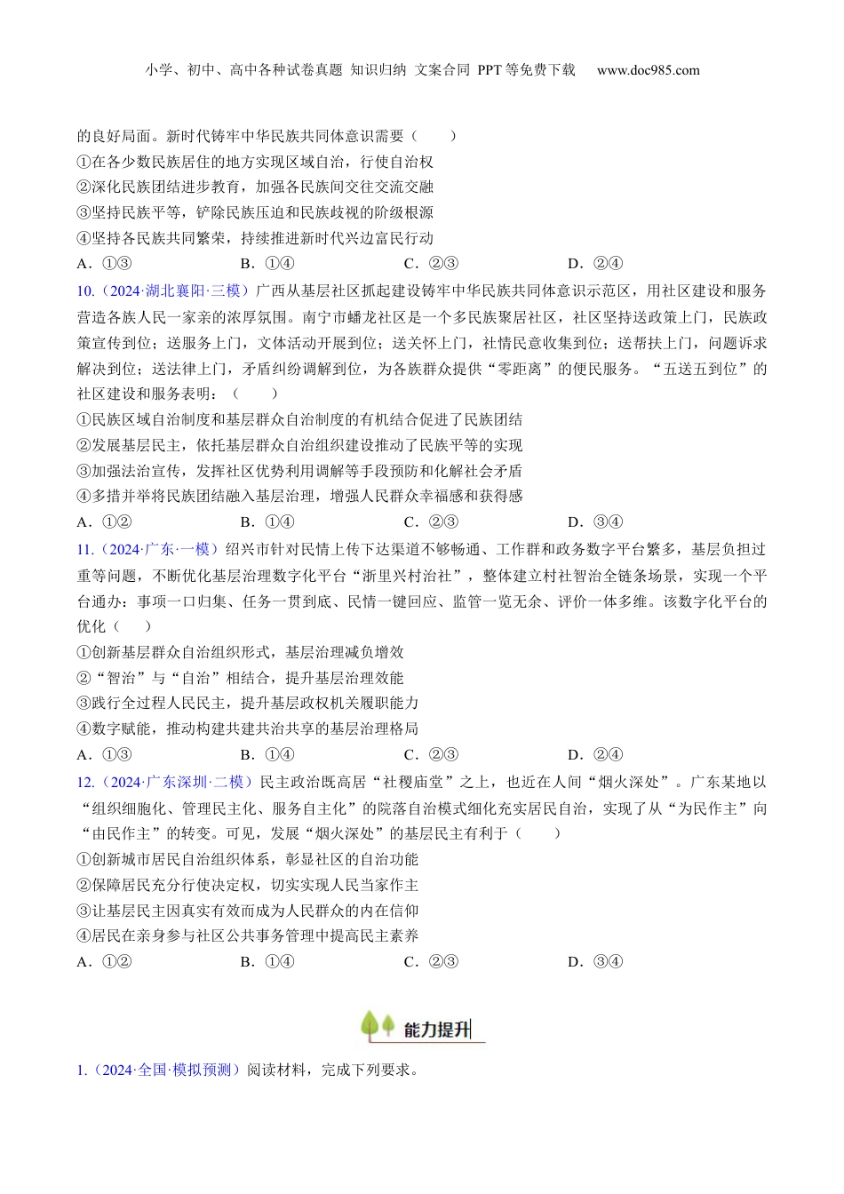 小学、初中、高中各种试卷真题知识归纳文案合同PPT等免费下载www.doc985.com第六课《我国的基本政治制度》基础过关—能力提升—真题感知(最新模拟试题演练)1.(2024·浙江·模拟预测)中国致公党在部署2024年工作时指出,全党要坚持以习近平新时代中国特色社会主义思想为指导,深入贯彻落实中共二十大精神,提升思想政治工作精细化,筑牢思想政治根基。这说明()①中国共产党是我国最高政治领导力量②中国致公党具有法律赋予的参政权③中国致公党是中国共产党的亲密友党④中国致公党接受中国共产党的思想领导A.①③B.①④C.②③D.②④2.(2024·广东惠州·一模)全国政协十四届二次会议的主要议程有:听取和审议全国政协十四届常委会工作报告和一次会议以来提案工作情况的报告;列席第十四届全国人民代表大会第二次会议,听取并讨论政府工作报告及其他有关报告。由此可见,政协()①最大限度地凝聚共识,发挥其政治联盟的优势②坚持人民民主,履行政治协商、参政议政职能③监督政府工作,不断推进国家治理现代化建设④发挥独特优势,广聚英才投身祖国的发展伟业A.①②B.①④C.②③D.③④3.(2024·广东·二模)“把广大民营经济人士更加紧密地团结在党的周围,不断开创工商联事业发展新局面。”2023年10月24日,习近平总书记致信祝贺中华全国工商业联合会成立70周年,肯定了全国工商联作出的重要贡献,阐明了工商联工作的意义、方向、主题、任务,为做好新时代工商联工作、促进民营经济健康发展提供了根本遵循。可见()①中国共产党重视巩固和发展自身的执政基础②党的领导要细化到民企管理的具体职责中去③工商联合会是决定民企重大事务的权力机构④工商联应聚焦发展大局履行参政议政的职责A.①③B.①④C.②③D.②④4.(2024·广东江门·二模)某班同学开展关于全国政协的研究性学习,查阅到如下信息:◎提交加快形成新质生产力、推动金融高质量发展、完善生育保障政策等提案;◎创办“委员科学讲堂”,开展“科普万里行”活动;◎长期关注“一老一小”问题,提案撰写过程中,几易其稿……由此可推断,我国政协委员()①参加国家政权,管理社会事务②发挥界别优势,提高监督实效小学、初中、高中各种试卷真题知识归纳文案合同PPT等免费下载www.doc985.com③关切发展大计,心系民生冷暖④坚持建言资政,积极履职尽责A.①②B.①③C.②④D.③④5.(2024.浙江.高考真题)(2024·河北承德·模拟预测)2024年是人民政协成立75周年。习近平总书记强调:“人民政协要发扬优良传统,牢记政治责任,加强思想政治引领,加强专门协商机构制度建设,加强自身建设,政协委员要提高自身素质和履职能力,不断开创新时代政协工作和多党合作事业新局面。”下列选项符合上述要求的是()①政协准确把握性质定位,团结一切可以团结的力量②政协围绕发展和民主主题,积极履行社会建设职能③民主党派把党的领导贯穿于政治思想组织各方面④政协委员聚焦国家的中心任务进行调研提出建议A.①③B.①④C.②③D.②④6.(2024·广东惠州·一模)近年来,西藏自治区着力创建国家生态文明高地,在生态文明建设工作中充分发挥人大代表作用,形成了党委领导、政府主抓、部门协同、全民参与的创建工作格局。西藏自治区创建国家生态文明高地()①有利于民族团结,推动形成社会主义民族关系②发挥当地人大代表建言献策、履职尽责的作用③需要党委和政府行使自治权,构建工作新格局④激发多元主体参与活力,推动生态高质量发展A.①②B.①③C.②④D.③④7.(2024·广东广州·二模)自2010年3月广东省启动新一轮援疆工作以来,截至2023年11月广东省累计落实援疆资金346.27亿元,实施援疆项目1835个,派遣援疆干部人才8642名,在受援地建设了七个工业园区,带动了3.2万多农民脱贫、20多万人就业。广东援疆有利于()①新疆实现跨越式发展②新疆依法制定单行条例③新疆与广东同步富裕④铸牢中华民族共同体意识A.①③B.①④C.②③D.②④8.(2024·河北邯郸·模拟预测)2023年,全国政协民族和宗教委员会组织“加强各民族交往交流交融历史阐释和宣传教育”双周协商座谈会,围绕树立中华民...