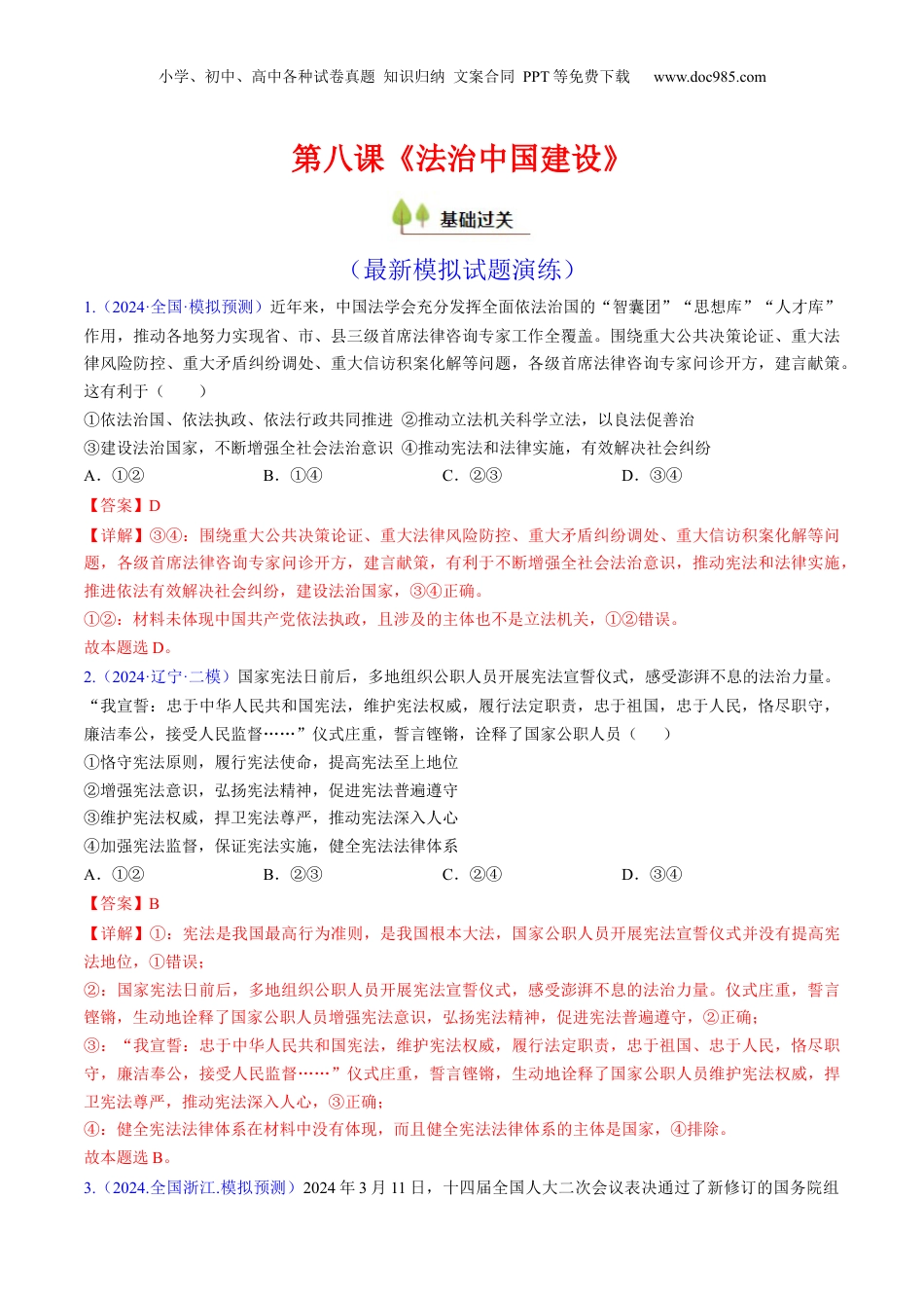小学、初中、高中各种试卷真题知识归纳文案合同PPT等免费下载www.doc985.com第八课《法治中国建设》(最新模拟试题演练)1.(2024·全国·模拟预测)近年来,中国法学会充分发挥全面依法治国的“智囊团”“思想库”“人才库”作用,推动各地努力实现省、市、县三级首席法律咨询专家工作全覆盖。围绕重大公共决策论证、重大法律风险防控、重大矛盾纠纷调处、重大信访积案化解等问题,各级首席法律咨询专家问诊开方,建言献策。这有利于()①依法治国、依法执政、依法行政共同推进②推动立法机关科学立法,以良法促善治③建设法治国家,不断增强全社会法治意识④推动宪法和法律实施,有效解决社会纠纷A.①②B.①④C.②③D.③④【答案】D【详解】③④:围绕重大公共决策论证、重大法律风险防控、重大矛盾纠纷调处、重大信访积案化解等问题,各级首席法律咨询专家问诊开方,建言献策,有利于不断增强全社会法治意识,推动宪法和法律实施,推进依法有效解决社会纠纷,建设法治国家,③④正确。①②:材料未体现中国共产党依法执政,且涉及的主体也不是立法机关,①②错误。故本题选D。2.(2024·辽宁·二模)国家宪法日前后,多地组织公职人员开展宪法宣誓仪式,感受澎湃不息的法治力量。“我宣誓:忠于中华人民共和国宪法,维护宪法权威,履行法定职责,忠于祖国,忠于人民,恪尽职守,廉洁奉公,接受人民监督……”仪式庄重,誓言铿锵,诠释了国家公职人员()①恪守宪法原则,履行宪法使命,提高宪法至上地位②增强宪法意识,弘扬宪法精神,促进宪法普遍遵守③维护宪法权威,捍卫宪法尊严,推动宪法深入人心④加强宪法监督,保证宪法实施,健全宪法法律体系A.①②B.②③C.②④D.③④【答案】B【详解】①:宪法是我国最高行为准则,是我国根本大法,国家公职人员开展宪法宣誓仪式并没有提高宪法地位,①错误;②:国家宪法日前后,多地组织公职人员开展宪法宣誓仪式,感受澎湃不息的法治力量。仪式庄重,誓言铿锵,生动地诠释了国家公职人员增强宪法意识,弘扬宪法精神,促进宪法普遍遵守,②正确;③:“我宣誓:忠于中华人民共和国宪法,维护宪法权威,履行法定职责,忠于祖国、忠于人民,恪尽职守,廉洁奉公,接受人民监督……”仪式庄重,誓言铿锵,生动地诠释了国家公职人员维护宪法权威,捍卫宪法尊严,推动宪法深入人心,③正确;④:健全宪法法律体系在材料中没有体现,而且健全宪法法律体系的主体是国家,④排除。故本题选B。3.(2024.全国浙江.模拟预测)2024年3月11日,十四届全国人大二次会议表决通过了新修订的国务院组小学、初中、高中各种试卷真题知识归纳文案合同PPT等免费下载www.doc985.com织法。为了适应新形势新任务新要求,此次修法增加了国务院性质地位的规定,完善了国务院职权的表述,完善了国务院组成人员相关规定,健全了国务院会议制度以及国务院依法全面正确履行职能的制度措施等。国务院组织法修改的意义()①为全面建设法治政府提供坚实的法治保障②建立健全科学完备的行政执法和司法体制③提高政府治理体系和治理能力现代化水平④保证了国家机关各司其职、协调高效运转A.①③B.①④C.②③D.②④【答案】A【详解】①③:国务院组织法修改,可以为全面建设法治政府提供坚实的法治保障,有利于提高政府治理体系和治理能力现代化水平,①③观点符合题意。②:国务院组织法的修改有利于建立健全科学完备的行政执法,但不是司法体制,②说法错误。④:国务院组织法的修改有利于国务院依法行政,而人民代表大会制度保证了国家机关各司其职、协调高效运转,④不符合题意。故本题选A。4.(2024·全国·模拟预测)2023—2025年,辽宁省将建立行政执法“四张清单”(即不予行政处罚、从轻行政处罚、减轻行政处罚、不予实施行政强制措施清单)动态调整机制,积极推行柔性执法,全面落实“首违不罚”制度,对不涉及生命健康、公共安全、生态环保等领域的首次轻微违法行为实施容错免罚机制。上述举措旨在①规范行政执法行为,提升行政执法质量和效能()②促进严格公正文明执法,实现执法效果最大化③加强行政执法协调监督,完善行政执法工作体系④提...