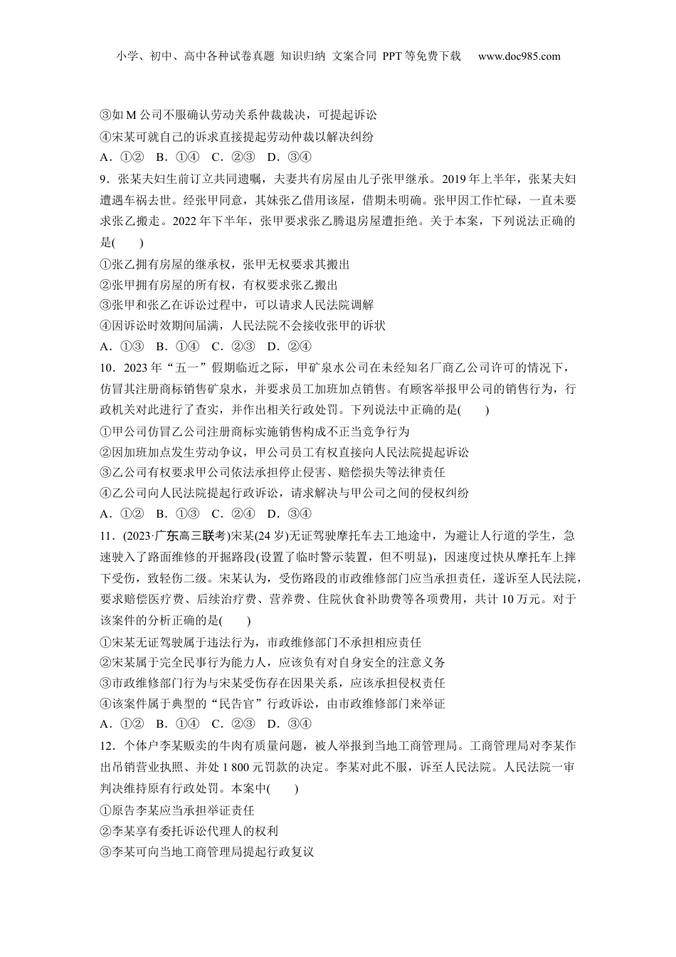 小学、初中、高中各种试卷真题知识归纳文案合同PPT等免费下载www.doc985.com一、选择题1.(2023·浙江1月考选)即将参加高考的小白碰到麻烦事:楼上邻居家小学生每晚8点跳绳半小时;学校未经许可将其侧面照片用于招生宣传片,同学议论她爱出风头;妈妈怀疑她早恋,查看她手机上的聊天记录。下列说法中正确的是()A.邻居小学生的行为属于行使不动产权利,是正当的B.学校未经小白许可使用她的侧面照,即使不以营利为目的也构成侵犯肖像权C.父母有权对子女的行为进行必要的约束和引导,查阅子女手机不构成侵权D.解决小白与妈妈的纠纷,可以选择便捷经济的仲裁途径2.女演员朱某将自己一段练习瑜伽的视频发在网上,却有网友指责其“打擦边球”蹭流量,对其进行不堪入目的评论。两日后,某瑜伽馆将该视频略作修改并配文“本馆优秀学员展示”在公众号发布。朱某发现上述行为后,声明将依法维权。对此,下列说法正确的是()①该网友涉嫌侵犯他人名誉权②若朱某起诉维权,人民法院应受理并登记立案③瑜伽馆涉嫌侵犯朱某的著作权④瑜伽馆的行为是典型的“搭便车”欺诈现象A.①②B.②④C.①③D.③④3.(2024·淮安高三考统)“罗刹国向东两万六千里,过七冲越焦海三寸的黄泥地,只为那有一条一丘河,河水流过苟苟营……”2023年7月19日,一曲《罗刹海市》开始风靡神州大地,甚至漂洋过海被译为不同国家的语言翻唱,引发世人对美与丑的深深思考。有人认为,这首歌曲源自清代蒲松龄的同名小说,涉嫌侵权。下列说法正确的是()①该作品著作财产权自作者去世50年后,不再受到法律保护②作品发表权为著作人永久持有,任何人都不得窜改著作内容③当前其他歌手未经著作权人许可,都不得翻唱此曲④作者的署名权、修改权和保护作品完整权受到法律永久保护A.①②B.①④C.②③D.③④4.(2023·州高三考滨联)在朋友聚会上,张某现场写下书法作品一幅,李某表示愿意以4万元的价格购买,张某表示同意,李某支付2万元定金,待6日后装裱完毕交货。三天后,张某将此画以6万元的价格卖给不知情的黄某,尚未交付。李某知悉后,双方发生纠纷。在本案中()①李某当场表示愿以4万元价格购买,是要约②张某与李某的口头约定不具有法律效力小学、初中、高中各种试卷真题知识归纳文案合同PPT等免费下载www.doc985.com③黄某善意取得了作品所有权④张某违约,李某可以要求张某双倍返还定金A.①②B.①④C.②③D.③④5.浙江杭州的刘先生发现,自己轿车前挡风玻璃被一块午餐肉砸碎,报警求助。经过调查,在第4层王女士家冰箱发现外观色泽相似的午餐肉。经查,当天王女士11岁的儿子乐乐将午餐肉扔出窗外,听到“咚”的一声,但他没敢说出来。下列关于本案的观点正确的是()①本案在举证责任方面将适用举证责任倒置原则②王女士儿子乐乐属于无民事行为能力人③刘先生可要求王女士赔礼道歉、赔偿损失④本案中民事法律关系的客体是汽车A.①③B.①④C.②③D.②④6.林某的婆婆体弱多病,由于林某的老公很早就去世了,儿媳林某十多年来对婆婆一直尽到主要的赡养义务,林某老公的三个弟弟妹妹从未回家照看其亲生母亲。老人去世前立下遗嘱,将城里名下房产留给儿媳林某,农村老家的房子赠给养老院,这引起了老人三个子女的不满,并上诉到人民法院。本案中()①儿媳林某属于第一顺序继承人②遗嘱继承法律效力优先于法定继承③老人农村老家的房子赠给养老院属于遗嘱继承④林某老公的三个弟弟妹妹有权继承其亲生母亲的全部遗产A.①②B.①④C.②③D.③④7.2016年,张某擅自将与周女士婚内共同购买的一套房屋(市价950万元)以550万元卖给该房租客杨某(未过户,杨某知道周女士不知情),并签订合同。2020年,周女士与张某协议离婚,约定房屋归周女士。周女士要求杨某退房遭拒后才得知房屋已被卖,于是将张某、杨某诉至人民法院,要求杨某返还房屋。本案庭审时()①房屋形式上仍归周女士与张某共同所有②张某与杨某所签订的房屋买卖协议无效③杨某侵犯了周女士对该房屋的用益物权④张某与周女士对该房屋享有平等处分权A.①②B.①④C.②③D.③④8.宋某应聘M公司家政保洁员,与M公司订立了2年期的《家政服务协议》。合同...