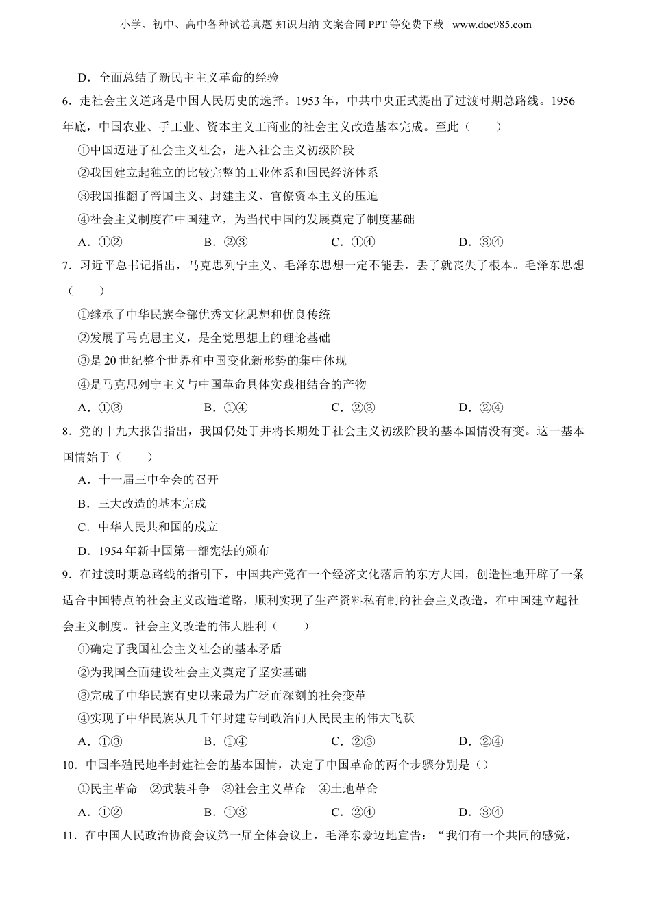 小学、初中、高中各种试卷真题知识归纳文案合同PPT等免费下载www.doc985.com第二课只有社会主义才能救中国一轮复习精练一、单选题1.社会主义制度在我国基本建立起来的标志是()A.新政协的召开B.生产资料所有制的社会主义改造完成C.人民公社化运动D.社会主义市场经济体制的建立2.中华人民共和国国庆节是国家的一种象征,是为了纪念新中国的成立而创立的。下列关于新中国成立的意义说法正确的有()21*cnjy*com①从根本上改变了中国社会的发展方向②彻底结束了半殖民地半封建社会的历史③实现了由新民主主义向社会主义的转变④中华民族迎来了从站起来到富起来的伟大飞跃A.①②B.①④C.②③D.③④3.新中国成立后,每逢重大节日,孙中山的画像就会矗立在人民英雄纪念碑前,与天安门城楼上的毛泽东画像遥相呼应。这是永恒的纪念,更是崇高的敬仰。他们()【出处:21教育名师】①分别是民主主义革命和社会主义革命的领导者②都致力于实现国家富强、民族复兴、人民幸福③都成功实现了中国历史上最深刻最伟大的社会变革④为改变旧中国的社会性质走上了不同的革命道路A.①③B.①④C.②③D.②④4.2021年10月9日,习近平总书记在纪念辛亥革命110周年大会上指出,1840年鸦片战争以后,中国逐步成为半殖民地半封建社会,国家蒙辱、人民蒙难、文明蒙尘,中国人民和中华民族遭受了前所未有的劫难。这一状况决定了中国人民要完成的历史任务是()①谋求民族独立和人民解放②消灭封建主义和人民大众的矛盾③实现国家富强和人民幸福④清除帝国主义和中华民族的矛盾A.①④B.①③C.②③D.②④5.改革开放后,中共中央明确将中共八大作为探索中国社会主义建设道路的开端。这是因为中共八大A.客观分析了当时的国内形势与主要矛盾的变化B.实现了工作重点向社会主义现代化建设的转变C.明确提出社会主义初级阶段的理论小学、初中、高中各种试卷真题知识归纳文案合同PPT等免费下载www.doc985.comD.全面总结了新民主主义革命的经验6.走社会主义道路是中国人民历史的选择。1953年,中共中央正式提出了过渡时期总路线。1956年底,中国农业、手工业、资本主义工商业的社会主义改造基本完成。至此()①中国迈进了社会主义社会,进入社会主义初级阶段②我国建立起独立的比较完整的工业体系和国民经济体系③我国推翻了帝国主义、封建主义、官僚资本主义的压迫④社会主义制度在中国建立,为当代中国的发展奠定了制度基础A.①②B.②③C.①④D.③④7.习近平总书记指出,马克思列宁主义、毛泽东思想一定不能丢,丢了就丧失了根本。毛泽东思想()①继承了中华民族全部优秀文化思想和优良传统②发展了马克思主义,是全党思想上的理论基础③是20世纪整个世界和中国变化新形势的集中体现④是马克思列宁主义与中国革命具体实践相结合的产物A.①③B.①④C.②③D.②④8.党的十九大报告指出,我国仍处于并将长期处于社会主义初级阶段的基本国情没有变。这一基本国情始于()A.十一届三中全会的召开B.三大改造的基本完成C.中华人民共和国的成立D.1954年新中国第一部宪法的颁布9.在过渡时期总路线的指引下,中国共产党在一个经济文化落后的东方大国,创造性地开辟了一条适合中国特点的社会主义改造道路,顺利实现了生产资料私有制的社会主义改造,在中国建立起社会主义制度。社会主义改造的伟大胜利()①确定了我国社会主义社会的基本矛盾②为我国全面建设社会主义奠定了坚实基础③完成了中华民族有史以来最为广泛而深刻的社会变革④实现了中华民族从几千年封建专制政治向人民民主的伟大飞跃A.①③B.①④C.②③D.②④10.中国半殖民地半封建社会的基本国情,决定了中国革命的两个步骤分别是()①民主革命②武装斗争③社会主义革命④土地革命A.①②B.①③C.②④D.③④11.在中国人民政治协商会议第一届全体会议上,毛泽东豪迈地宣告:“我们有一个共同的感觉,小学、初中、高中各种试卷真题知识归纳文案合同PPT等免费下载www.doc985.com这就是我们的工作将写在人类的历史上,它将表明:占人类总数四分之一的中国人从此站立起来了。”在这里,“我们的工作”指的是()21教育...