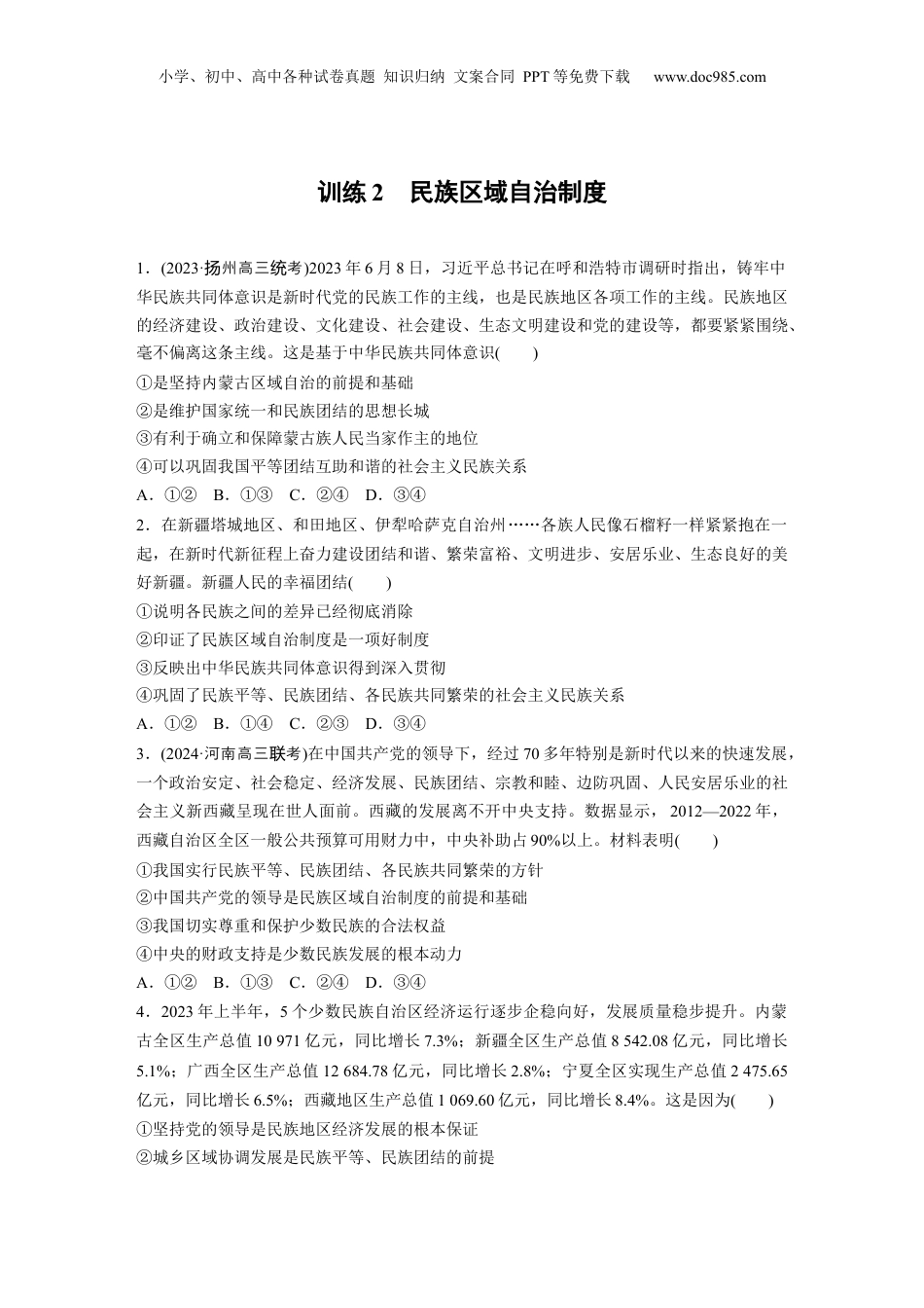 小学、初中、高中各种试卷真题知识归纳文案合同PPT等免费下载www.doc985.com训练2民族区域自治制度1.(2023·州高三考扬统)2023年6月8日,习近平总书记在呼和浩特市调研时指出,铸牢中华民族共同体意识是新时代党的民族工作的主线,也是民族地区各项工作的主线。民族地区的经济建设、政治建设、文化建设、社会建设、生态文明建设和党的建设等,都要紧紧围绕、毫不偏离这条主线。这是基于中华民族共同体意识()①是坚持内蒙古区域自治的前提和基础②是维护国家统一和民族团结的思想长城③有利于确立和保障蒙古族人民当家作主的地位④可以巩固我国平等团结互助和谐的社会主义民族关系A.①②B.①③C.②④D.③④2.在新疆塔城地区、和田地区、伊犁哈萨克自治州……各族人民像石榴籽一样紧紧抱在一起,在新时代新征程上奋力建设团结和谐、繁荣富裕、文明进步、安居乐业、生态良好的美好新疆。新疆人民的幸福团结()①说明各民族之间的差异已经彻底消除②印证了民族区域自治制度是一项好制度③反映出中华民族共同体意识得到深入贯彻④巩固了民族平等、民族团结、各民族共同繁荣的社会主义民族关系A.①②B.①④C.②③D.③④3.(2024·河南高三考联)在中国共产党的领导下,经过70多年特别是新时代以来的快速发展,一个政治安定、社会稳定、经济发展、民族团结、宗教和睦、边防巩固、人民安居乐业的社会主义新西藏呈现在世人面前。西藏的发展离不开中央支持。数据显示,2012—2022年,西藏自治区全区一般公共预算可用财力中,中央补助占90%以上。材料表明()①我国实行民族平等、民族团结、各民族共同繁荣的方针②中国共产党的领导是民族区域自治制度的前提和基础③我国切实尊重和保护少数民族的合法权益④中央的财政支持是少数民族发展的根本动力A.①②B.①③C.②④D.③④4.2023年上半年,5个少数民族自治区经济运行逐步企稳向好,发展质量稳步提升。内蒙古全区生产总值10971亿元,同比增长7.3%;新疆全区生产总值8542.08亿元,同比增长5.1%;广西全区生产总值12684.78亿元,同比增长2.8%;宁夏全区实现生产总值2475.65亿元,同比增长6.5%;西藏地区生产总值1069.60亿元,同比增长8.4%。这是因为()①坚持党的领导是民族地区经济发展的根本保证②城乡区域协调发展是民族平等、民族团结的前提小学、初中、高中各种试卷真题知识归纳文案合同PPT等免费下载www.doc985.com③民族地区的经济社会发展需要因地制宜采取措施④民族地区繁荣发展状况取决于党和国家的政策优惠度A.①③B.①④C.②③D.②④5.(2023·广高三考东联)近年来,贵州省黔西南布依族苗族自治州望谟县新屯镇新屯村立足自然资源优势,抢抓机遇,大力推动农业产业、民族文化同乡村旅游的深度融合,让旅游吹起“民族风”。并利用短视频平台,加大民族特色文化、农特产品的宣传攻势,采取线上线下双向引流,吸引各地游客前来实地打卡。新屯村的发展说明()①享有自治权是民族地区经济繁荣的关键因素②要充分利用民族地区的特色文化和资源禀赋③要因地制宜地推动民族地区的经济社会发展④平等团结互助和谐的社会主义民族关系正在形成A.①③B.①④C.②③D.②④6.新疆工作,始终是习近平总书记牵挂的大事。2023年8月26日,习近平总书记对做好新疆各项工作作出重要部署。新疆工作在党和国家工作全局中具有特殊重要的地位,事关强国建设、民族复兴大局。社会稳定和长治久安是新疆工作的总目标,要抓住工作总目标,把依法治疆、团结稳疆、文化润疆、富民兴疆、长期建疆各项工作做深做细做实。这启示我们,抓好新疆工作要()①以铸牢中华民族共同体意识为主线,不断巩固各民族大团结②统筹发挥人大、政府和法院等自治机关的综合治理作用③贯彻习近平法治思想,确保各项工作在法制轨道上运行④完整准确贯彻新时代党的治疆方略,夯实党的执政根基A.①②B.①④C.②③D.③④7.内蒙古是我国最早成立的省级少数民族自治区,具有民族团结的光荣传统,书写过“三千孤儿入内蒙”“齐心协力建包钢”等历史佳话,一直被誉为“模范自治区”。在这里,各民族文化相互激荡、交融,各民族之间尊重差异、包容多样、相互欣赏和学习,大...