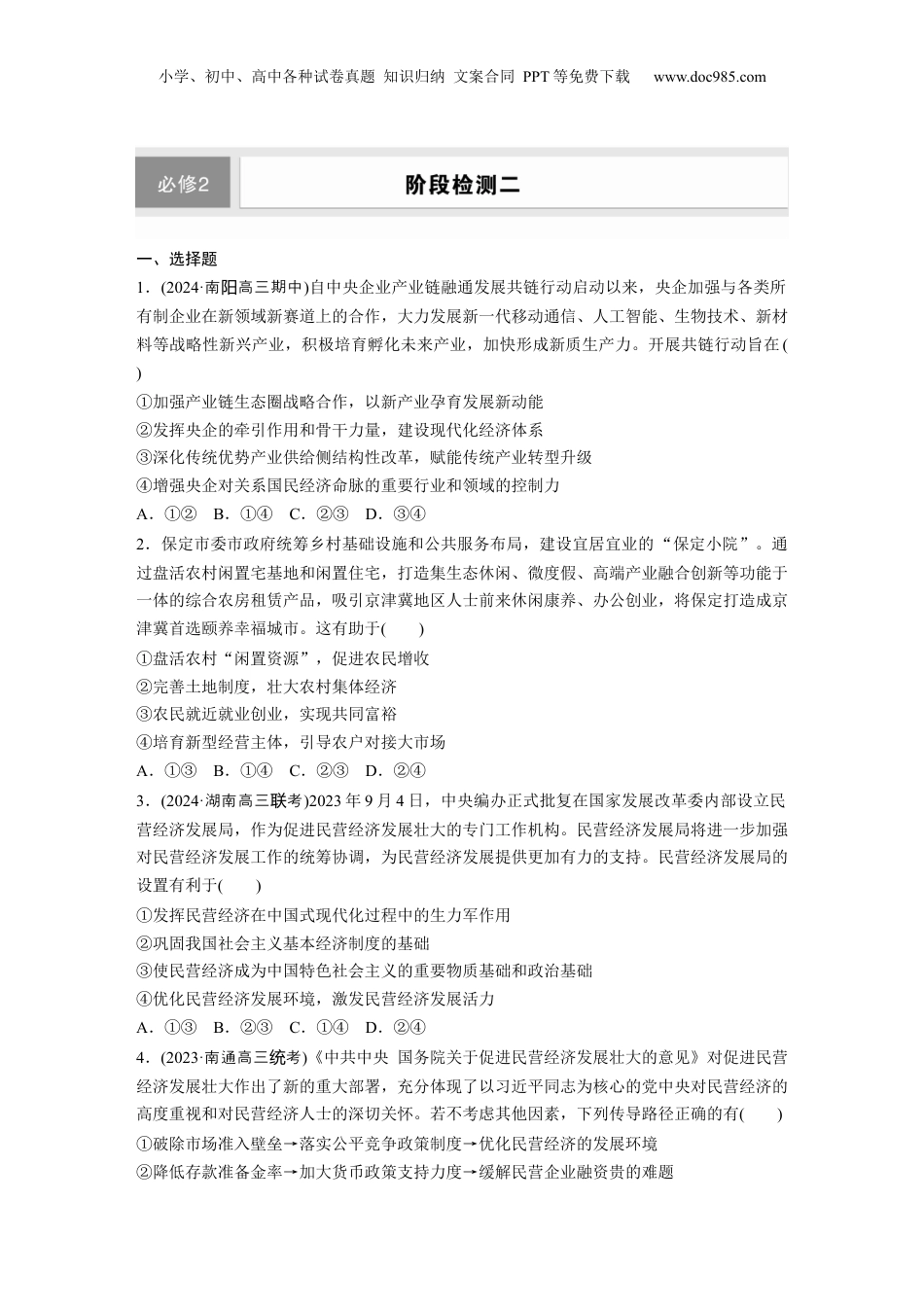 小学、初中、高中各种试卷真题知识归纳文案合同PPT等免费下载www.doc985.com一、选择题1.(2024·南高三期中阳)自中央企业产业链融通发展共链行动启动以来,央企加强与各类所有制企业在新领域新赛道上的合作,大力发展新一代移动通信、人工智能、生物技术、新材料等战略性新兴产业,积极培育孵化未来产业,加快形成新质生产力。开展共链行动旨在()①加强产业链生态圈战略合作,以新产业孕育发展新动能②发挥央企的牵引作用和骨干力量,建设现代化经济体系③深化传统优势产业供给侧结构性改革,赋能传统产业转型升级④增强央企对关系国民经济命脉的重要行业和领域的控制力A.①②B.①④C.②③D.③④2.保定市委市政府统筹乡村基础设施和公共服务布局,建设宜居宜业的“保定小院”。通过盘活农村闲置宅基地和闲置住宅,打造集生态休闲、微度假、高端产业融合创新等功能于一体的综合农房租赁产品,吸引京津冀地区人士前来休闲康养、办公创业,将保定打造成京津冀首选颐养幸福城市。这有助于()①盘活农村“闲置资源”,促进农民增收②完善土地制度,壮大农村集体经济③农民就近就业创业,实现共同富裕④培育新型经营主体,引导农户对接大市场A.①③B.①④C.②③D.②④3.(2024·湖南高三考联)2023年9月4日,中央编办正式批复在国家发展改革委内部设立民营经济发展局,作为促进民营经济发展壮大的专门工作机构。民营经济发展局将进一步加强对民营经济发展工作的统筹协调,为民营经济发展提供更加有力的支持。民营经济发展局的设置有利于()①发挥民营经济在中国式现代化过程中的生力军作用②巩固我国社会主义基本经济制度的基础③使民营经济成为中国特色社会主义的重要物质基础和政治基础④优化民营经济发展环境,激发民营经济发展活力A.①③B.②③C.①④D.②④4.(2023·南通高三考统)《中共中央国务院关于促进民营经济发展壮大的意见》对促进民营经济发展壮大作出了新的重大部署,充分体现了以习近平同志为核心的党中央对民营经济的高度重视和对民营经济人士的深切关怀。若不考虑其他因素,下列传导路径正确的有()①破除市场准入壁垒→落实公平竞争政策制度→优化民营经济的发展环境②降低存款准备金率→加大货币政策支持力度→缓解民营企业融资贵的难题小学、初中、高中各种试卷真题知识归纳文案合同PPT等免费下载www.doc985.com③完善知识产权保护体系→加大创新保护力度→强化民营经济发展法治保障④全面构建亲清政商关系→保障社会公平正义→促进民营经济人士健康成长A.①②B.①③C.②④D.③④5.(2023·河南高三考联)作为一种新兴的传播形式,网络直播原本是一种有趣味的互动方式,但在一些主播甚至平台的操作下,却变成了一种低俗甚至有害的竞争手段。比如,为了吸引流量、追逐利益,一些直播平台存在自残斗狠、走极端等内容。国家网信办启动2023年“清朗”系列专项行动,整治直播环节问题。这表明()①充分发挥市场在资源配置中的决定性作用②政府履行经济职能,加强市场监管③政府通过科学宏观调控消除市场缺陷④市场调节具有局限性,存在自发性弊端A.①②B.①③C.②④D.③④6.(2024·高三考青岛统)2023年我国稳增长政策持续发力:下调存款准备金率、继续深化利率市场化改革、加大支农支小再贷款支持力度、落实科技创新专项再贷款政策……一系列政策持续改善和稳定了市场预期。若不考虑其他因素,以下传导正确的是()①下调存款准备金率→增加货币供应量→提振市场信心②深化利率市场化改革→稳定存贷款利率→提高金融企业经济效益③增加支农再贷款额度→扩大涉农信贷供给→缓解农业经营主体融资难④实施科技创新专项贷款→助力科创企业直接融资→激活科创企业内生动力A.①②B.①③C.②④D.③④7.国务院印发的《“十四五”国家应急体系规划》(以下简称《规划》)对“十四五”时期安全生产、防灾减灾救灾等工作进行全面部署,确立了“到2025年,形成统一指挥、专常兼备、反应灵敏、上下联动的中国特色应急管理体制,到2035年,全面实现依法应急、科学应急、智慧应急,形成共建共治共享的应急管理新格局”的目标。《规划》的出台()①促进我国应急管理体系...