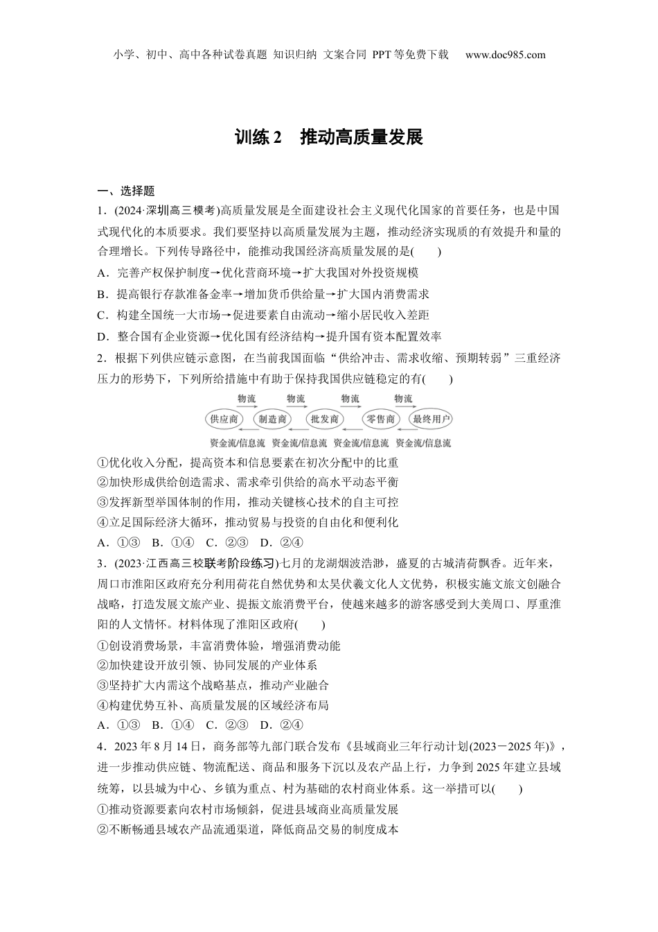 小学、初中、高中各种试卷真题知识归纳文案合同PPT等免费下载www.doc985.com训练2推动高质量发展一、选择题1.(2024·深高三模考圳)高质量发展是全面建设社会主义现代化国家的首要任务,也是中国式现代化的本质要求。我们要坚持以高质量发展为主题,推动经济实现质的有效提升和量的合理增长。下列传导路径中,能推动我国经济高质量发展的是()A.完善产权保护制度→优化营商环境→扩大我国对外投资规模B.提高银行存款准备金率→增加货币供给量→扩大国内消费需求C.构建全国统一大市场→促进要素自由流动→缩小居民收入差距D.整合国有企业资源→优化国有经济结构→提升国有资本配置效率2.根据下列供应链示意图,在当前我国面临“供给冲击、需求收缩、预期转弱”三重经济压力的形势下,下列所给措施中有助于保持我国供应链稳定的有()①优化收入分配,提高资本和信息要素在初次分配中的比重②加快形成供给创造需求、需求牵引供给的高水平动态平衡③发挥新型举国体制的作用,推动关键核心技术的自主可控④立足国际经济大循环,推动贸易与投资的自由化和便利化A.①③B.①④C.②③D.②④3.(2023·江西高三校考段联阶练习)七月的龙湖烟波浩渺,盛夏的古城清荷飘香。近年来,周口市淮阳区政府充分利用荷花自然优势和太昊伏羲文化人文优势,积极实施文旅文创融合战略,打造发展文旅产业、提振文旅消费平台,使越来越多的游客感受到大美周口、厚重淮阳的人文情怀。材料体现了淮阳区政府()①创设消费场景,丰富消费体验,增强消费动能②加快建设开放引领、协同发展的产业体系③坚持扩大内需这个战略基点,推动产业融合④构建优势互补、高质量发展的区域经济布局A.①③B.①④C.②③D.②④4.2023年8月14日,商务部等九部门联合发布《县域商业三年行动计划(2023-2025年)》,进一步推动供应链、物流配送、商品和服务下沉以及农产品上行,力争到2025年建立县域统筹,以县城为中心、乡镇为重点、村为基础的农村商业体系。这一举措可以()①推动资源要素向农村市场倾斜,促进县域商业高质量发展②不断畅通县域农产品流通渠道,降低商品交易的制度成本小学、初中、高中各种试卷真题知识归纳文案合同PPT等免费下载www.doc985.com③完善县域商业网络设施和业态,提高乡镇商业的集聚效应④打造商业新业态、新模式,加快企业转型升级和产业融合A.①②B.①③C.②④D.③④5.(2024·高三期中菏泽)第六届中国国际进口博览会于2023年11月5日至10日在上海举办。来自100多个国家和地区的3400多家企业参展,规模创历史新高。在中国进入新发展阶段的背景下,进博会将从供给侧和需求侧共同发力,在畅通国内大循环、链接国内国际双循环方面作用明显,不断满足中国市场所需,满足人民对美好生活的需要。进博会对供给侧的作用路径是()①引进先进技术、促成贸易投资对接②签约更多的企业进入中国市场③提升消费者的福利水平④倒逼国内相关产业提升市场竞争力⑤生产出更先进产品和提供更高质量服务⑥推动国内产业转型升级⑦提升产业链供应链韧性和安全水平A.①→⑥→⑤→③B.②→④→⑦→③C.①→④→⑥→⑦D.②→⑦→④→⑤6.中共中央、国务院印发的《数字中国建设整体布局规划》提出,培育壮大数字经济核心产业,打造具有国际竞争力的数字产业集群。推动数字技术和实体经济深度融合,在农业、工业、金融、教育、医疗、交通、能源等重点领域,加快数字技术创新应用。发展数字技术能够()①厚植发展优势,构建安全高效的开放格局②促进经济均衡发展,增强发展的整体性③赋能传统企业转型升级,实现高质量发展④推动供给侧结构性改革,促进协调发展A.①②B.③④C.①④D.②③7.(2023·福建高考)2022年,福建实施稳经济一揽子政策和接续措施,夯实筑牢工业“压舱石”,消费成逆势增长“强引擎”,投资“马车”蹄疾步稳,实现了经济发展质的有效提升和量的合理增长,全年地区生产总值首次跨过5万亿元大关,位居全国第8。要继续保持经济提质增量的良好发展势头,应该()①深化放管服改革→优化营商环境→释放市场主体活力→推动经济持续健康发展②加大财政对居民消费的补贴力度→激发消费潜力→升级...