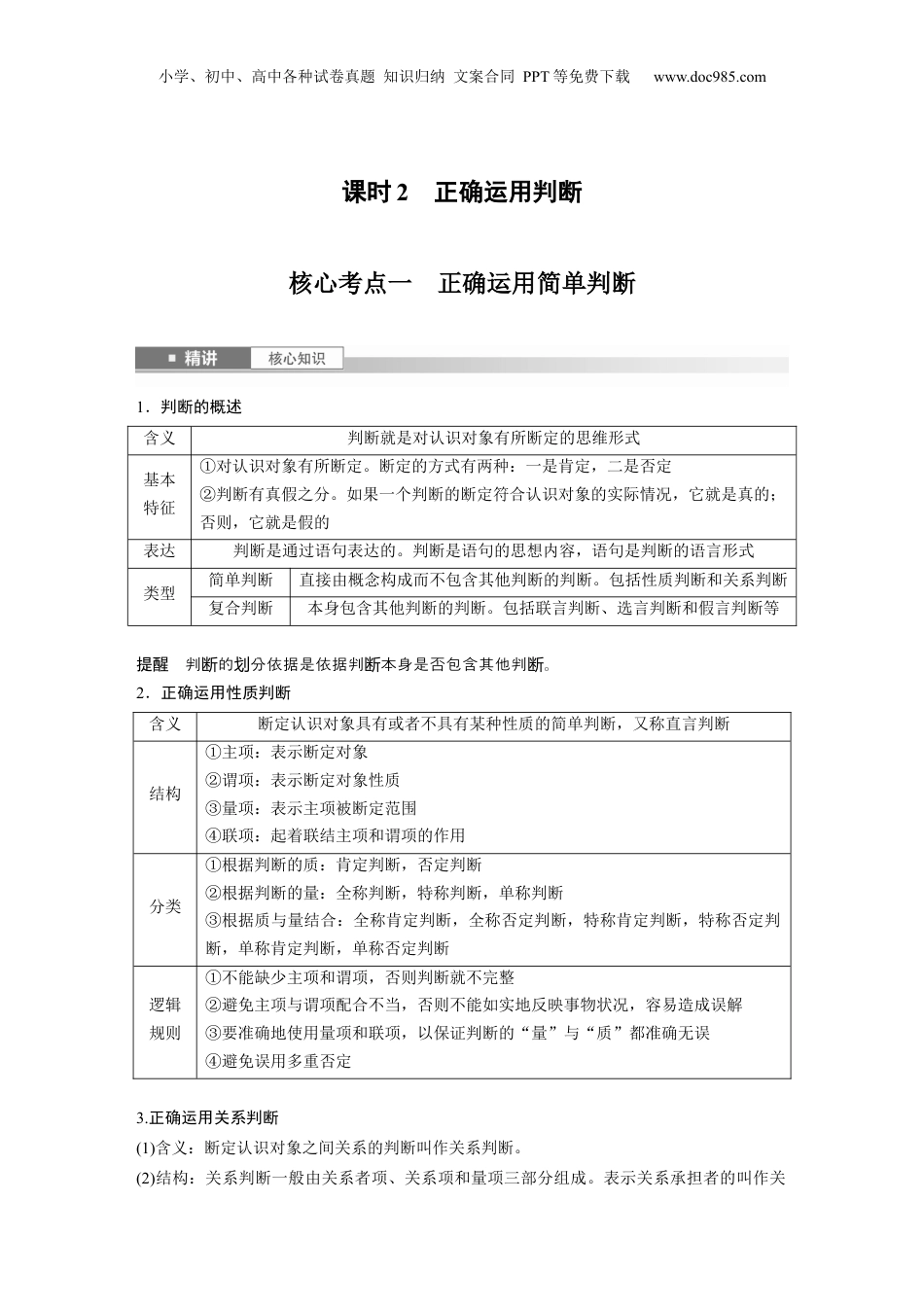 小学、初中、高中各种试卷真题知识归纳文案合同PPT等免费下载www.doc985.com课时2正确运用判断核心考点一正确运用简单判断1.判断的概述含义判断就是对认识对象有所断定的思维形式基本特征①对认识对象有所断定。断定的方式有两种:一是肯定,二是否定②判断有真假之分。如果一个判断的断定符合认识对象的实际情况,它就是真的;否则,它就是假的表达判断是通过语句表达的。判断是语句的思想内容,语句是判断的语言形式类型简单判断直接由概念构成而不包含其他判断的判断。包括性质判断和关系判断复合判断本身包含其他判断的判断。包括联言判断、选言判断和假言判断等提醒判的分依据是依据判本身是否包含其他判。断划断断2.正确运用性质判断含义断定认识对象具有或者不具有某种性质的简单判断,又称直言判断结构①主项:表示断定对象②谓项:表示断定对象性质③量项:表示主项被断定范围④联项:起着联结主项和谓项的作用分类①根据判断的质:肯定判断,否定判断②根据判断的量:全称判断,特称判断,单称判断③根据质与量结合:全称肯定判断,全称否定判断,特称肯定判断,特称否定判断,单称肯定判断,单称否定判断逻辑规则①不能缺少主项和谓项,否则判断就不完整②避免主项与谓项配合不当,否则不能如实地反映事物状况,容易造成误解③要准确地使用量项和联项,以保证判断的“量”与“质”都准确无误④避免误用多重否定3.正确运用关系判断(1)含义:断定认识对象之间关系的判断叫作关系判断。(2)结构:关系判断一般由关系者项、关系项和量项三部分组成。表示关系承担者的叫作关小学、初中、高中各种试卷真题知识归纳文案合同PPT等免费下载www.doc985.com系者项。表示关系者之间关系的叫作关系项。表示关系者项范围的叫作量项。(3)分类:依据“关系的性质”对称性关系对称关系“同学”“同事”“朋友”、两者的距离、“相同”“相等”“交叉”等反对称关系“大于”“小于”“重于”“少于”“侵略”“剥削”“在……之上”“在……之下”“在……之前”等非对称关系“佩服”“认识”“尊重”“喜欢”“赞美”“信任”“志愿”“帮助”等传递性关系传递关系“比……长(大、小、多、少、重、轻)”“小于”“大于”“在……之前”“在……之后”“早于”“晚于”等反传递关系“父亲”“母亲”“祖父”“祖母”“儿子”“孙子”“矛盾关系”非传递关系“喜欢”“赞同”“信任”“朋友”“同事”“同学”“交叉关系”“反对关系”提醒使用系判常的:混淆系的不同性,把非系作系,关断见逻辑错误关质对称关当对称关把非系作系。传递关当传递关1.判就是符合象情的判。断认识对实际况断纠正:________________________________________________________________________2.句是判的思想容,判是句的言形式。语断内断语语纠正:________________________________________________________________________3.依据判本身是否包含其他判,判分性判和系判。断断断为质断关断纠正:________________________________________________________________________4.性判比系判更重要。质断关断纠正:________________________________________________________________________考向一性质判断典例1(2023·六水一模盘)某校高三老师组织学生对本班的情况进行调查研究,某同学进行小学、初中、高中各种试卷真题知识归纳文案合同PPT等免费下载www.doc985.com调查研究后,运用性质判断及其周延的知识对实例进行了分析。下列选项中分析正确的是()①所有同学都是勤奋学习的——全称肯定判断,主项周延,谓项不周延②有些同学是共青团员——特称肯定判断,主项不周延,谓项周延③张三是足球运动员——单称肯定判断,主项周延,谓项不周延④小明不是学生会成员——特称否定判断,主项不周延,谓项周延A.①②B.①③C.②④D.③④考向二关系判断典例2(2023·南通考三模统)事物具有多种多样的关系。对下表中各类关系的判断正确的是()①杨柳认识张华反对称关系②中国和法国是全面战略伙伴关系对称关系③中国人口多于美国,美国人口多于韩国反传递关系④李雷和韩梅梅是同学,韩梅梅和刘芳是同学非传递关系A...