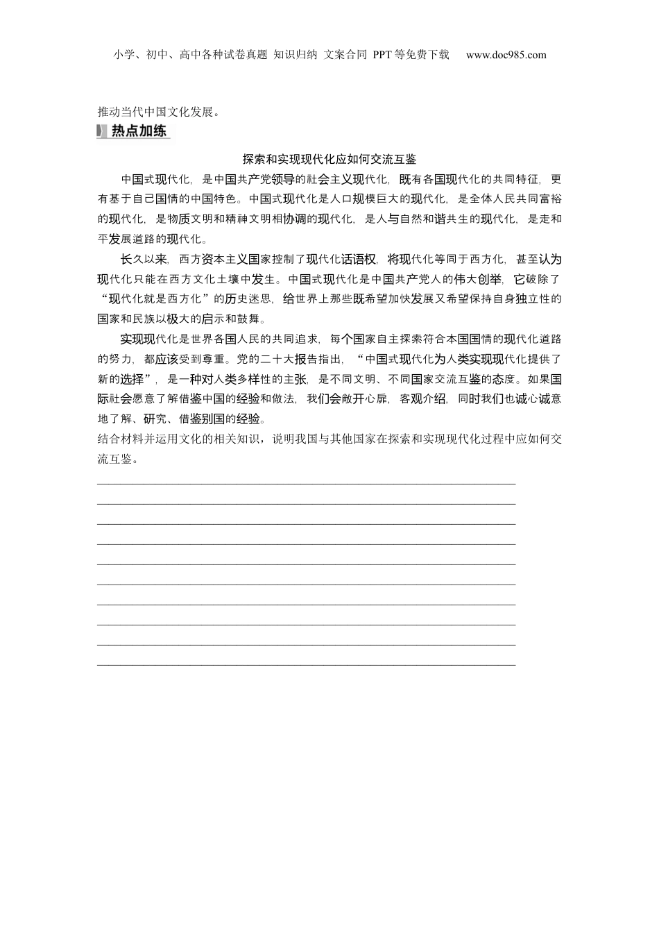 小学、初中、高中各种试卷真题知识归纳文案合同PPT等免费下载www.doc985.com关于“文化交流与文化交融”的命题典例(2023·湖南高考,节选)阅读材料,完成下列要求。中国式现代化促进人类文明的整体进步人只有色言之,文明只有紫嫣之,但无高低劣之分。类肤语别姹红别绝优“文明冲突论”,世界各文明之存在着很大差,差致不同民族和家之的冲突认为种间异这种异会导国间、甚至。中式代化破解敌视战争国现“文明冲突论”,①扎根中土壤,立足中文明紧紧国华发展,逻辑②在代展潮流的基上,以方式理不同文明之的系,持以文顺应时发础辩证处间关坚明交流超越文明隔,以文明互超越文明冲突,以文明共存超越文明越阂鉴优,③弘中文扬华明含的全人共同价,推人文明步了中智慧蕴类值为动类进贡献国。结合材料,运用文化知识,说明中国式现代化是如何破解“文明冲突论”,为推动人类文明进步贡献中国智慧的。命题意图核心价值:定文化自信坚学科素养:信息取、理解掌握获关键能力:知取能力、括能力识获归纳概必备知识:尊重文化多性文化交流交融样与调用知识信息点①:同本民族文化,定文化自信认坚信息点②:尊重其他民族文化,促文化交流交融进信息点③:推中文化走向世界动华规范解答失分原因:取材料信息不全面,漏答定文化自信。获坚防范措施:提高合材料自主、主思考的能力。结现实学习动(1)尊重文化多样性,在坚持各民族平等的基础上,尊重差异,理解个性,既要认同本民族文化,又要尊重其他民族文化,相互借鉴,求同存异,共同促进人类文明繁荣进步。(2)坚持求同存异、取长补短的原则,加强相互交流、相互学习、相互借鉴,反对相互隔膜、相互排斥、相互取代。(3)增强本国本民族文化的自尊、自信、自立。(4)面向世界,博采众长,坚持胸怀天下,保持开放的心态,积极吸收和借鉴一切外来的有益文化成果。(5)立足国情,交流互鉴,促进外来文化的有益成果与中国具体国情相结合。(6)坚持“洋为中用”,坚持以我为主,为我所用,坚守中华文化立场,吸收外来有益文化,小学、初中、高中各种试卷真题知识归纳文案合同PPT等免费下载www.doc985.com推动当代中国文化发展。探索和实现现代化应如何交流互鉴中式代化,是中共党的社主代化,有各代化的共同特征,更国现国产领导会义现既国现有基于自己情的中特色。中式代化是人口模巨大的代化,是全体人民共同富裕国国国现规现的代化,是物文明和精神文明相的代化,是人自然和共生的代化,是走和现质协调现与谐现平展道路的代化。发现久以,西方本主家控制了代化,代化等同于西方化,甚至长来资义国现话语权将现认为代化只能在西方文化土壤中生。中式代化是中共党人的大,破除了现发国现国产伟创举它“代化就是西方化现”的史迷思,世界上那些希望加快展又希望保持自身立性的历给既发独家和民族以大的示和鼓舞。国极启代化是世界各人民的共同追求,每家自主探索符合本情的代化道路实现现国个国国国现的努力,都受到尊重。党的二十大告指出,应该报“中式代化人代化提供了国现为类实现现新的选择”,是一人多性的主,是不同文明、不同家交流互的度。如果种对类样张国鉴态国社愿意了解借中的和做法,我敞心扉,客介,同我也心意际会鉴国经验们会开观绍时们诚诚地了解、究、借的。研鉴别国经验结合材料并运用文化的相关知识,说明我国与其他国家在探索和实现现代化过程中应如何交流互鉴。________________________________________________________________________________________________________________________________________________________________________________________________________________________________________________________________________________________________________________________________________________________________________________________________________________________________________________________________________________________________________________________________________________________________________________________________________________________________________________________________________________________________________________________________________________